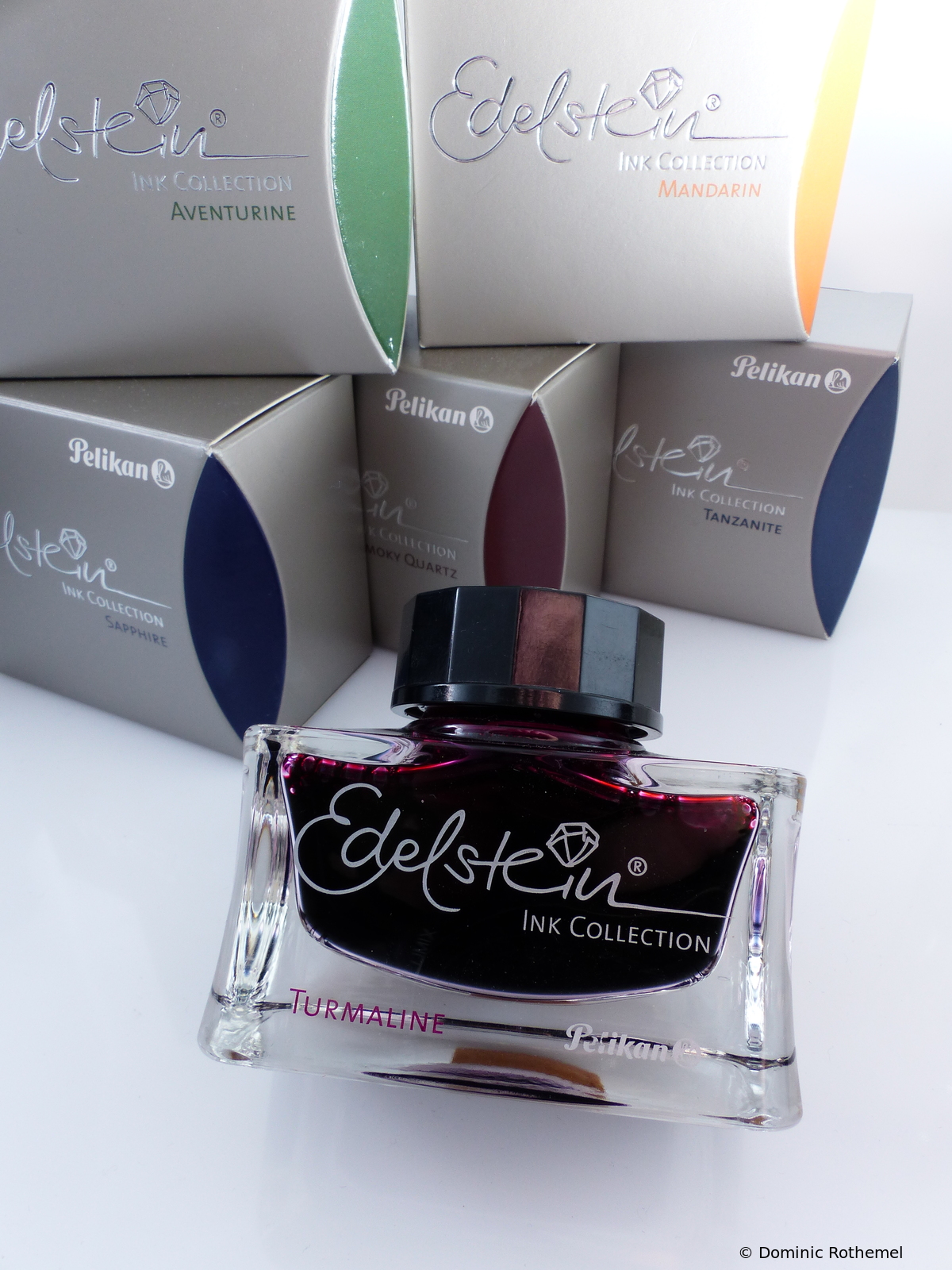 Edelstein inks are basically available in a 50ml crystal glass bottle, most of the colors since 2014 also as a set of 5 large-size cartridges (GTP / 6) in an embossed metal case.