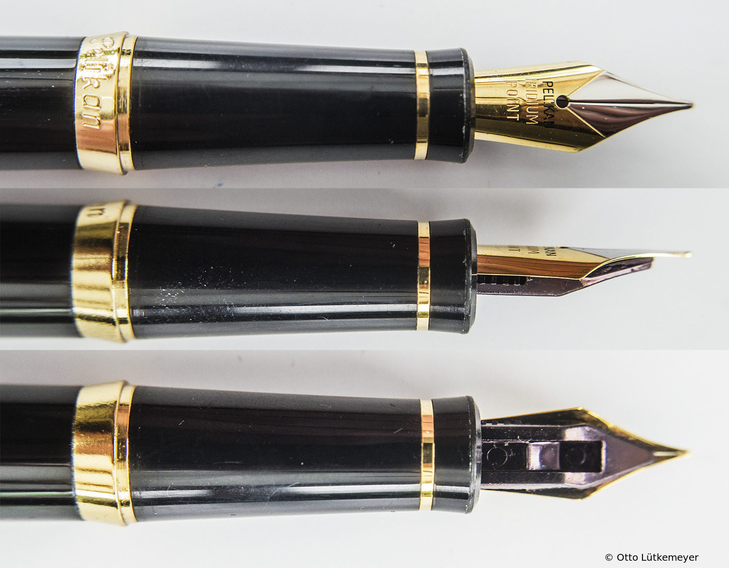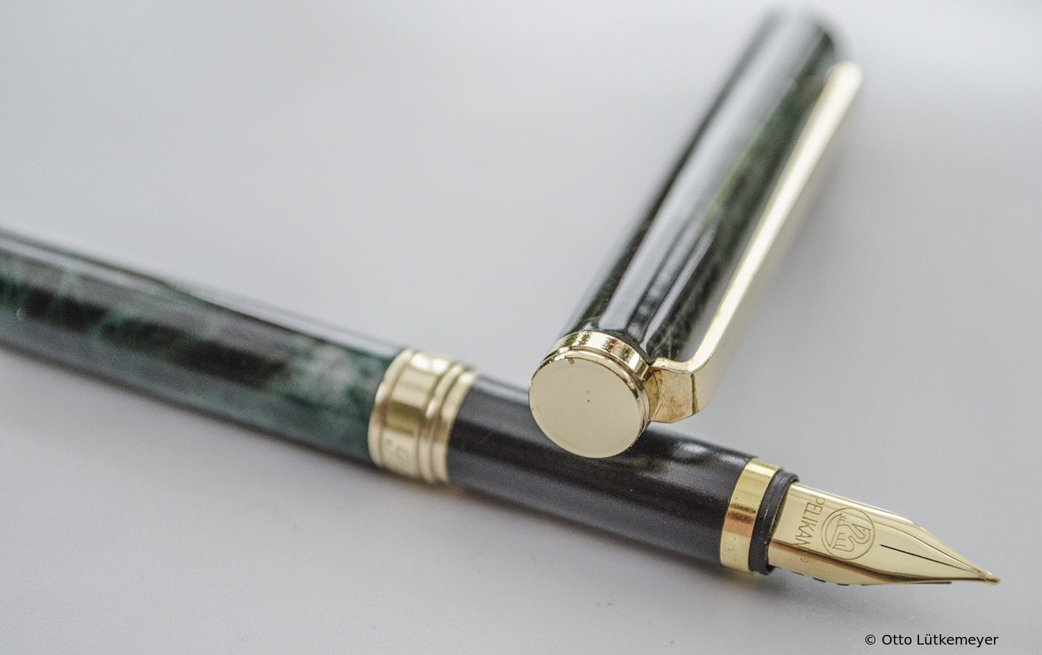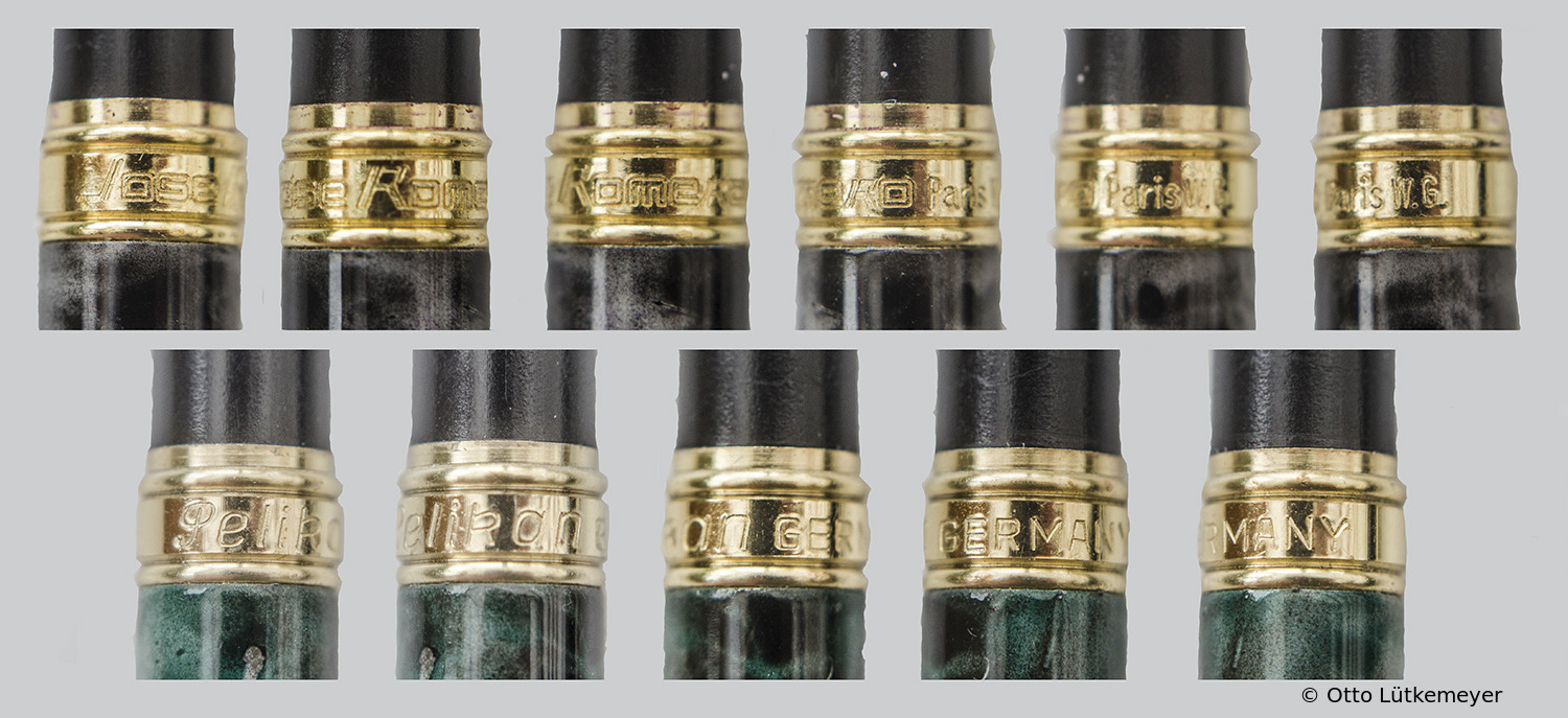 • The green marbled pen has a gold-plated steel nib engraved with '© Pelikan' and Pelikan logo, while in all the other pens the gilded steel nib is engraved with 'IRIDIUM POINT W. GERMANY' (in some cases without the W.).