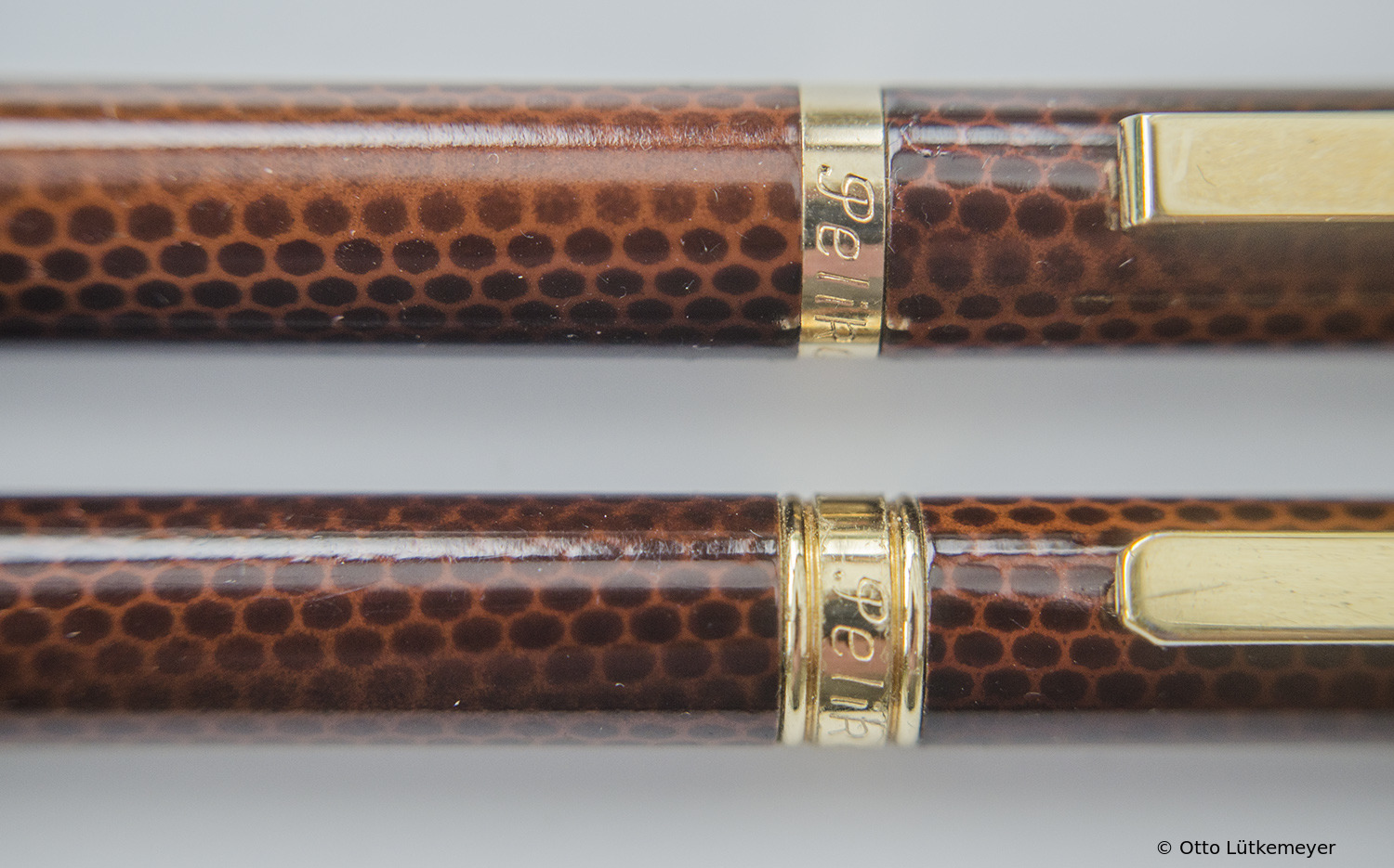• The pen with the red-brown honeycomb pattern bears on its cap top an imprint of the Pelikan logo - in all other pens in this series, this logo is missing.