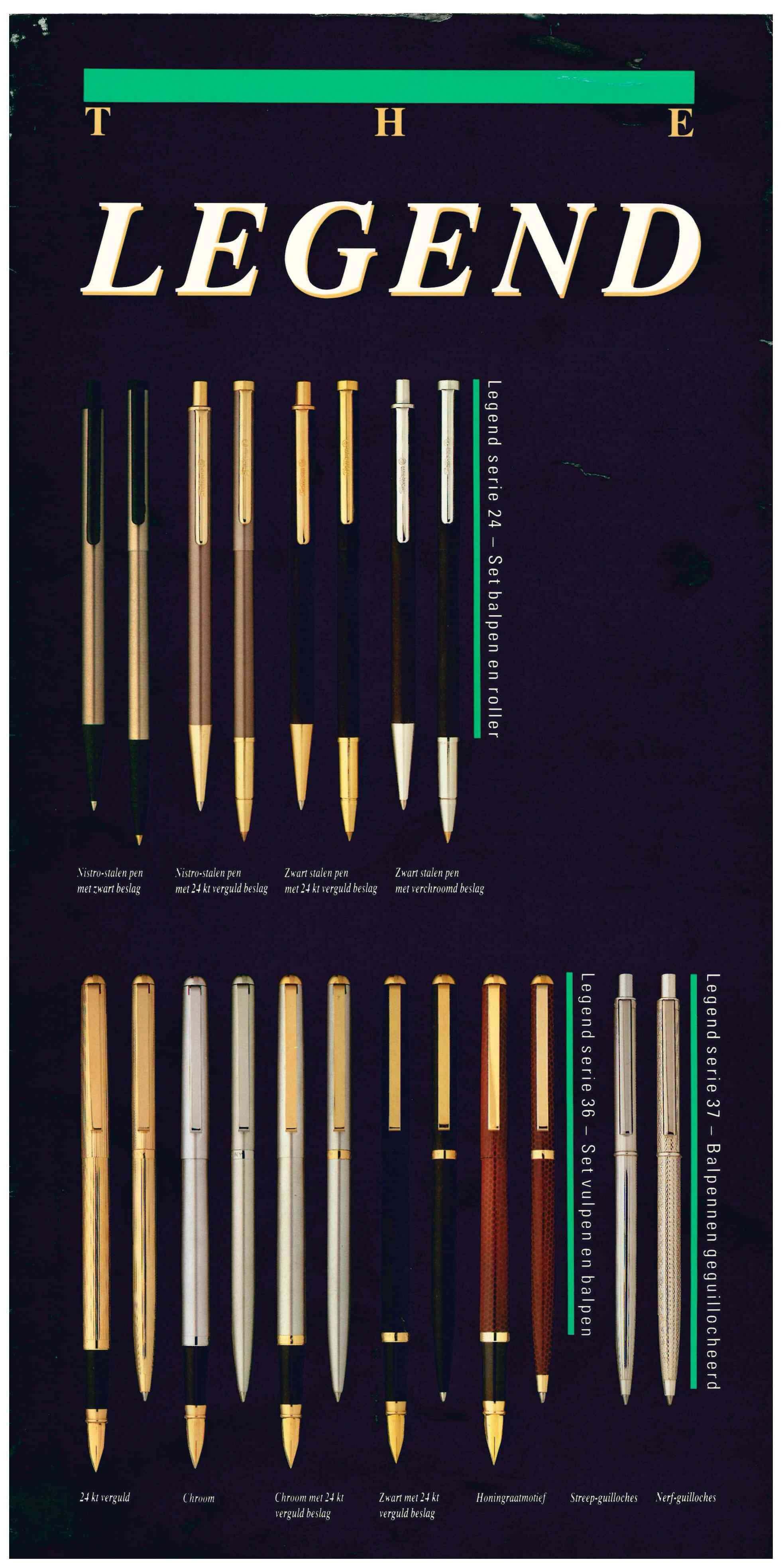 Three LEGEND series were launched: the series 24 each comprised a ballpoint pen and a rollerball in four different versions. The series 37 included two pens. Only the Series 36 contained, besides a twist ballpoint pen, a fountain pen. All writing instruments consisted of a slim metal barrel in five different designs. The fountain pens were cartridge fillers.