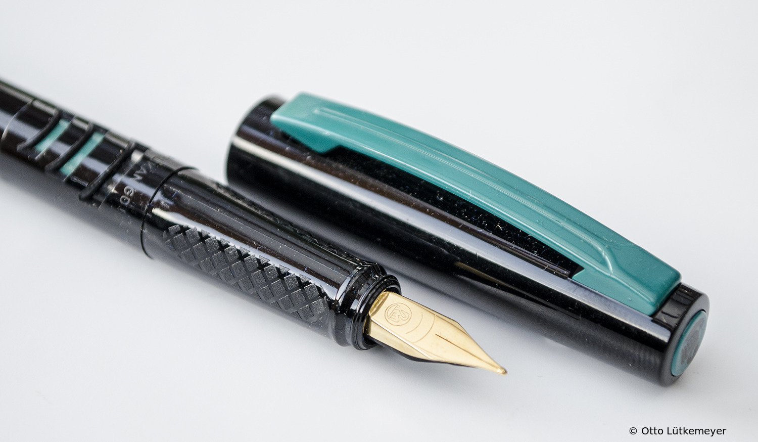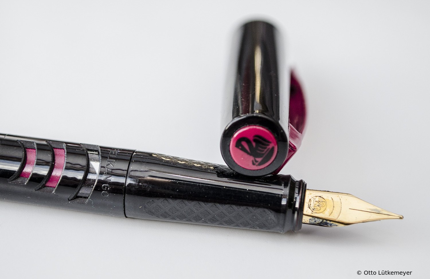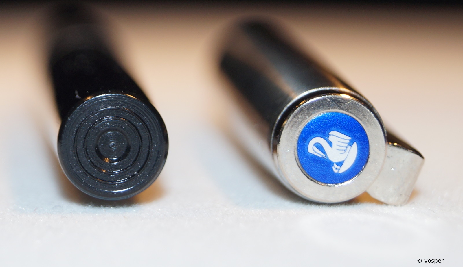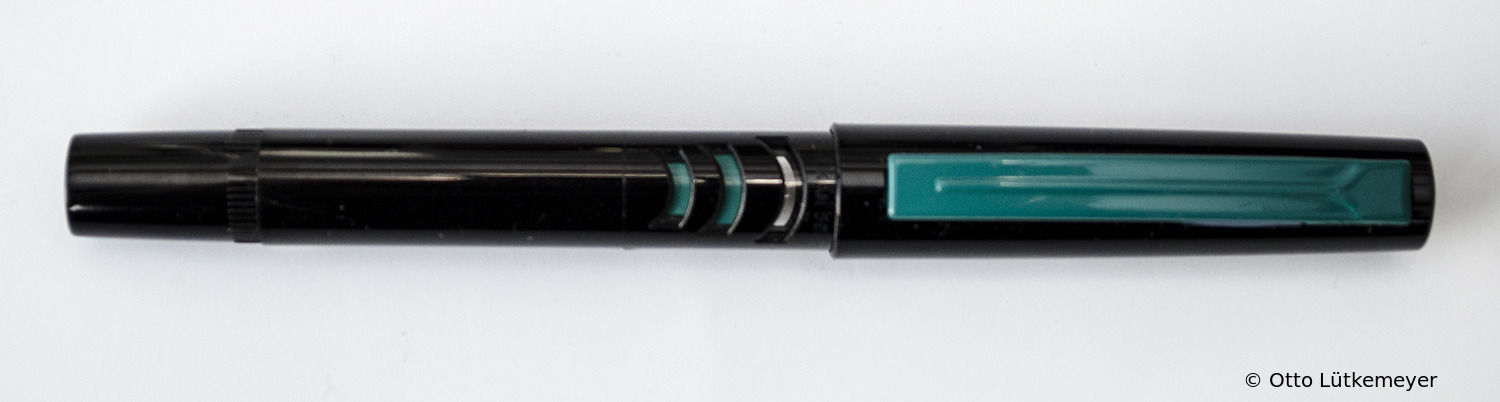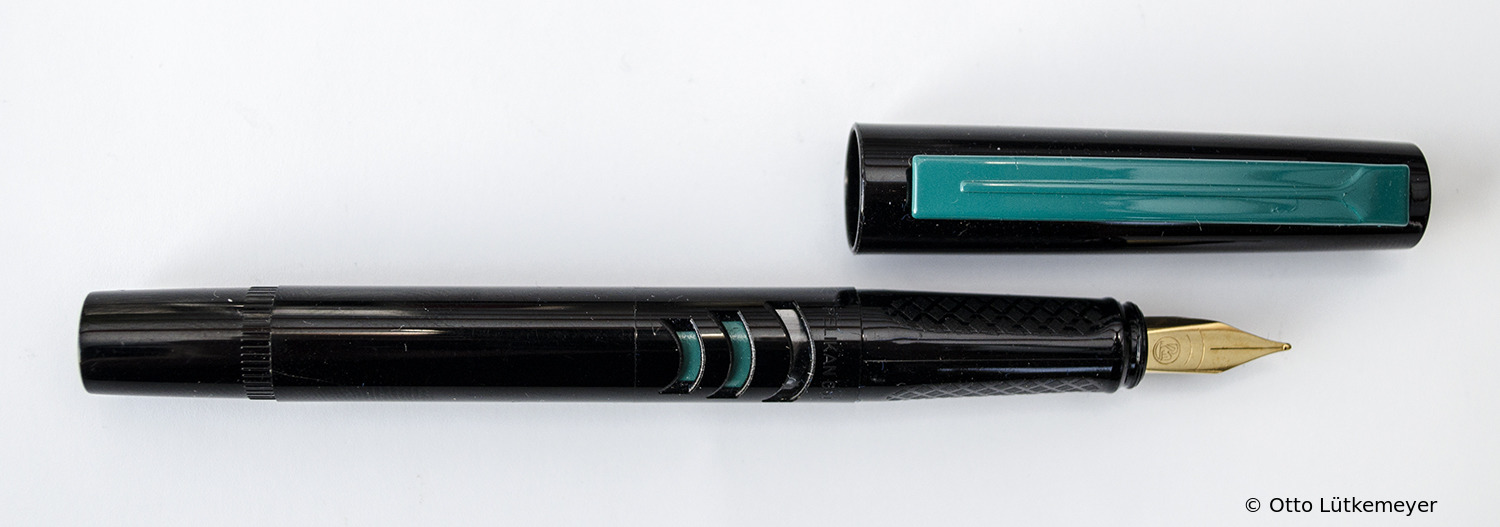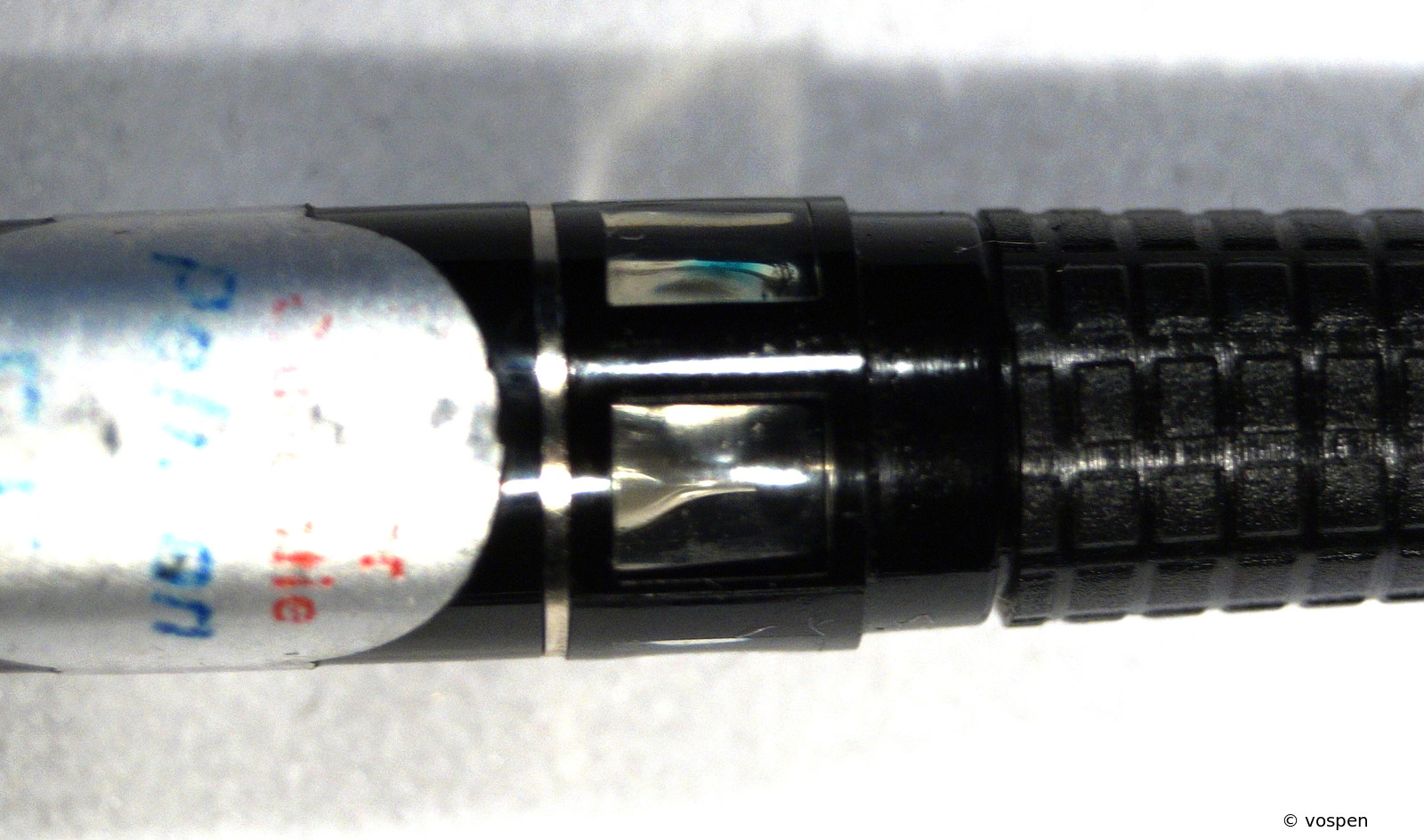 A conspicuous feature of these two fountain pens are 5 ink windows in the barrel that indicate the level of the inserted ink cartridges.