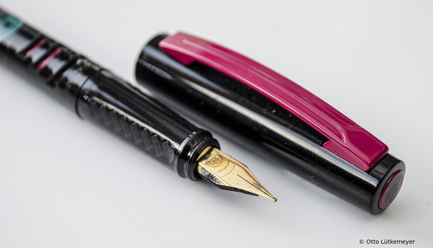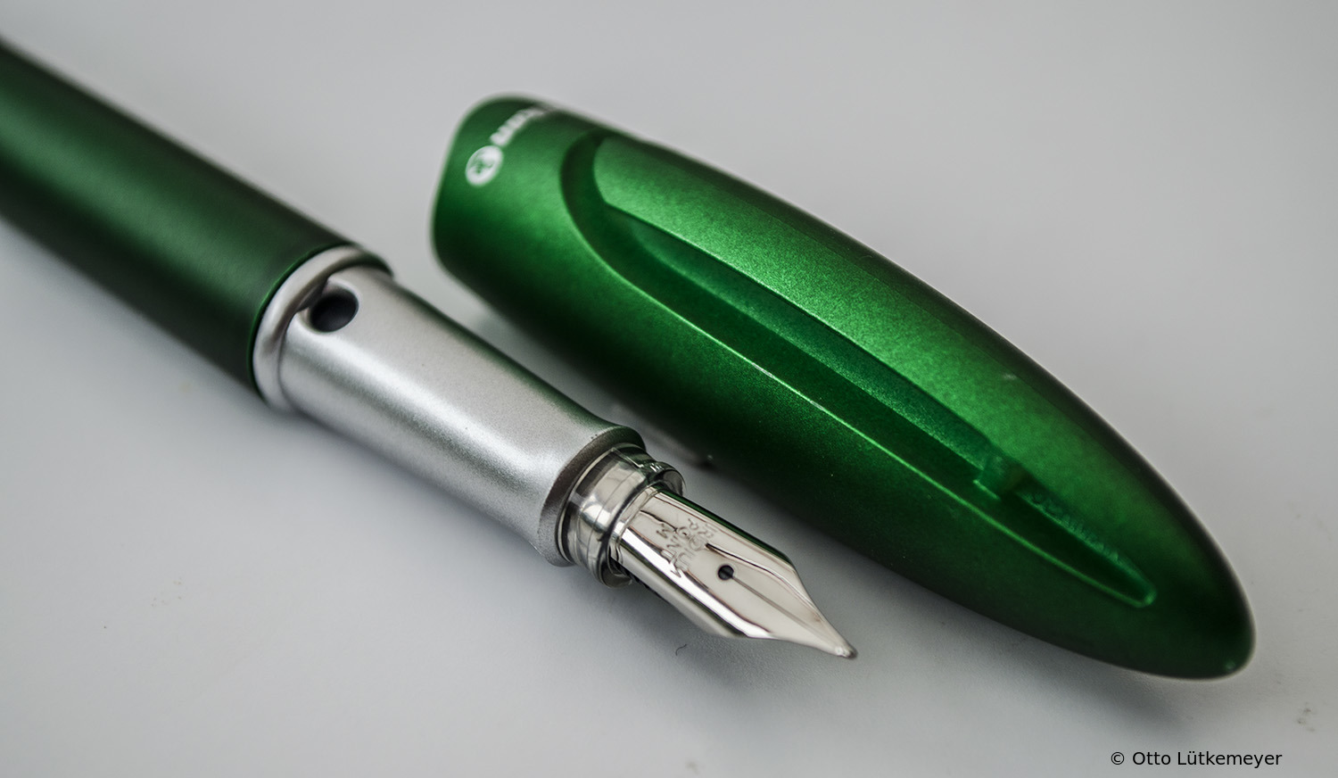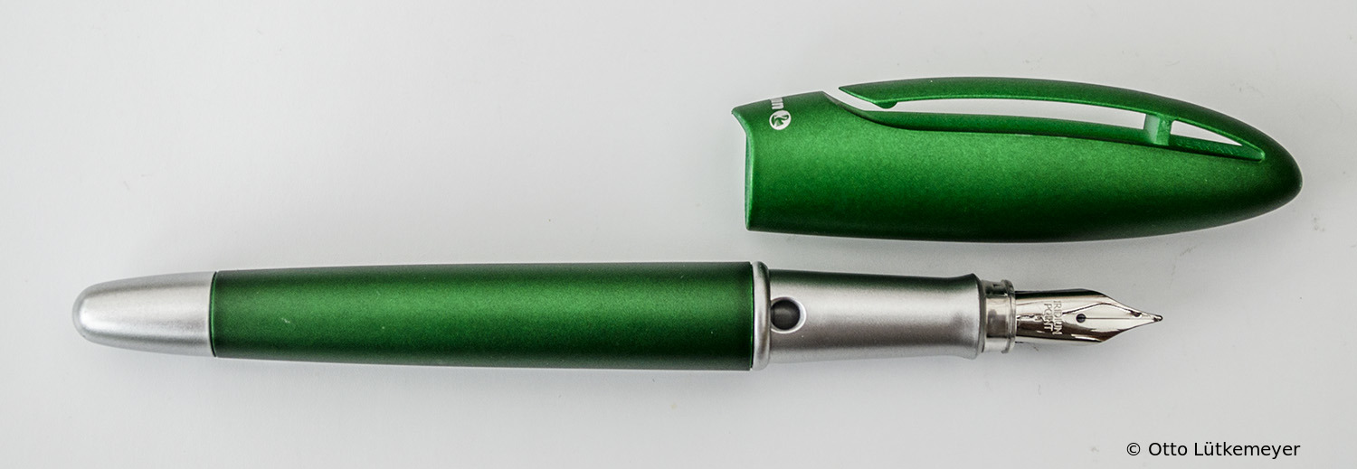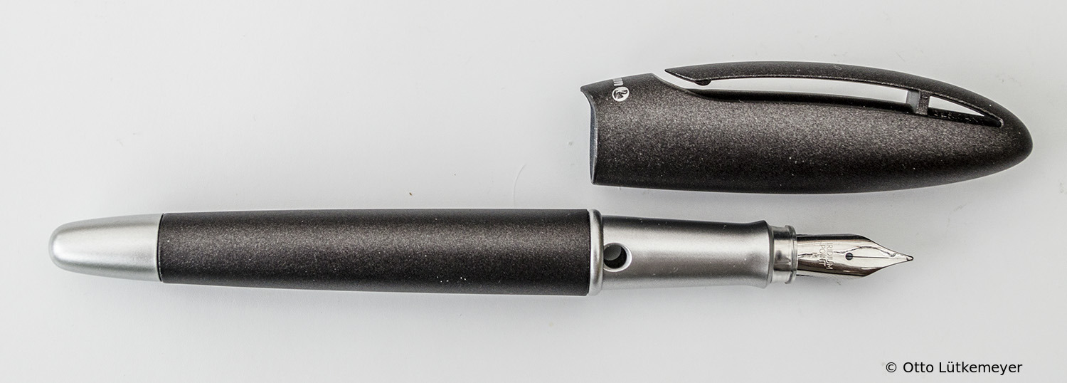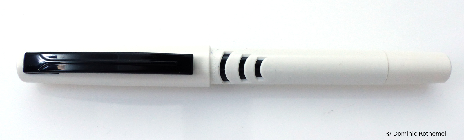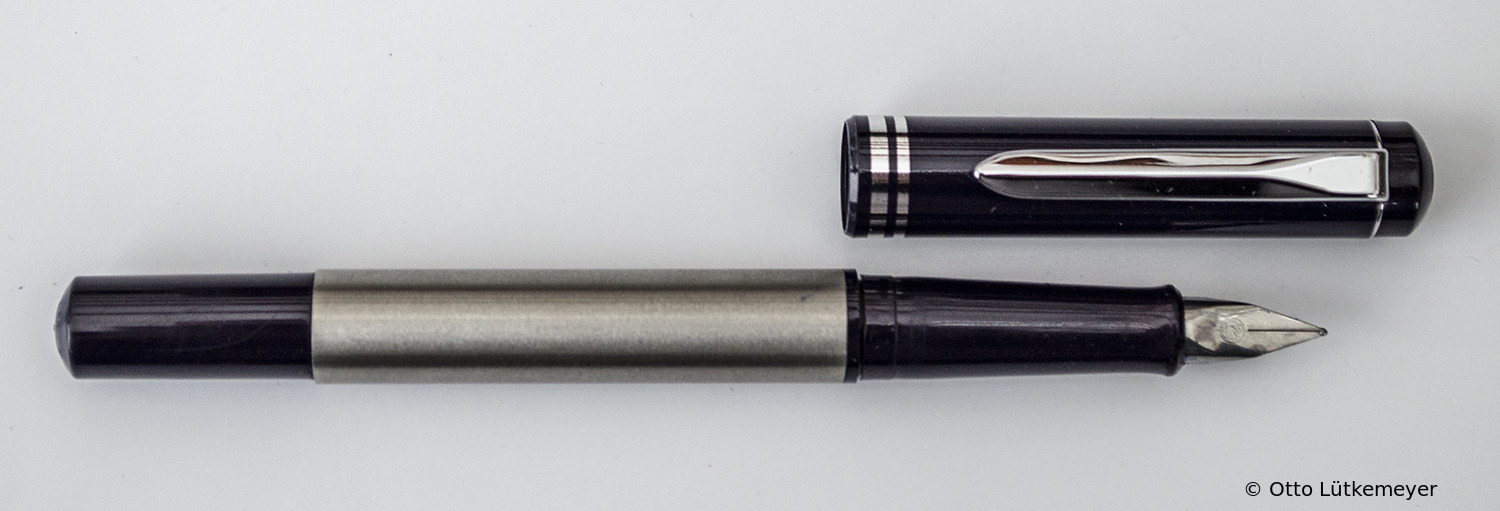 A conspicuous feature of these two fountain pens are 5 ink windows in the barrel that indicate the level of the inserted ink cartridges.