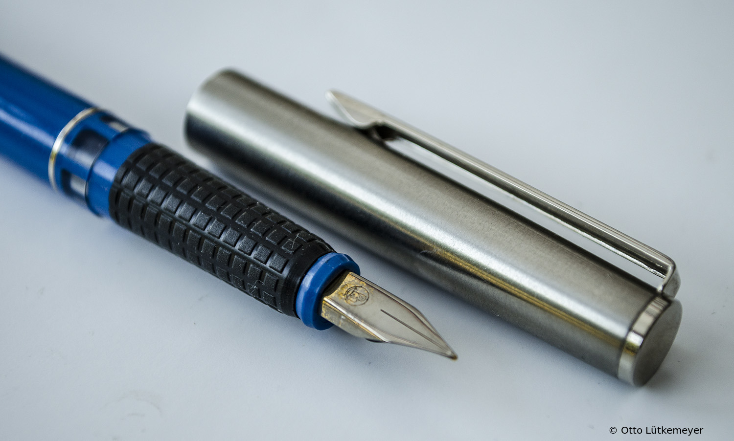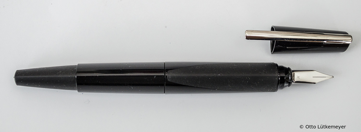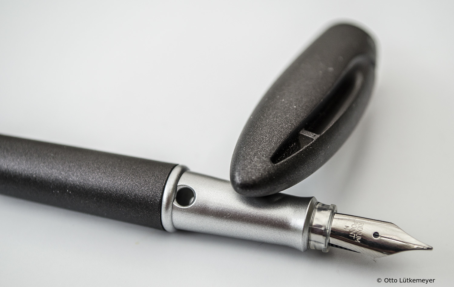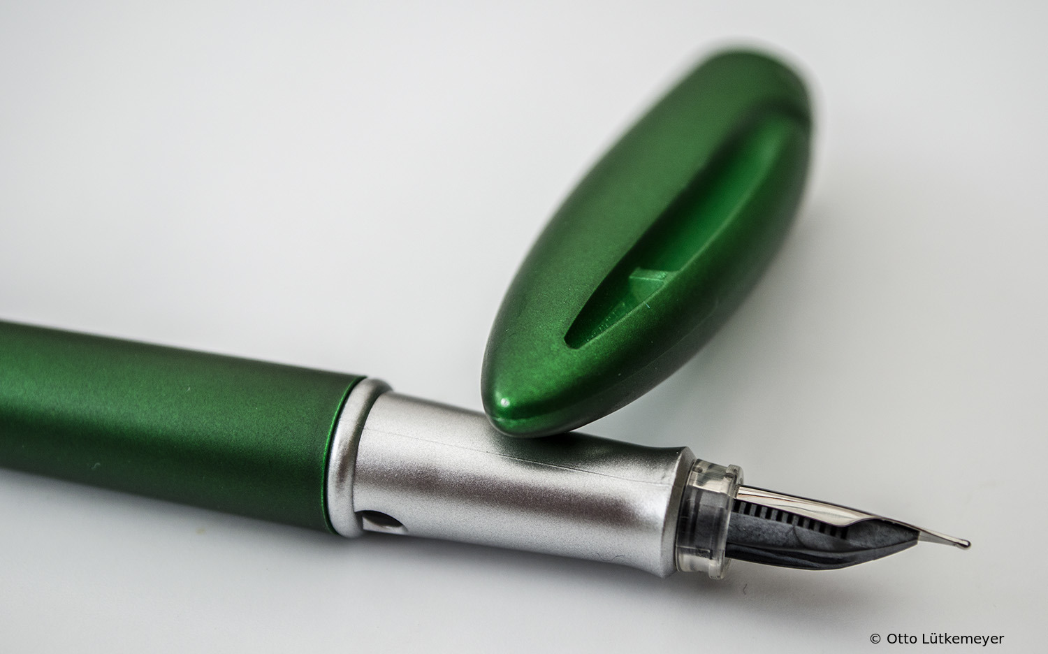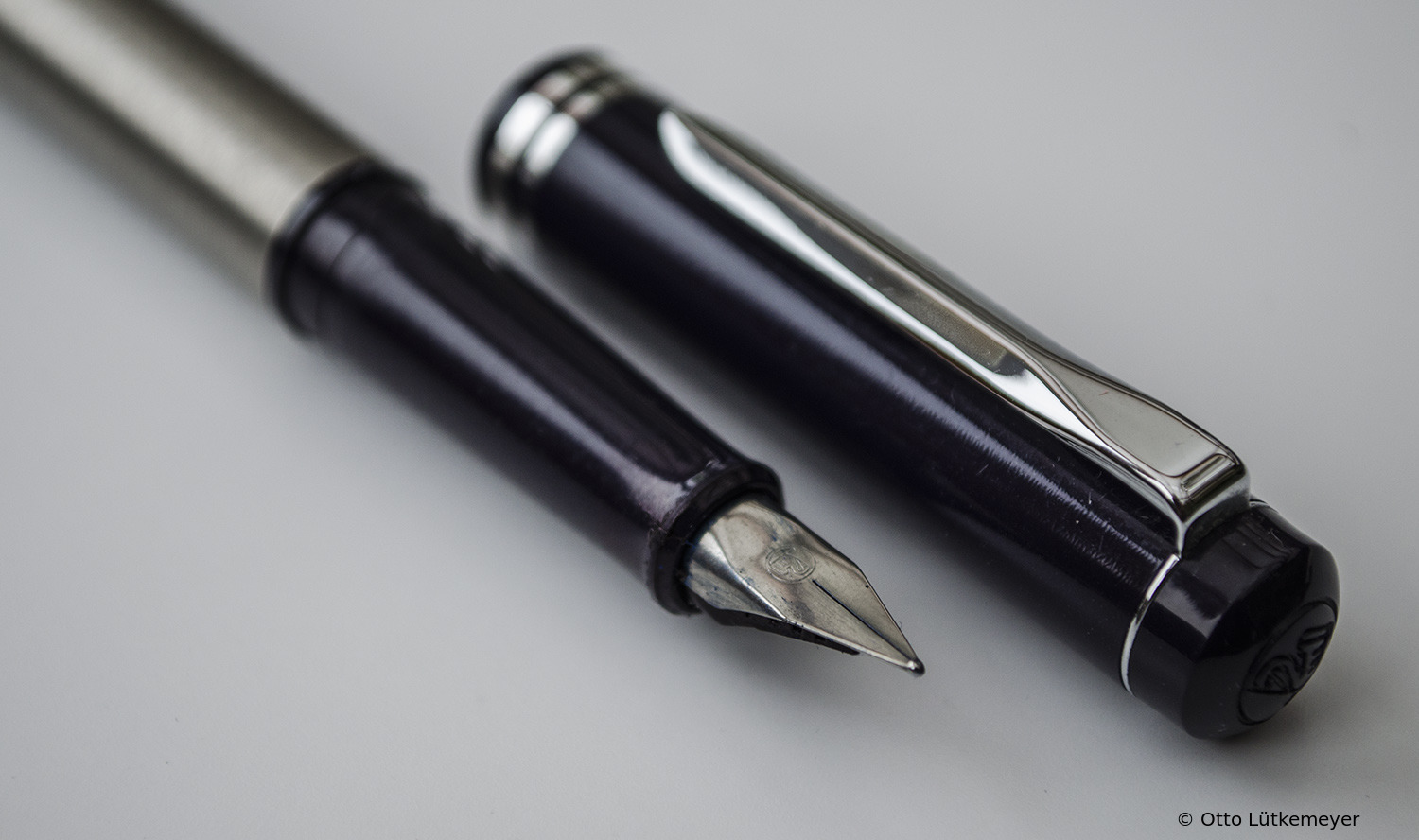 A conspicuous feature of these two fountain pens are 5 ink windows in the barrel that indicate the level of the inserted ink cartridges.