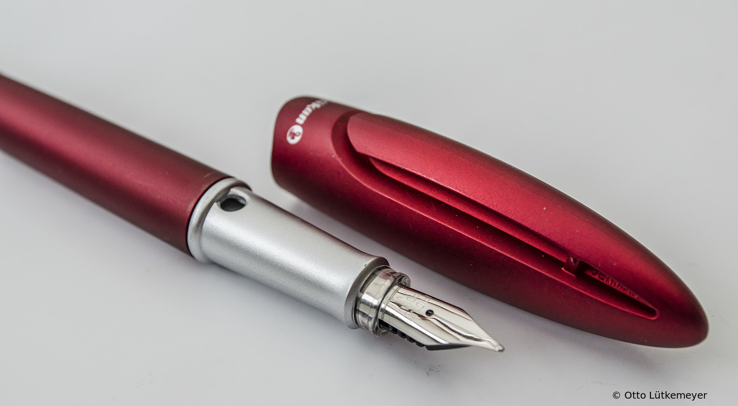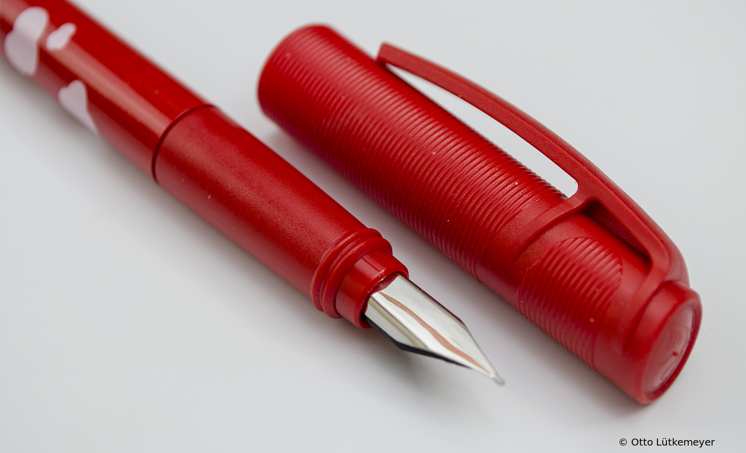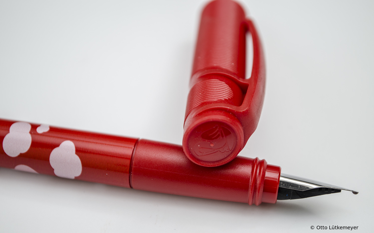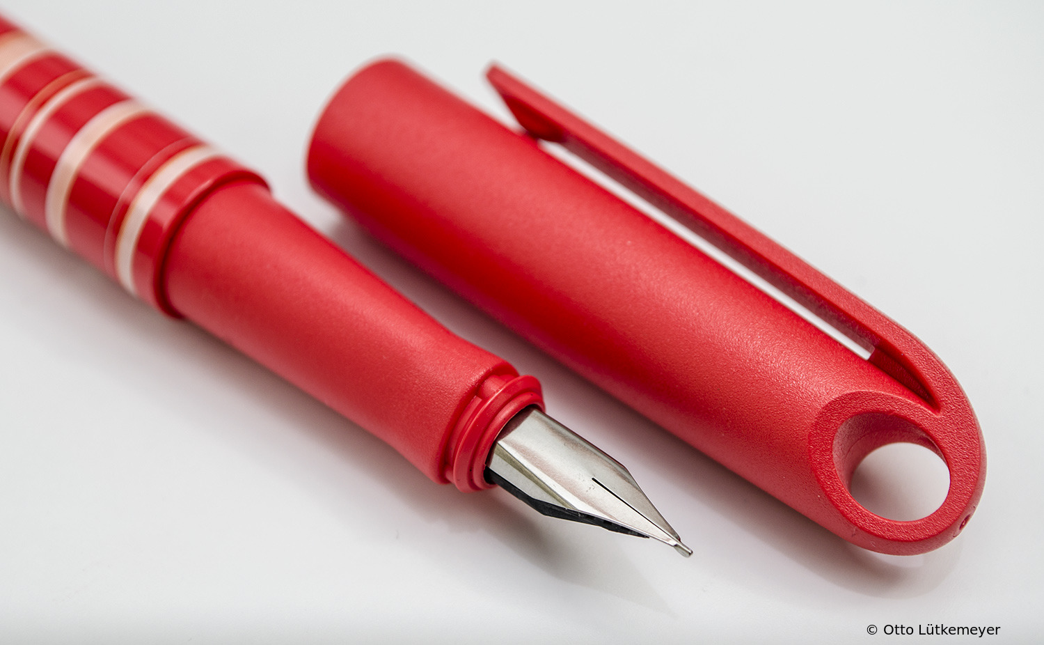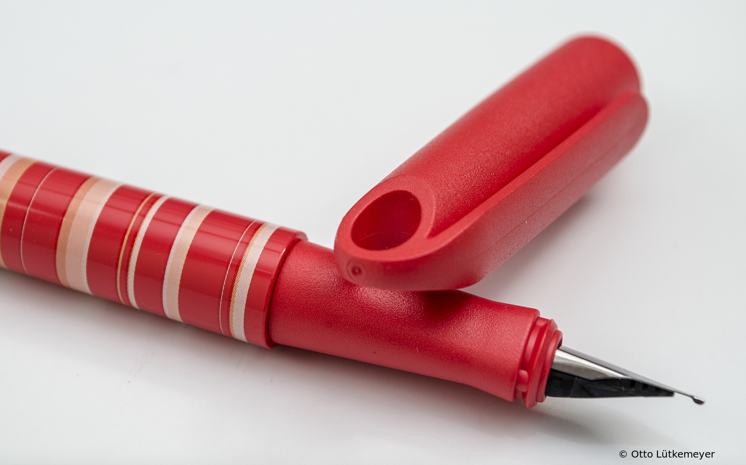 You might think at first sight that these are two identical models in different colors. But taking a closer look we have already seen some differences. If both fountain pens are put side by side, you can see that the decorative ring between the end of the barrel and the grip section does not lie at the same height. In fact, the barrel end of the red fountain pen is shorter, which is offset by a longer ink window in the barrel, so that both fountain pens have the same overall length. Also, the cap top of the pen is slightly different.