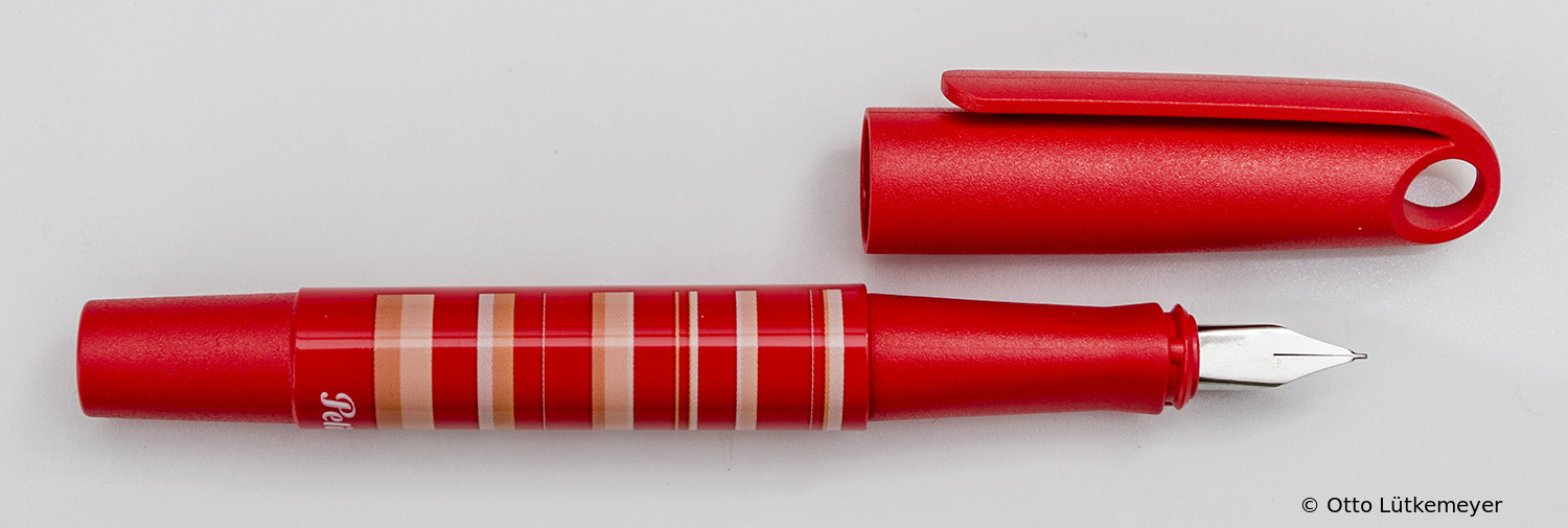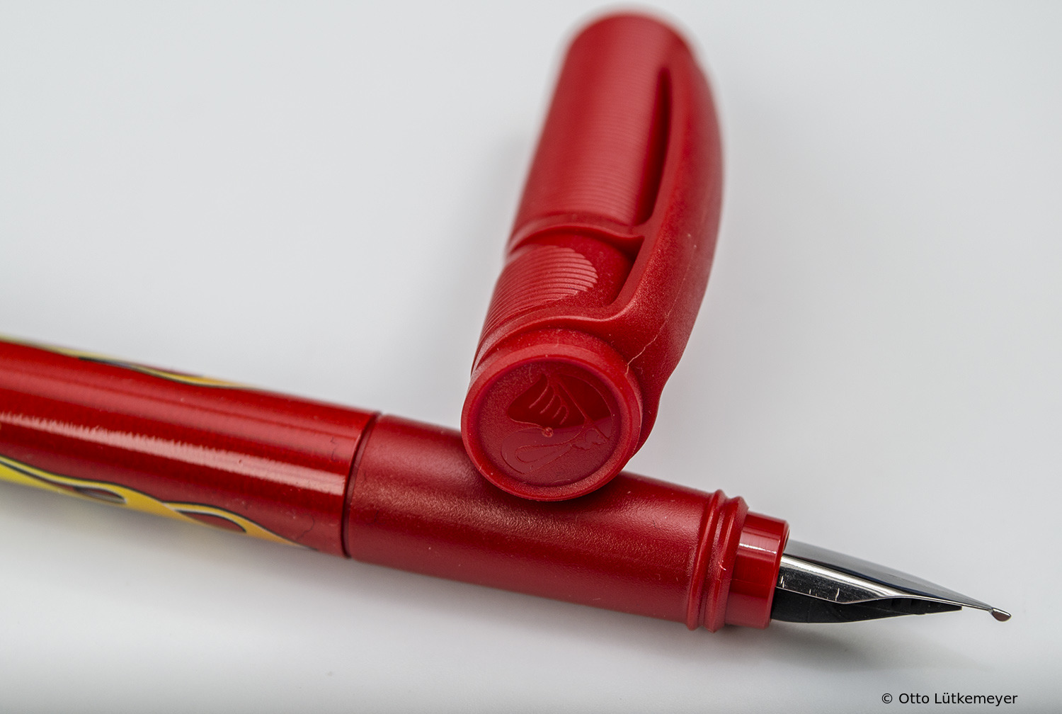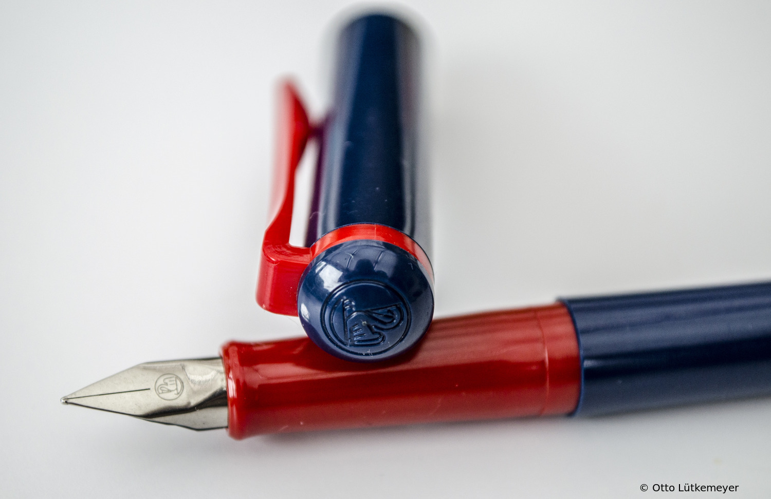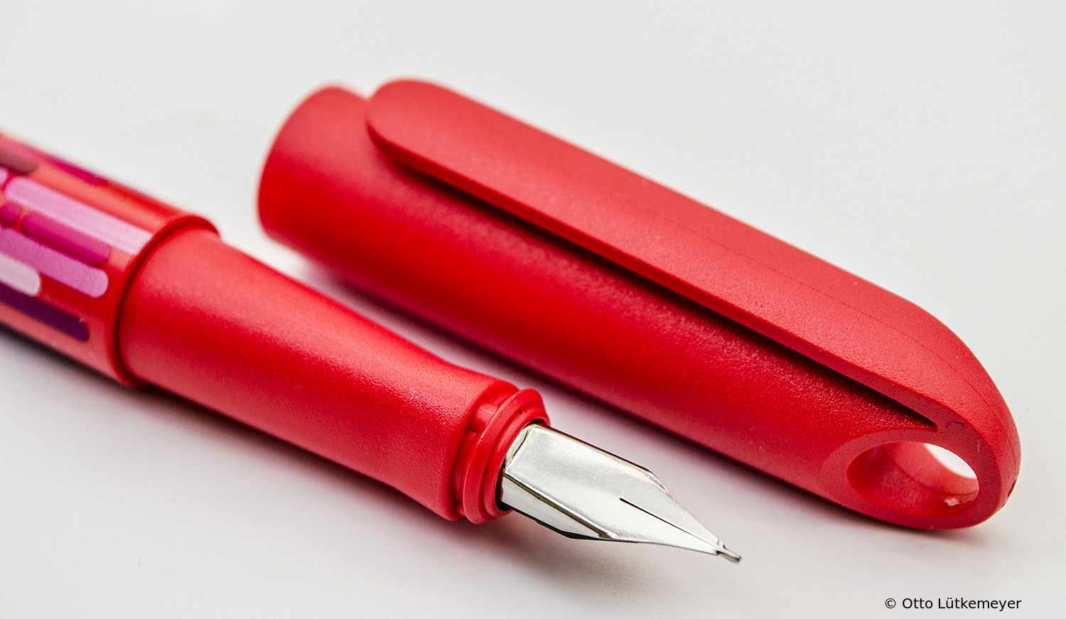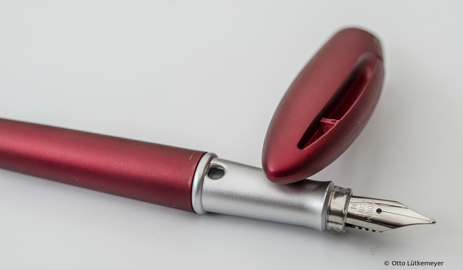 You might think at first sight that these are two identical models in different colors. But taking a closer look we have already seen some differences. If both fountain pens are put side by side, you can see that the decorative ring between the end of the barrel and the grip section does not lie at the same height. In fact, the barrel end of the red fountain pen is shorter, which is offset by a longer ink window in the barrel, so that both fountain pens have the same overall length. Also, the cap top of the pen is slightly different.