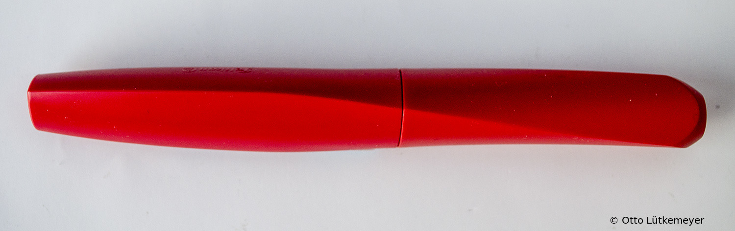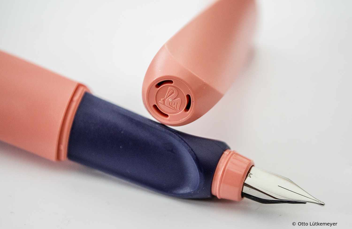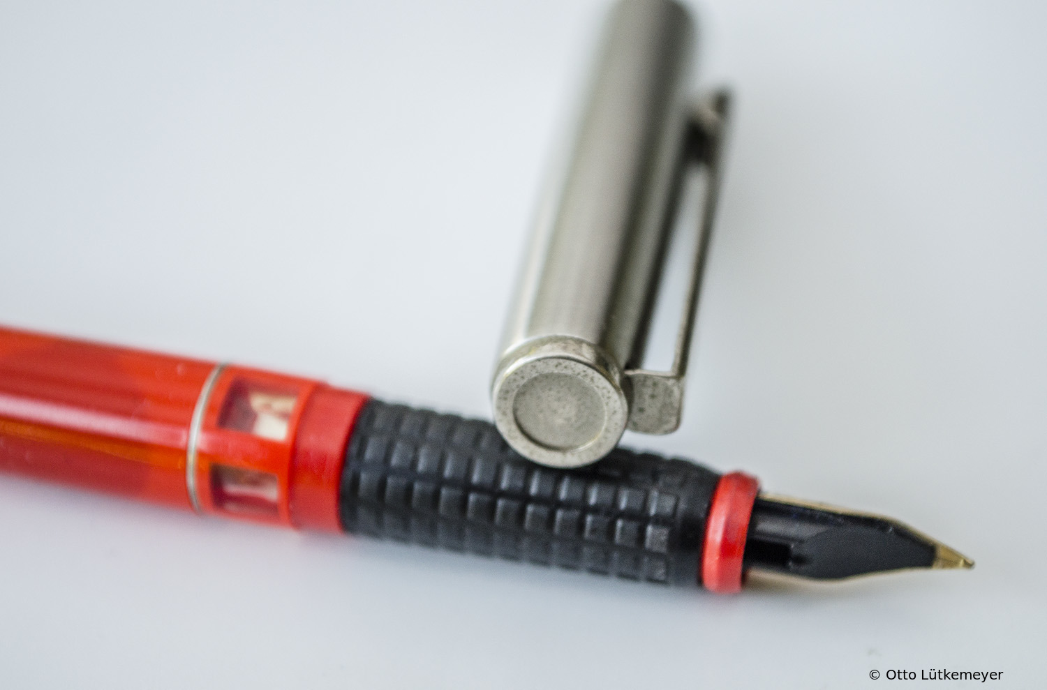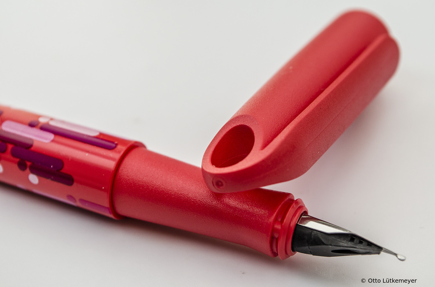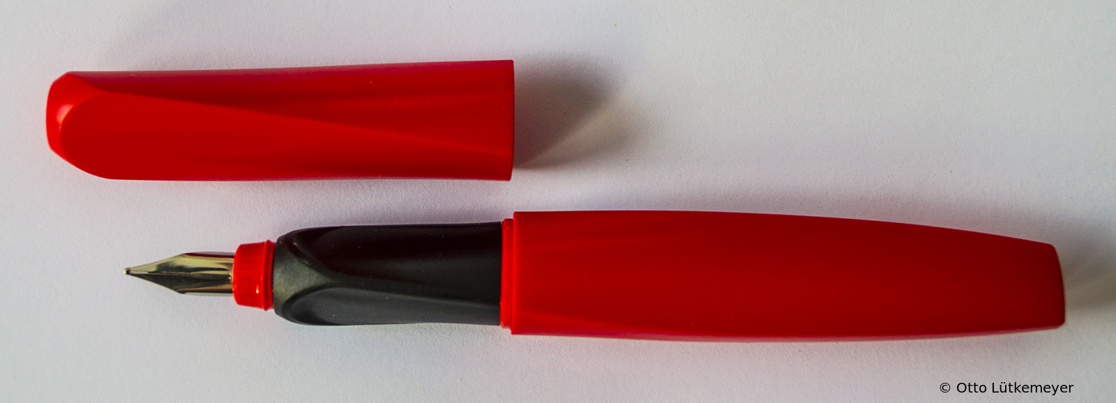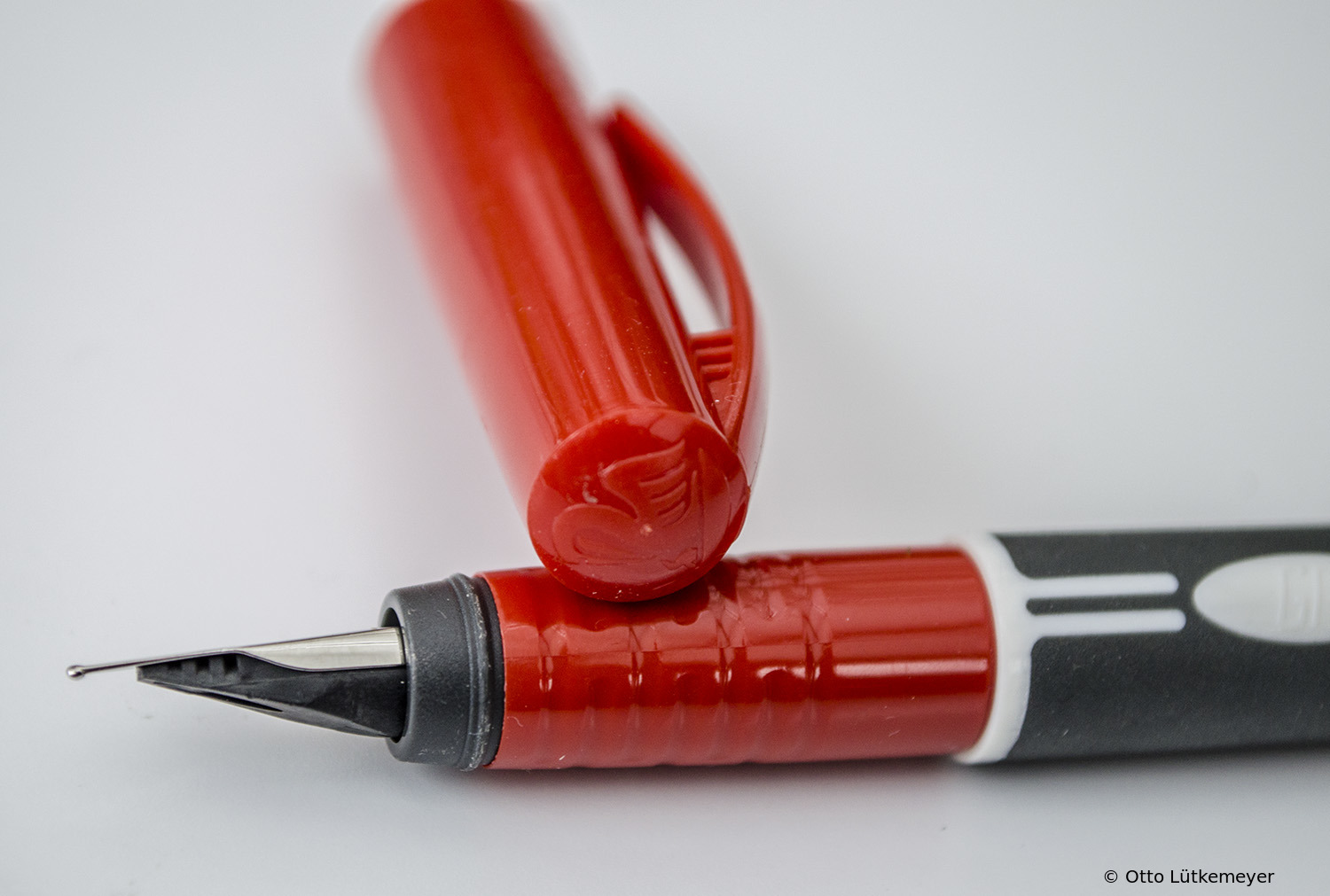 You might think at first sight that these are two identical models in different colors. But taking a closer look we have already seen some differences. If both fountain pens are put side by side, you can see that the decorative ring between the end of the barrel and the grip section does not lie at the same height. In fact, the barrel end of the red fountain pen is shorter, which is offset by a longer ink window in the barrel, so that both fountain pens have the same overall length. Also, the cap top of the pen is slightly different.