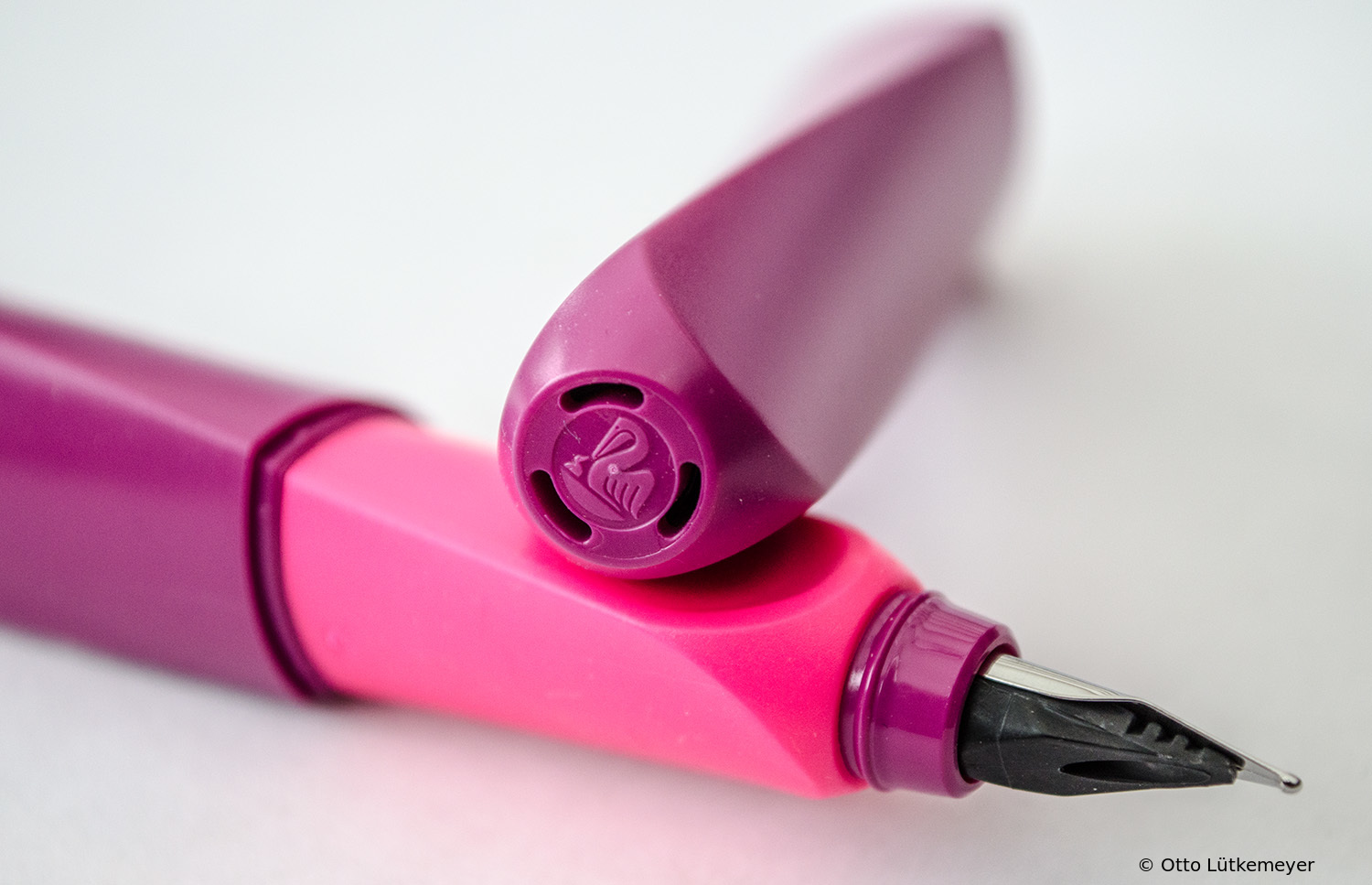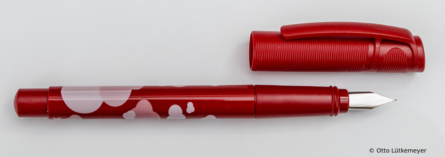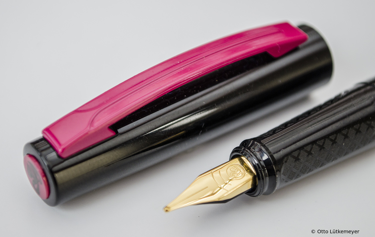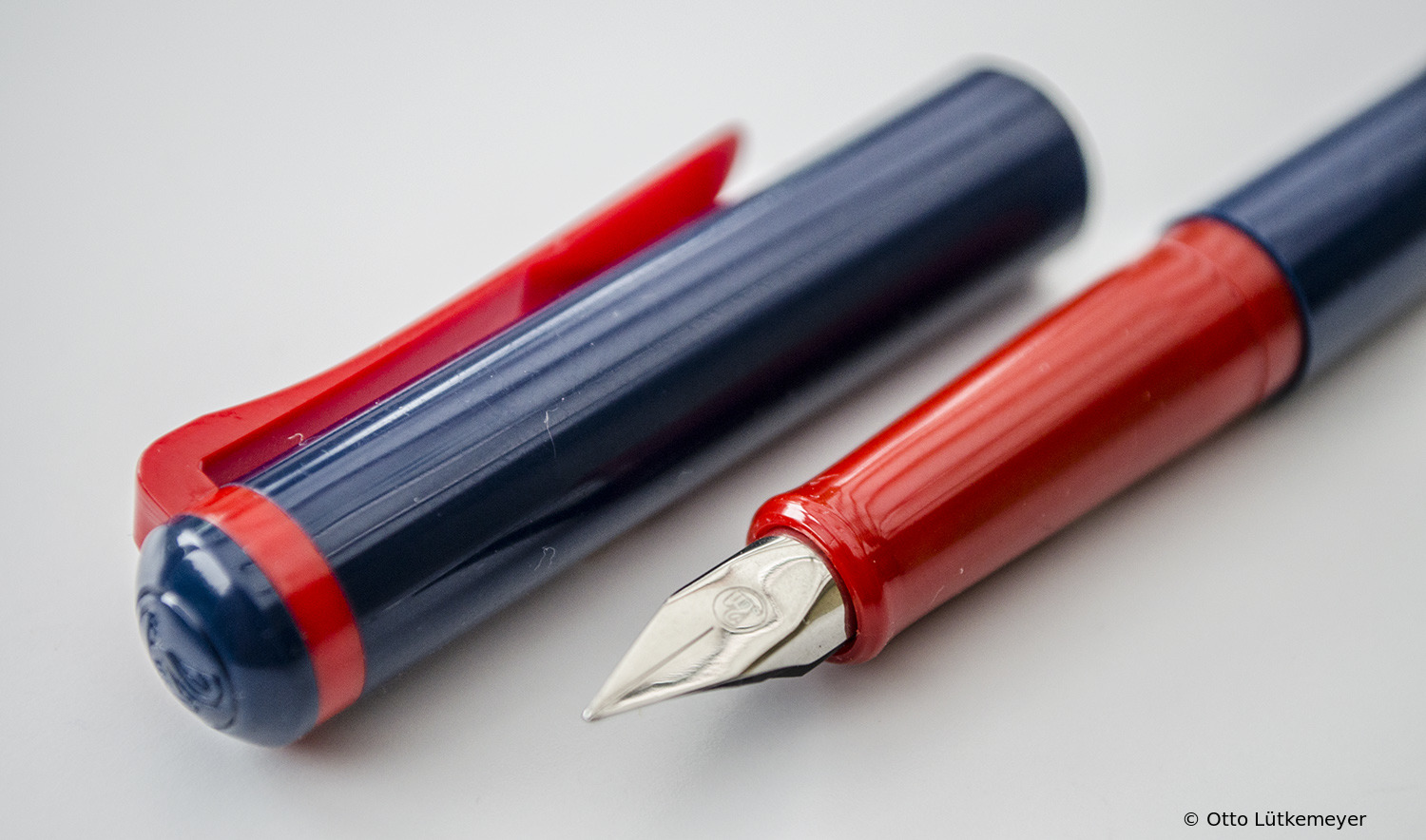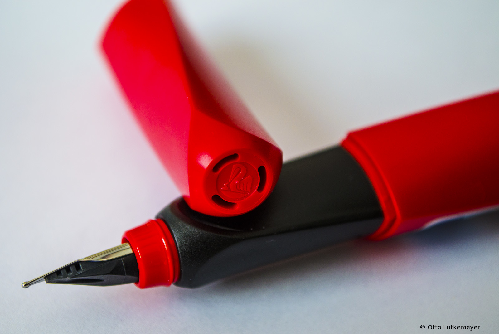 You might think at first sight that these are two identical models in different colors. But taking a closer look we have already seen some differences. If both fountain pens are put side by side, you can see that the decorative ring between the end of the barrel and the grip section does not lie at the same height. In fact, the barrel end of the red fountain pen is shorter, which is offset by a longer ink window in the barrel, so that both fountain pens have the same overall length. Also, the cap top of the pen is slightly different.