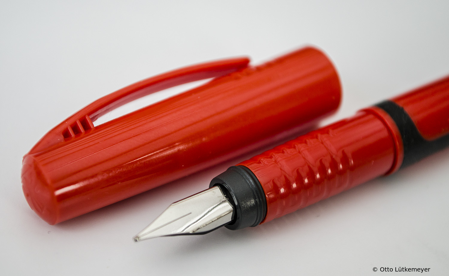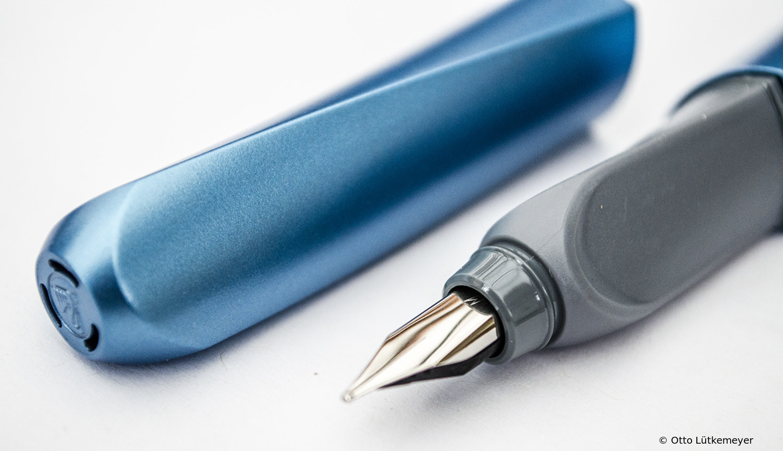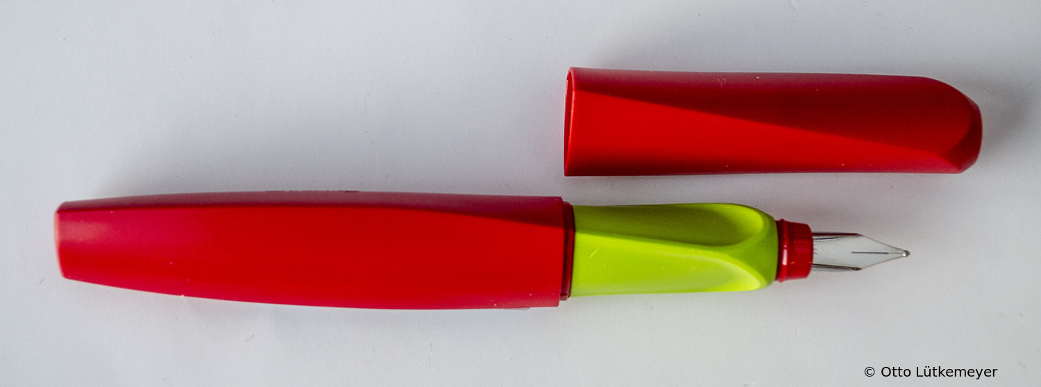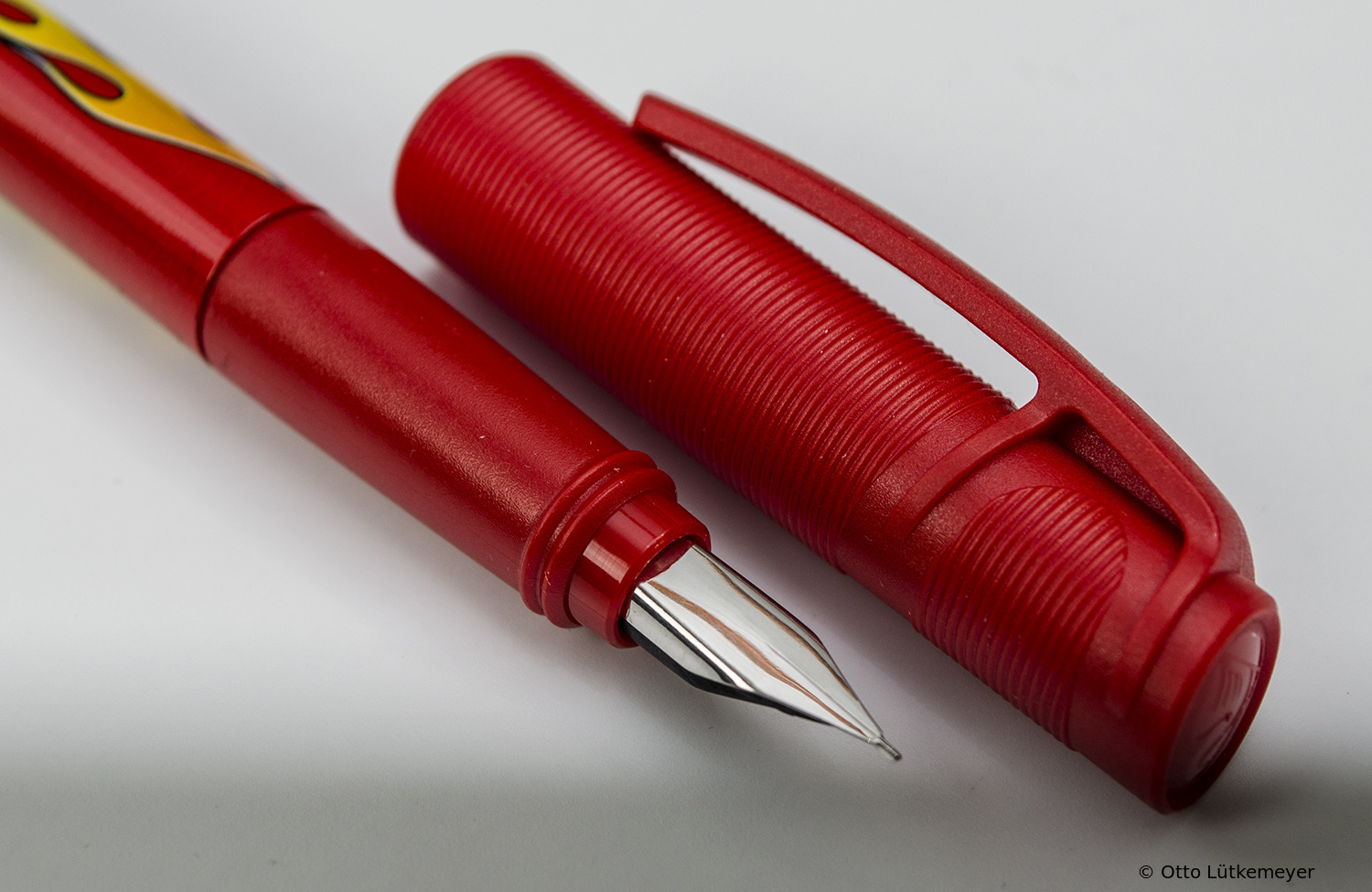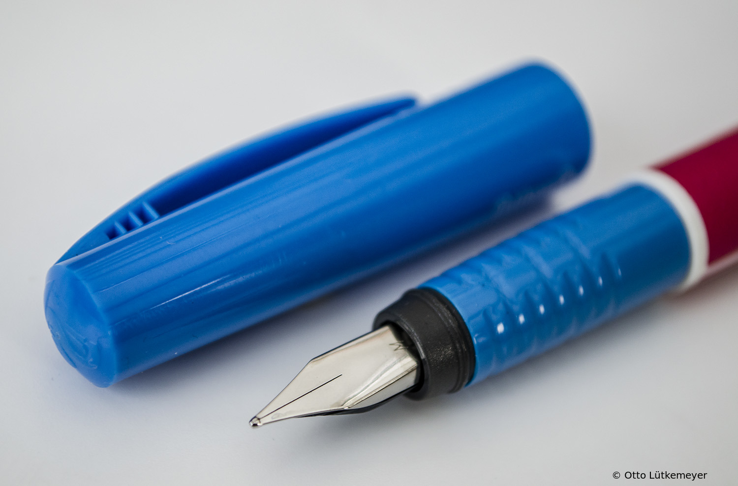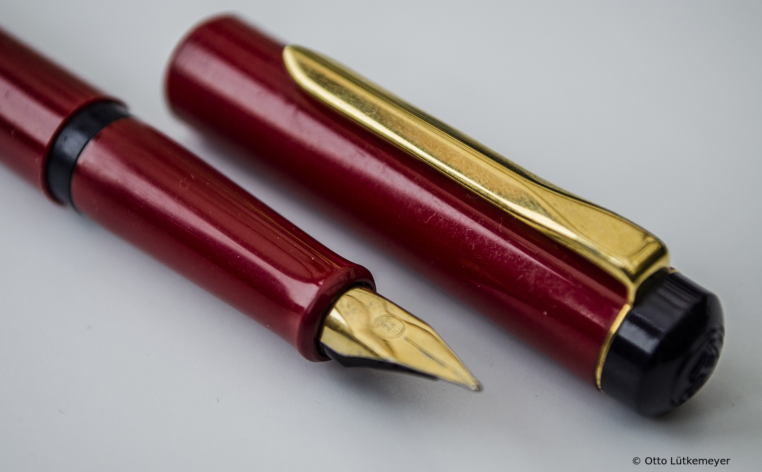 You might think at first sight that these are two identical models in different colors. But taking a closer look we have already seen some differences. If both fountain pens are put side by side, you can see that the decorative ring between the end of the barrel and the grip section does not lie at the same height. In fact, the barrel end of the red fountain pen is shorter, which is offset by a longer ink window in the barrel, so that both fountain pens have the same overall length. Also, the cap top of the pen is slightly different.