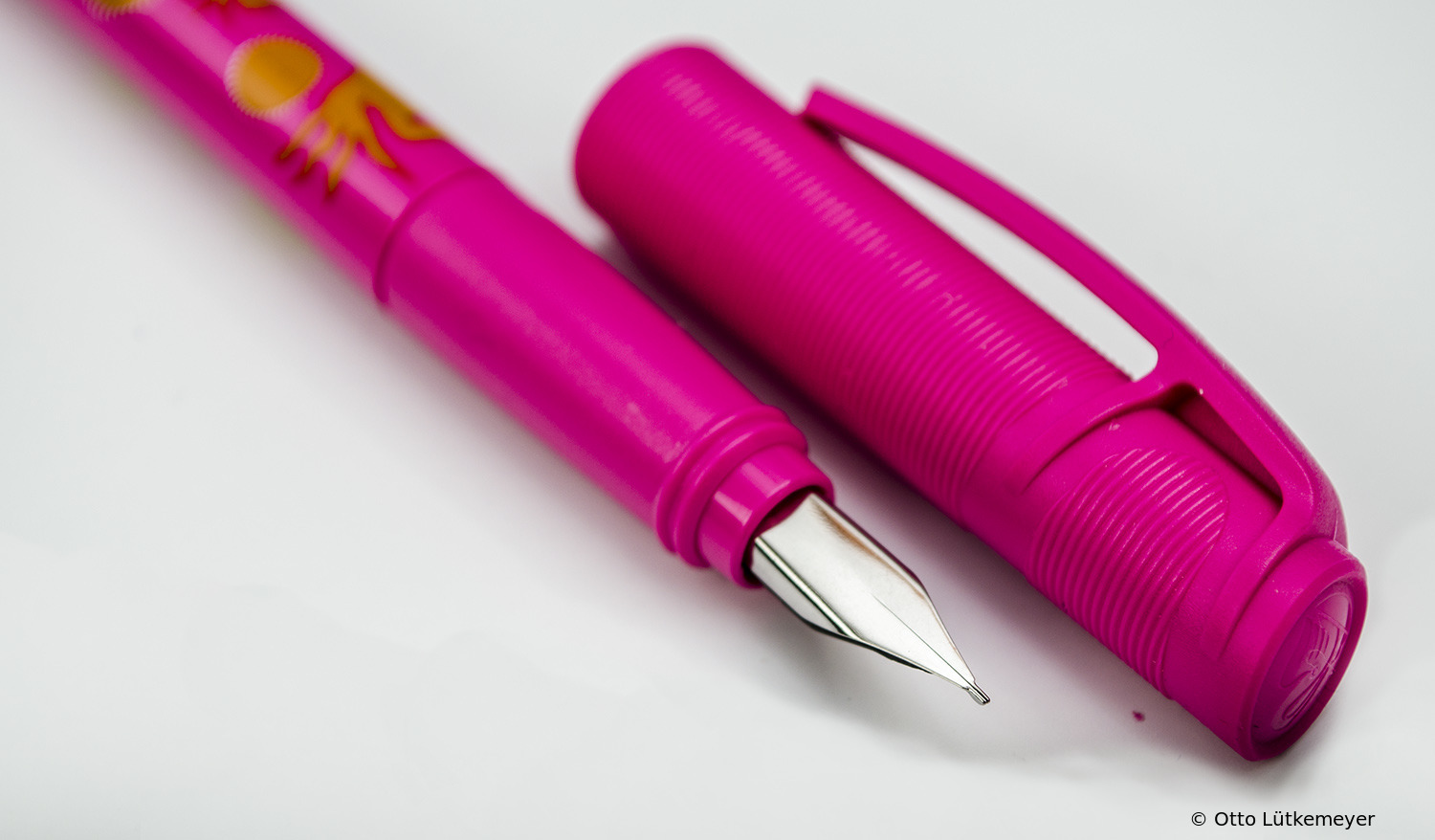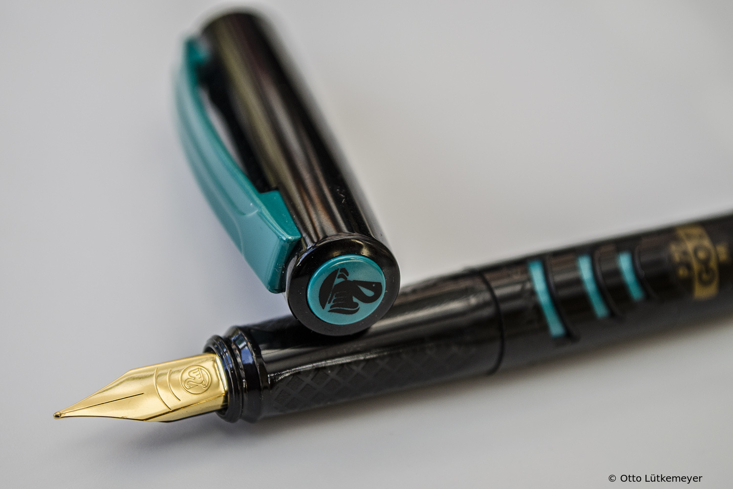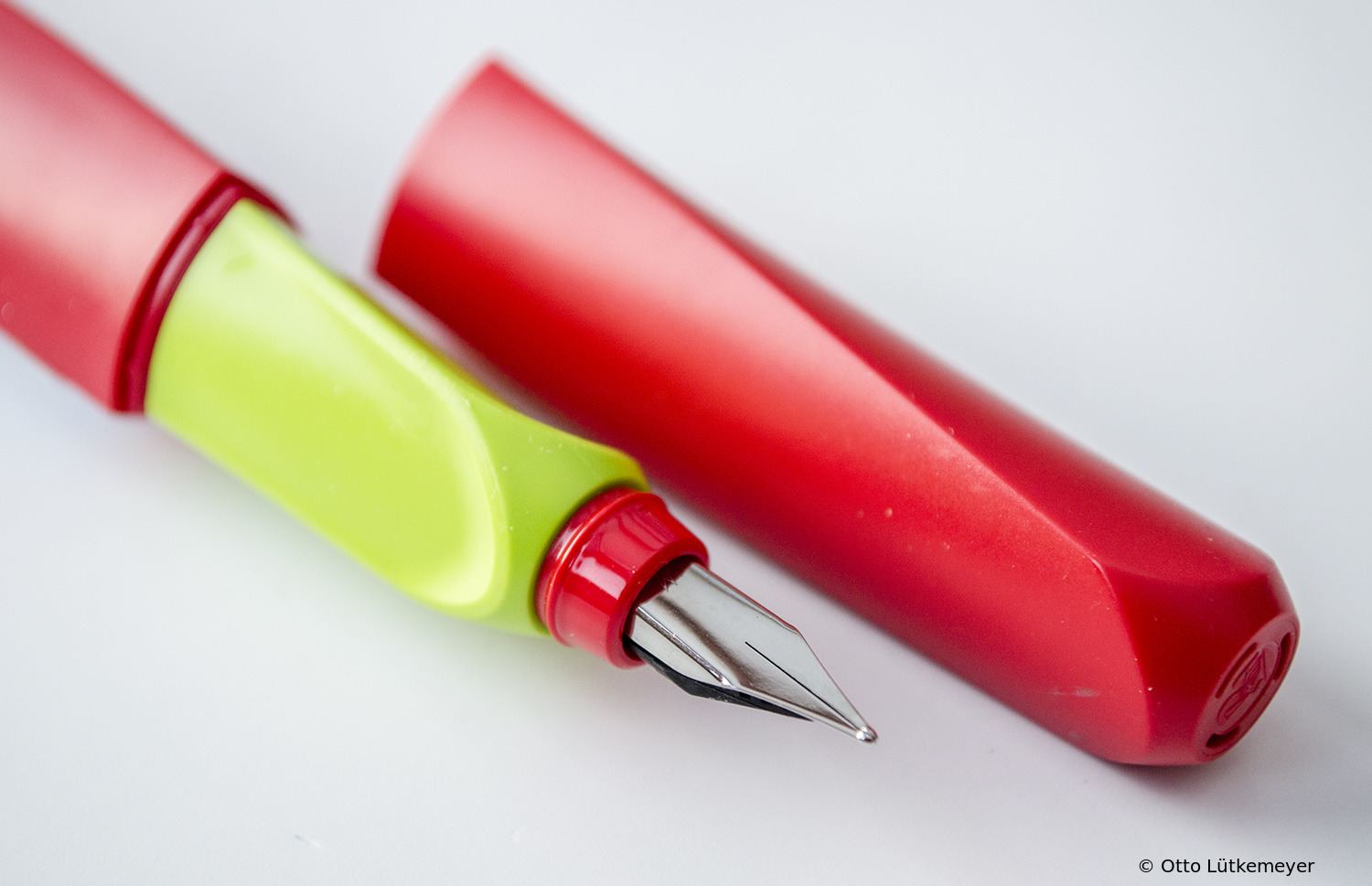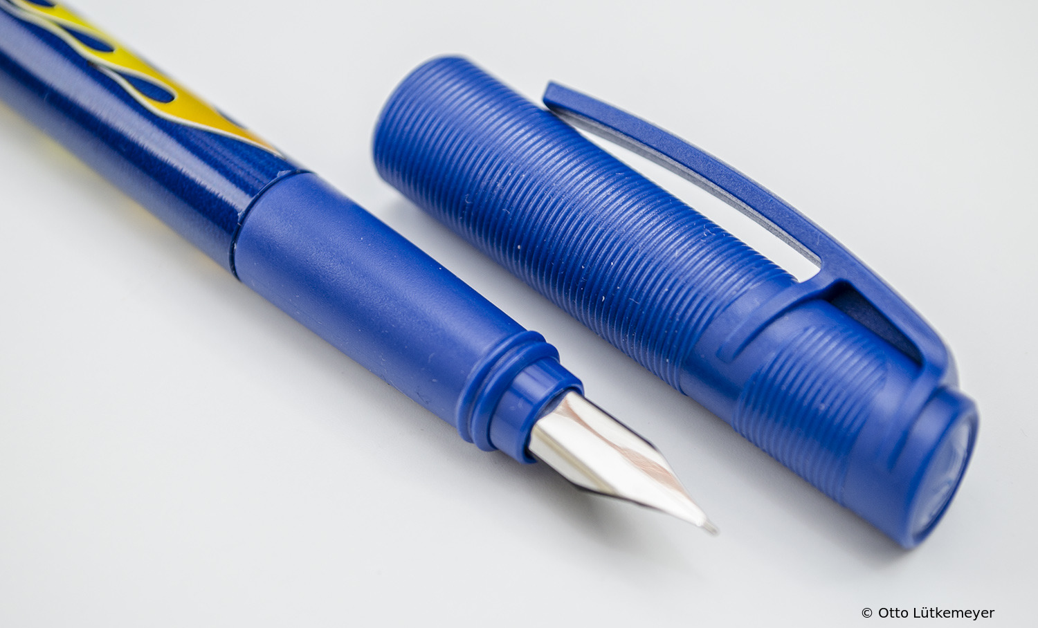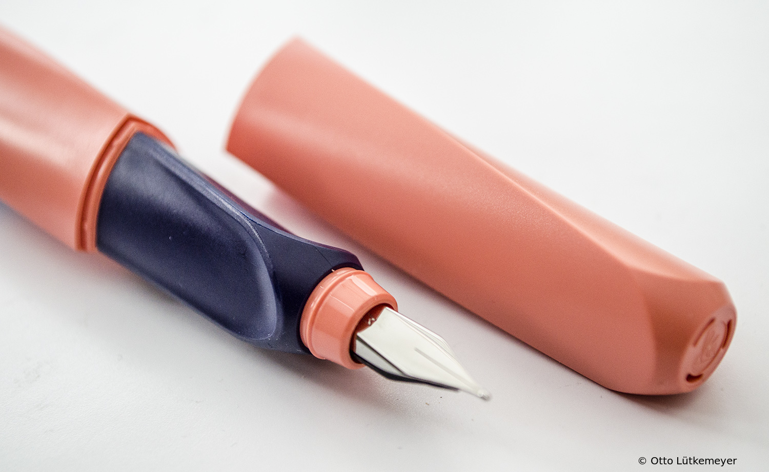 You might think at first sight that these are two identical models in different colors. But taking a closer look we have already seen some differences. If both fountain pens are put side by side, you can see that the decorative ring between the end of the barrel and the grip section does not lie at the same height. In fact, the barrel end of the red fountain pen is shorter, which is offset by a longer ink window in the barrel, so that both fountain pens have the same overall length. Also, the cap top of the pen is slightly different.