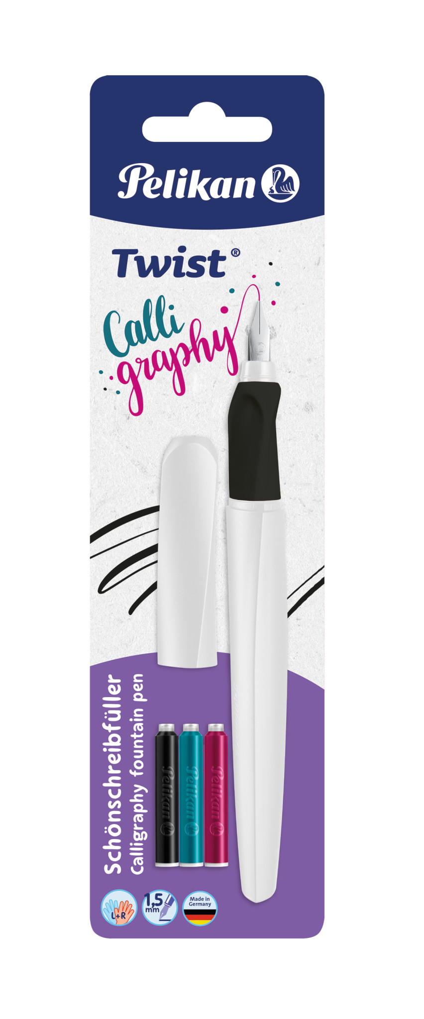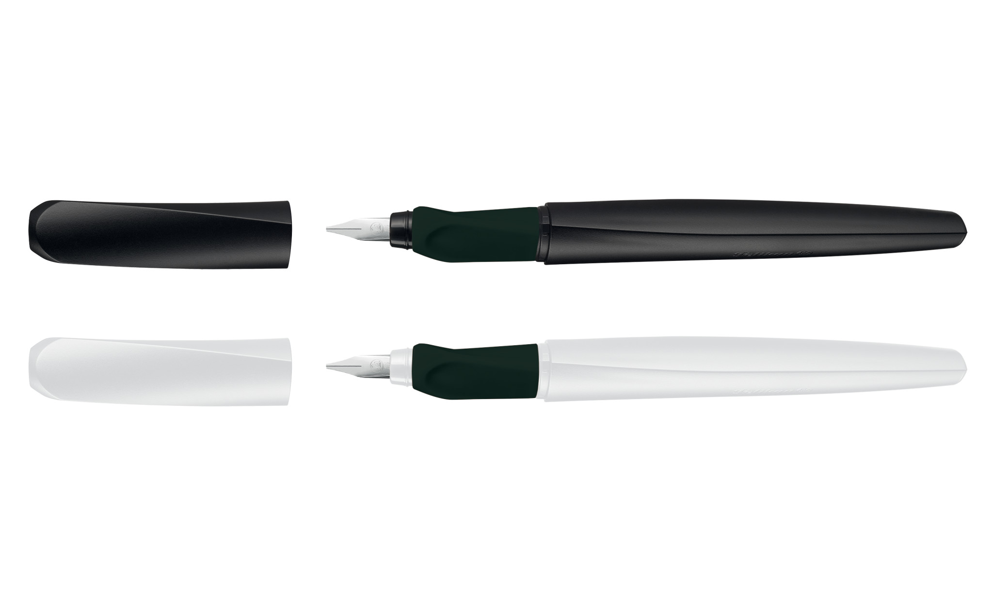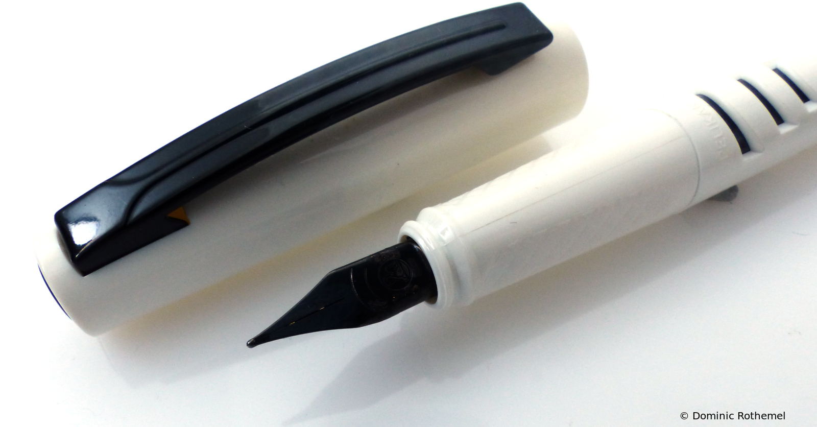 The calligraphy fountain pen with an extended barrel and 1.5mm nib in white and black.