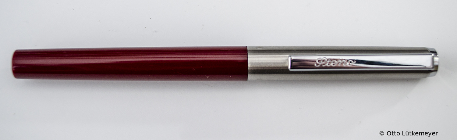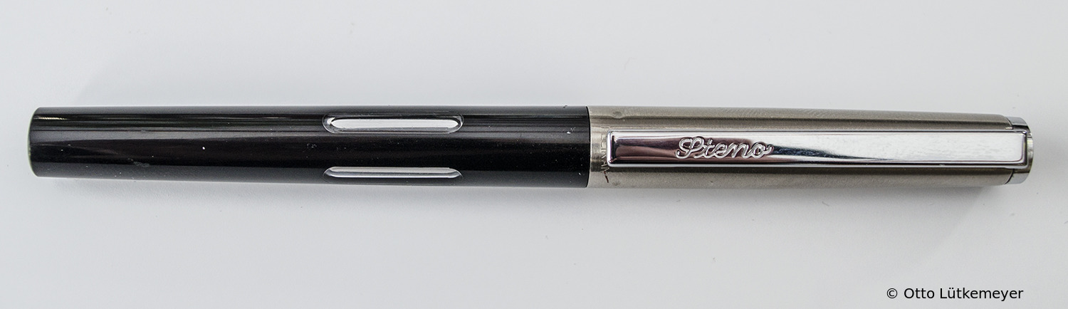 Cylindrical plug stainless steel cap. Embossed 'Steno' on long bar clip; similar Pelikano Model 7.