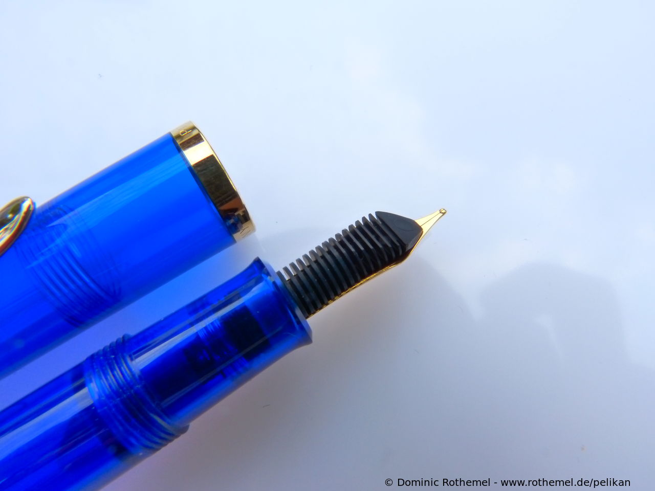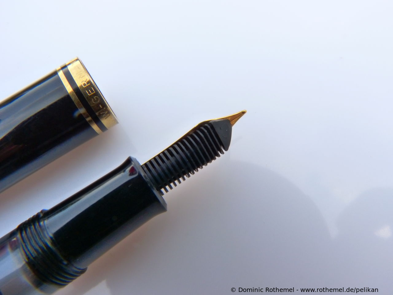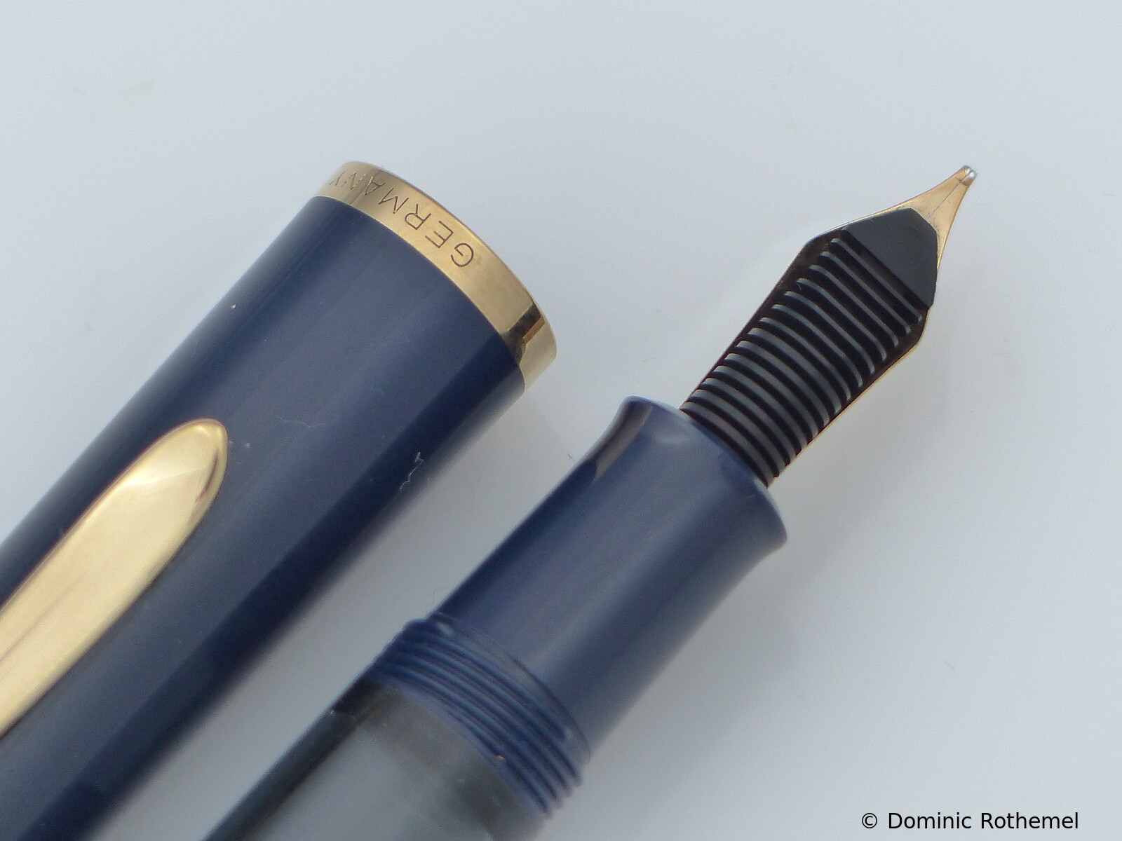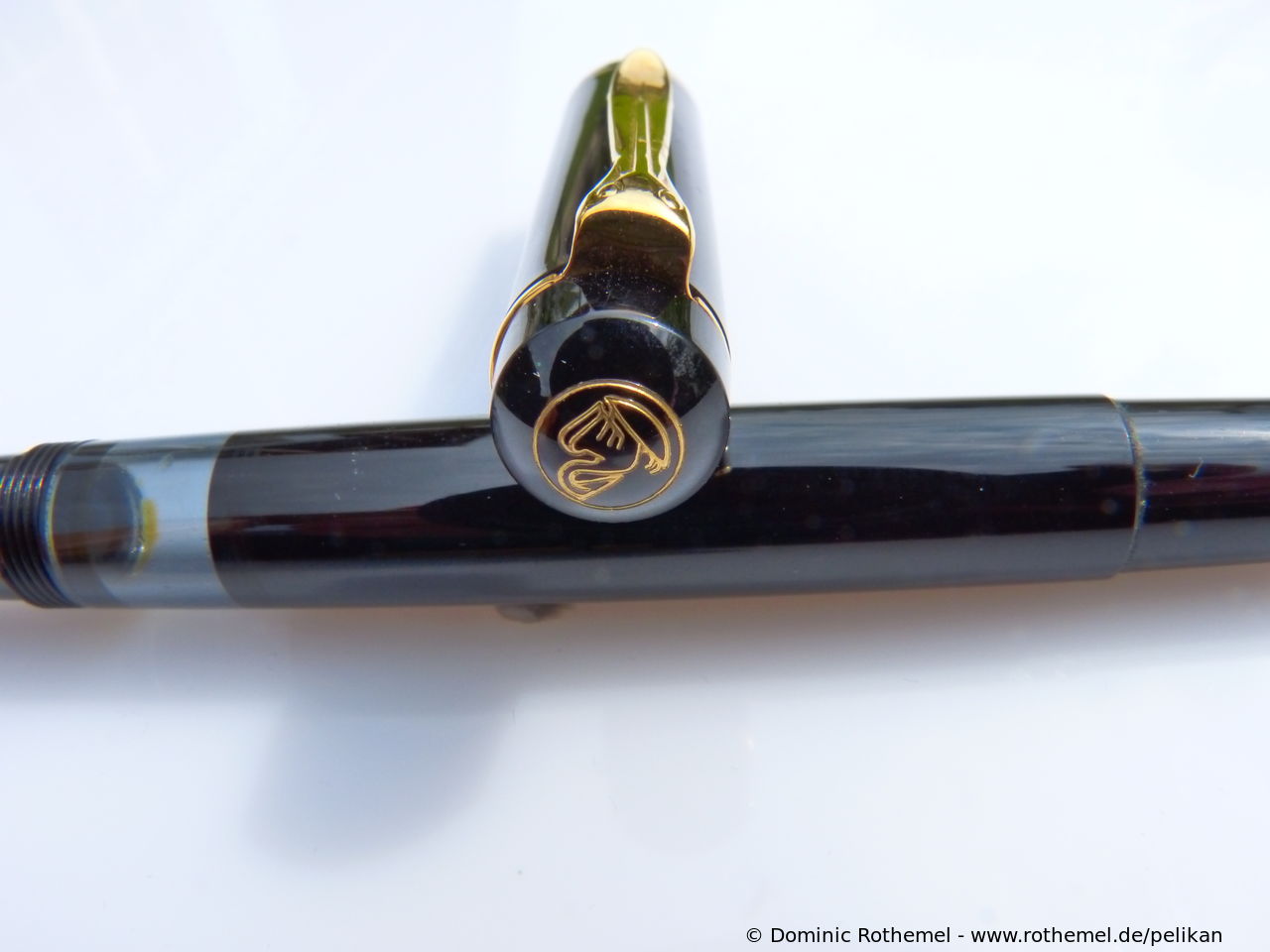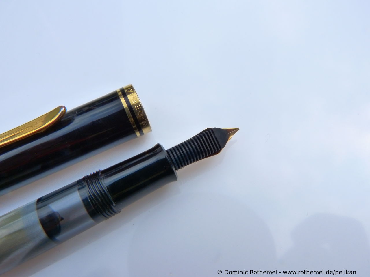 These cap inserts are identical to those of the M400 series, which are decorated with the logo and are held by a golden crown (clip ring). Since the M481 is the cheap version of the M400, he got the insignificant cap (the blind cap) instead of the golden crown, the logo disappeared. Later on, the M200 had the Pelikan logo on the cap. Initially it was screwed, later glued.