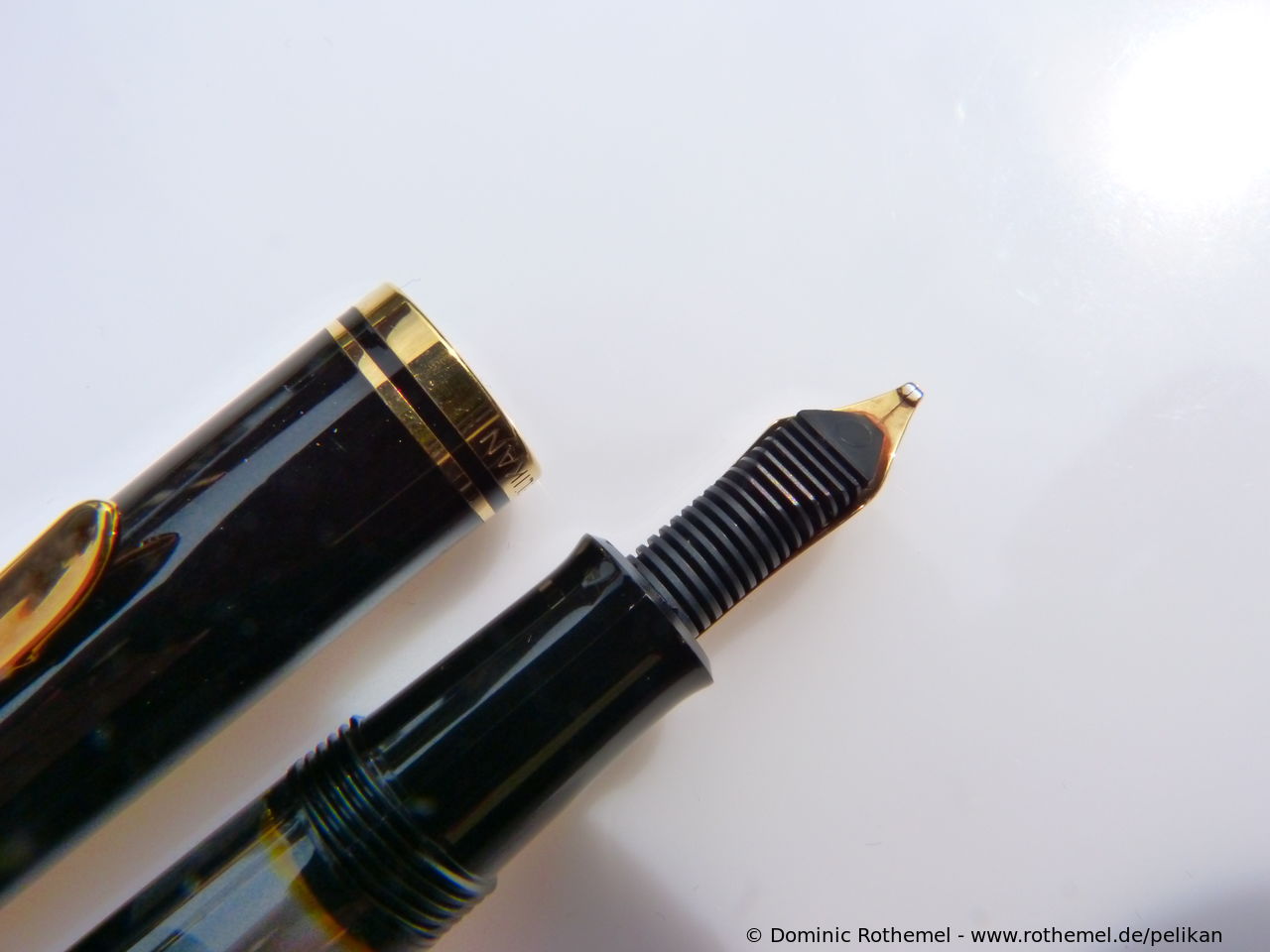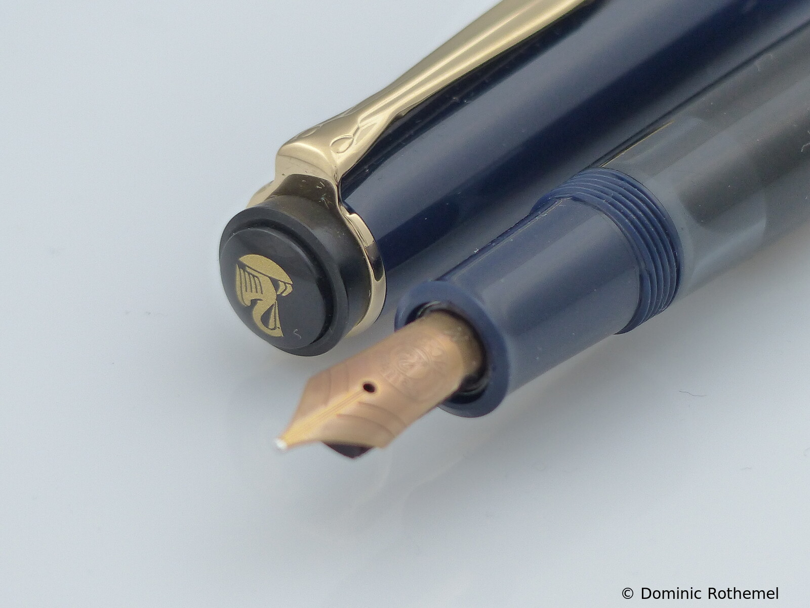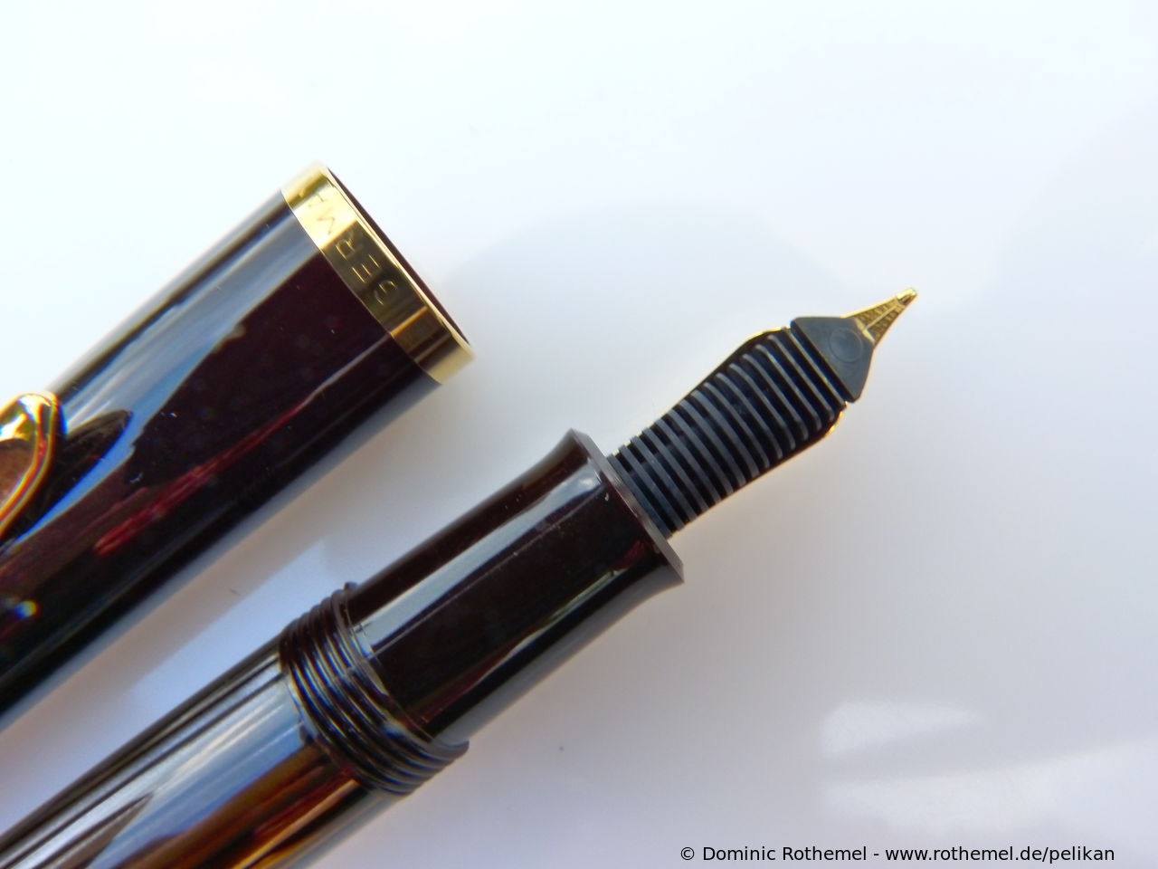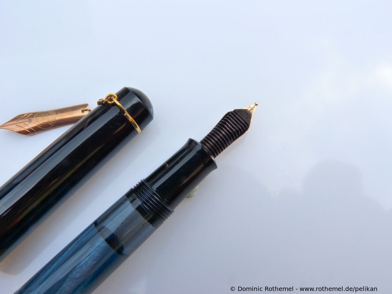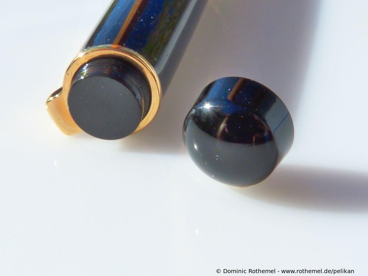 These cap inserts are identical to those of the M400 series, which are decorated with the logo and are held by a golden crown (clip ring). Since the M481 is the cheap version of the M400, he got the insignificant cap (the blind cap) instead of the golden crown, the logo disappeared. Later on, the M200 had the Pelikan logo on the cap. Initially it was screwed, later glued.