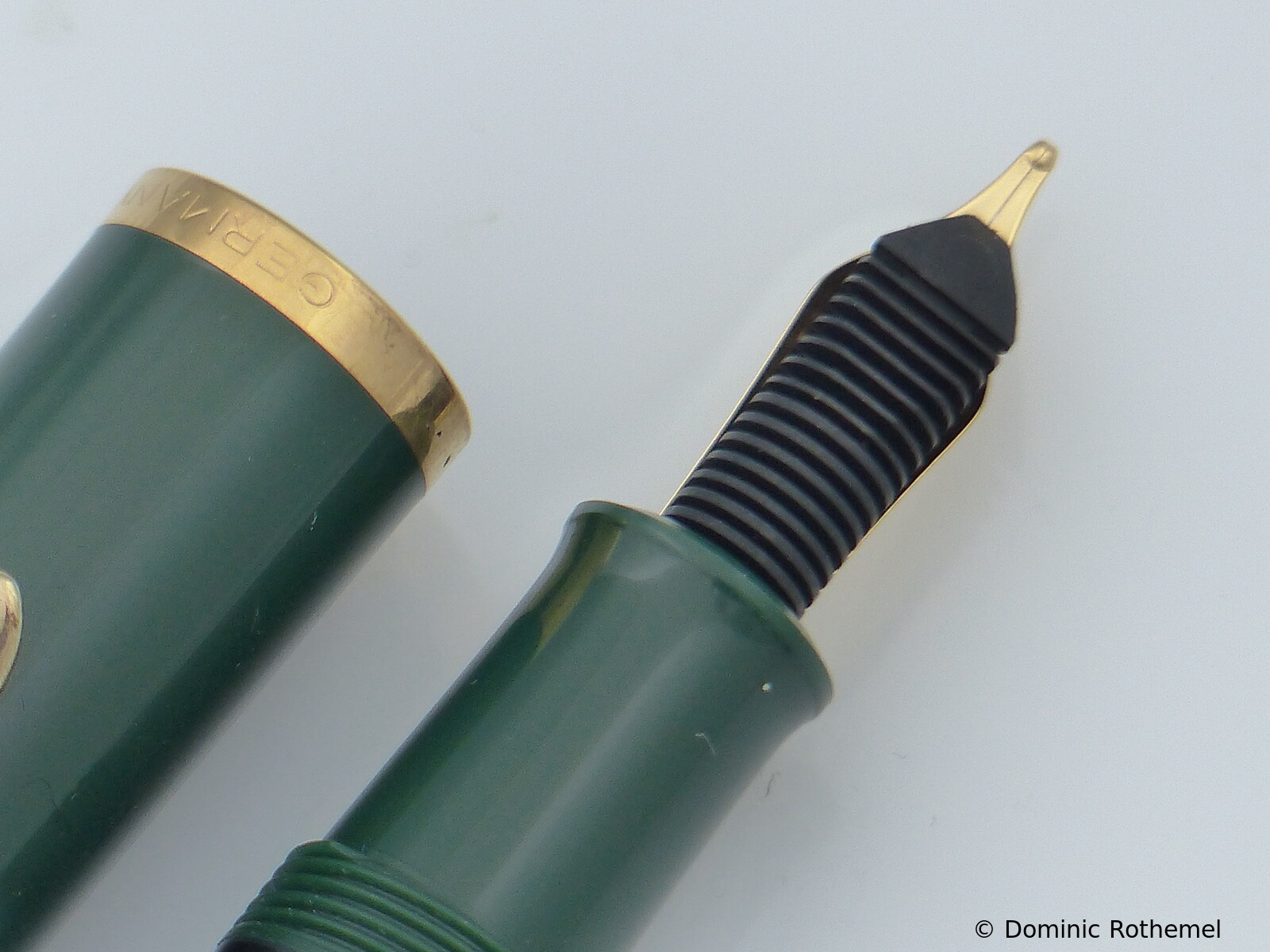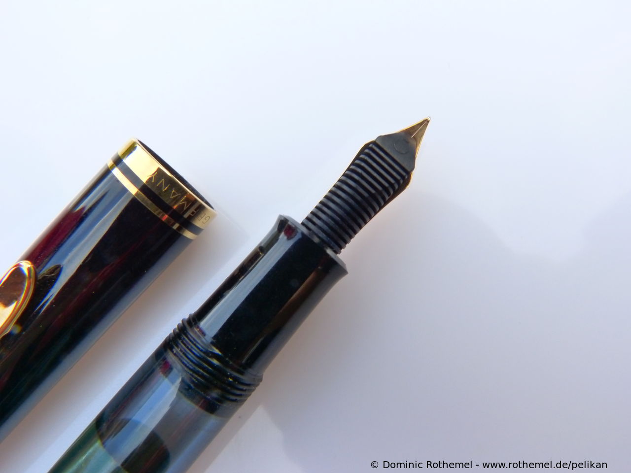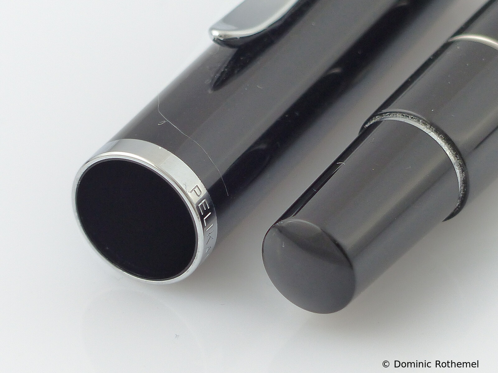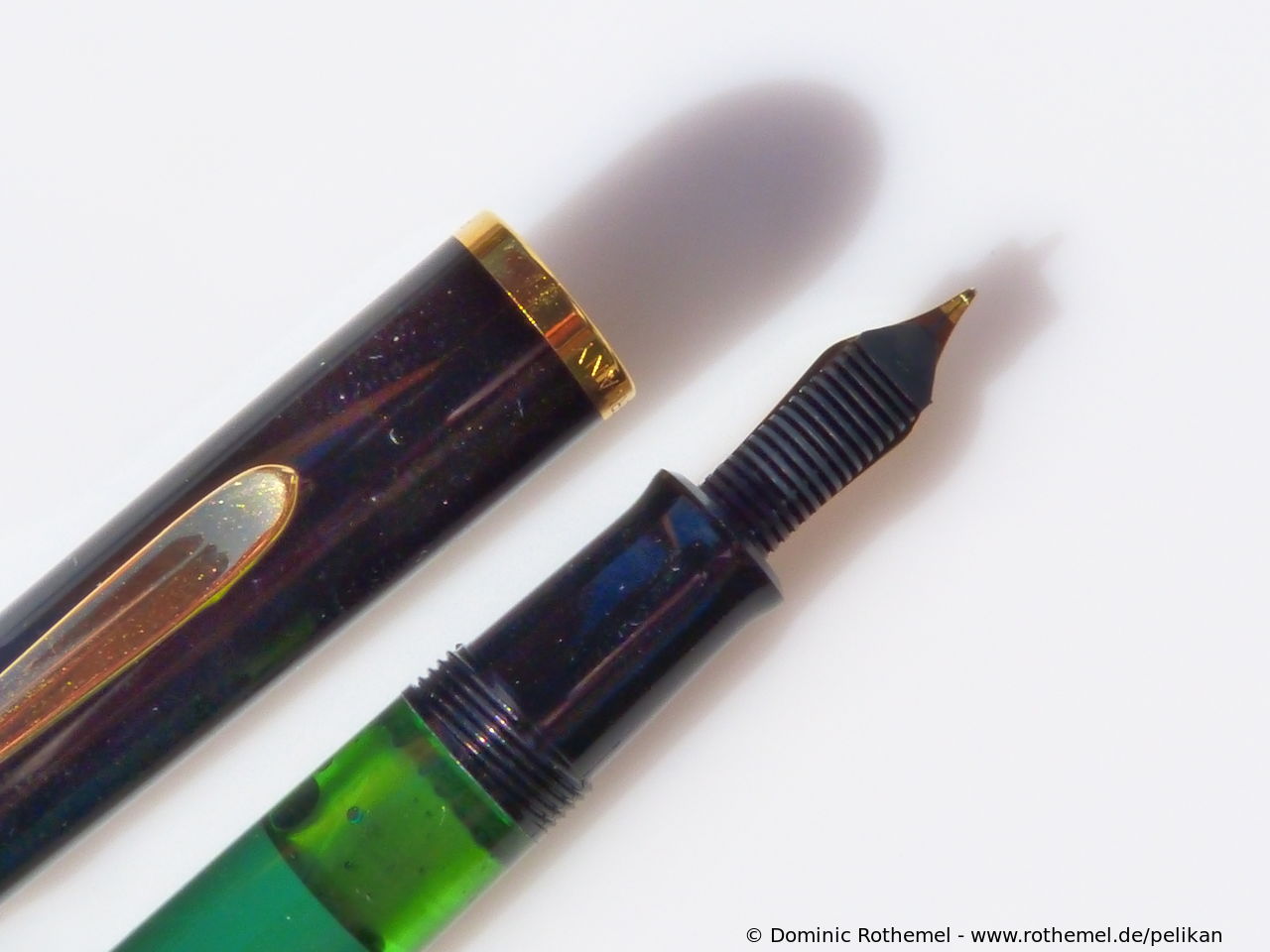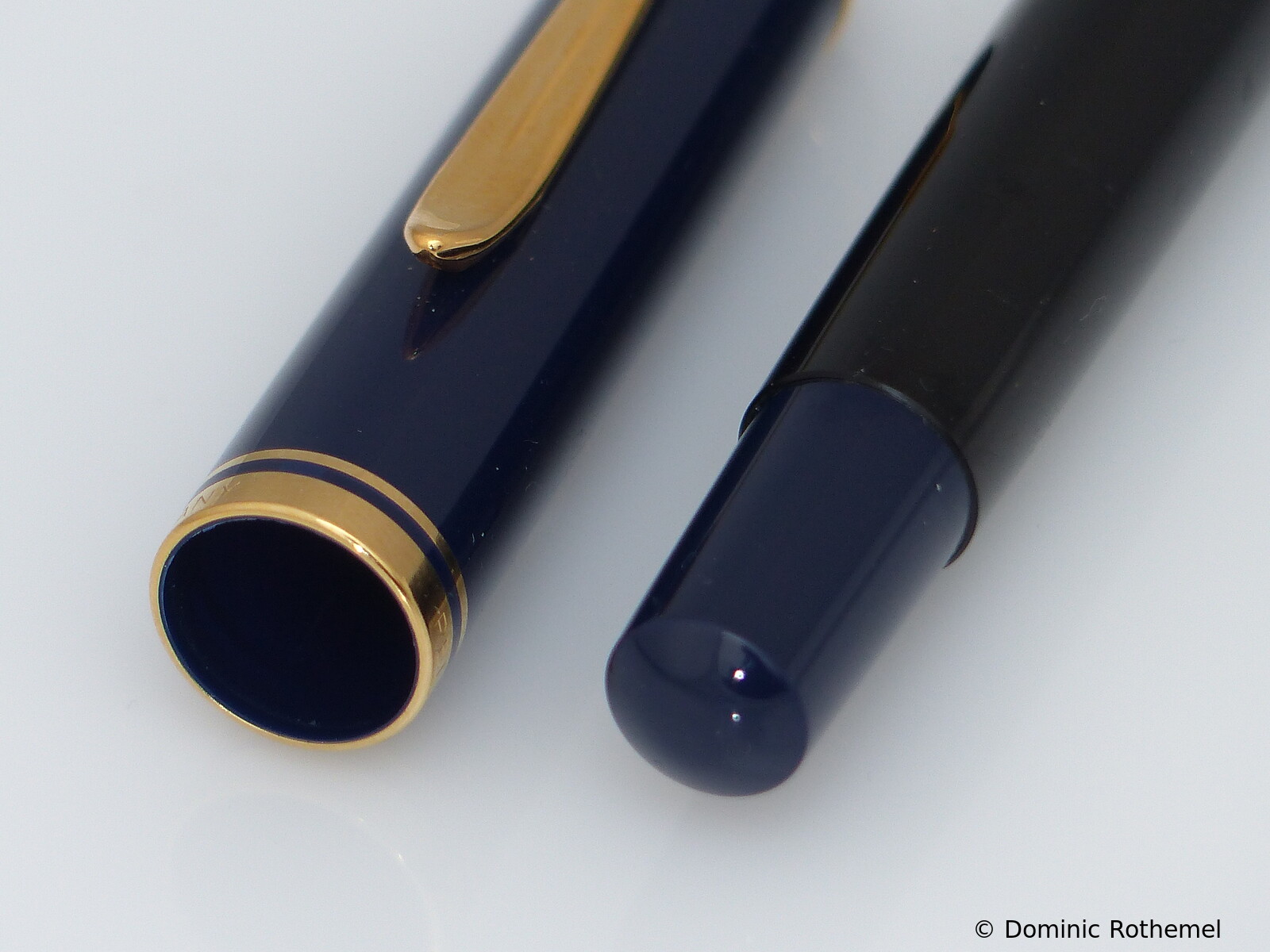 These cap inserts are identical to those of the M400 series, which are decorated with the logo and are held by a golden crown (clip ring). Since the M481 is the cheap version of the M400, he got the insignificant cap (the blind cap) instead of the golden crown, the logo disappeared. Later on, the M200 had the Pelikan logo on the cap. Initially it was screwed, later glued.
