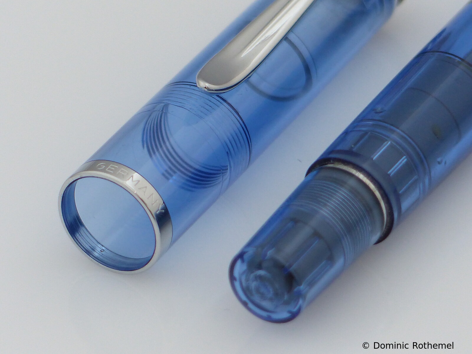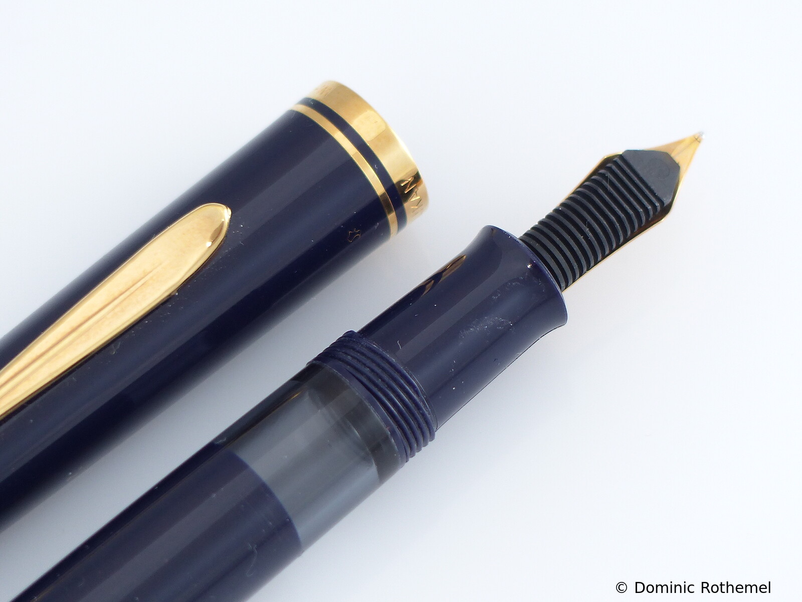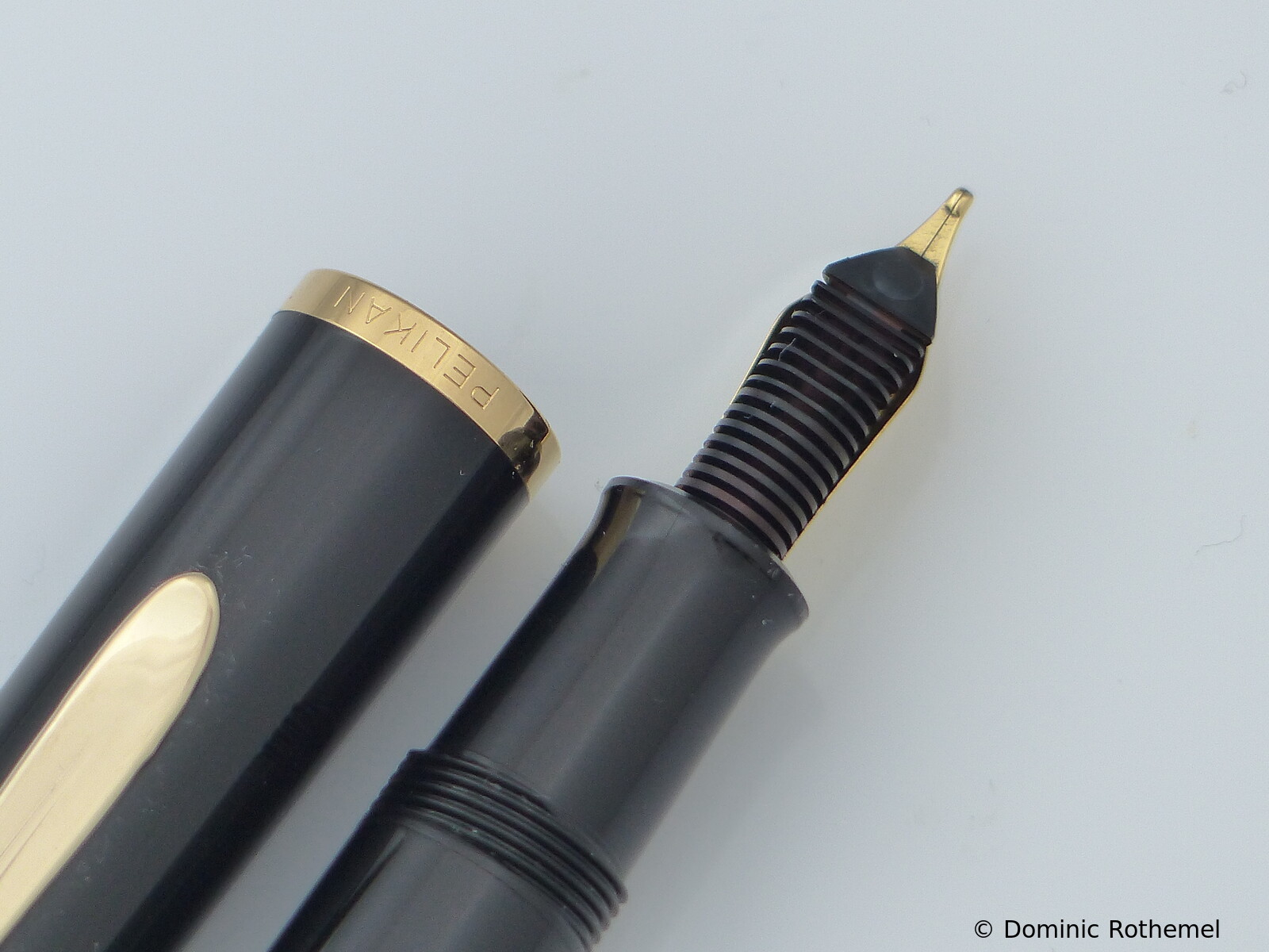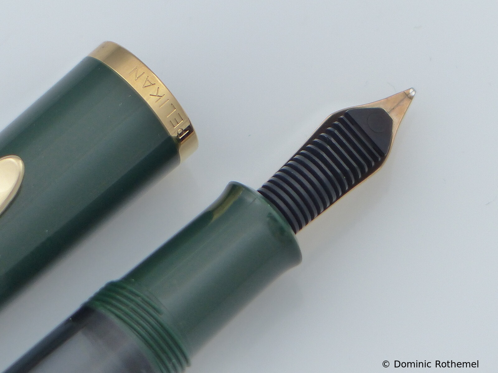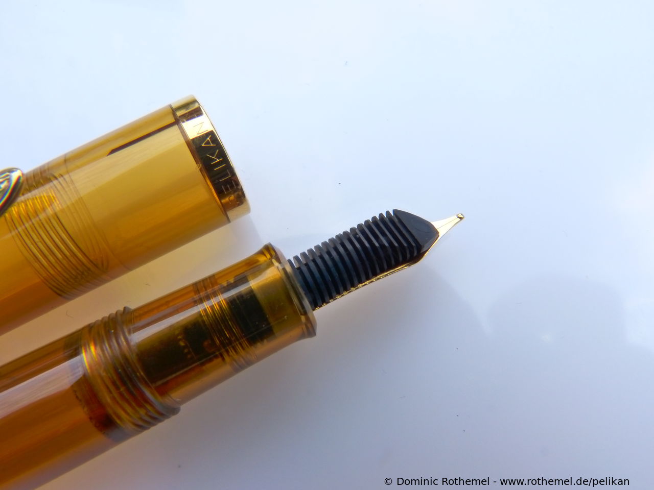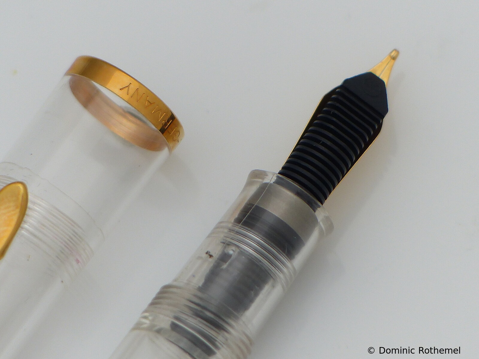 These cap inserts are identical to those of the M400 series, which are decorated with the logo and are held by a golden crown (clip ring). Since the M481 is the cheap version of the M400, he got the insignificant cap (the blind cap) instead of the golden crown, the logo disappeared. Later on, the M200 had the Pelikan logo on the cap. Initially it was screwed, later glued.