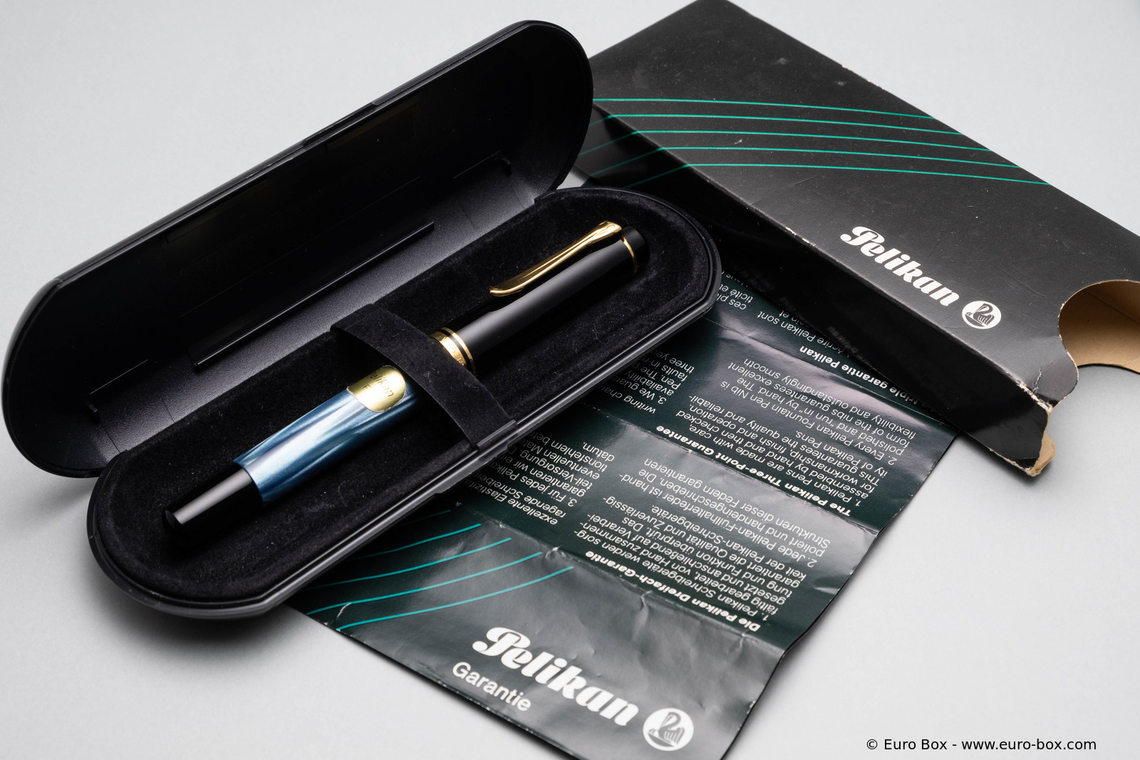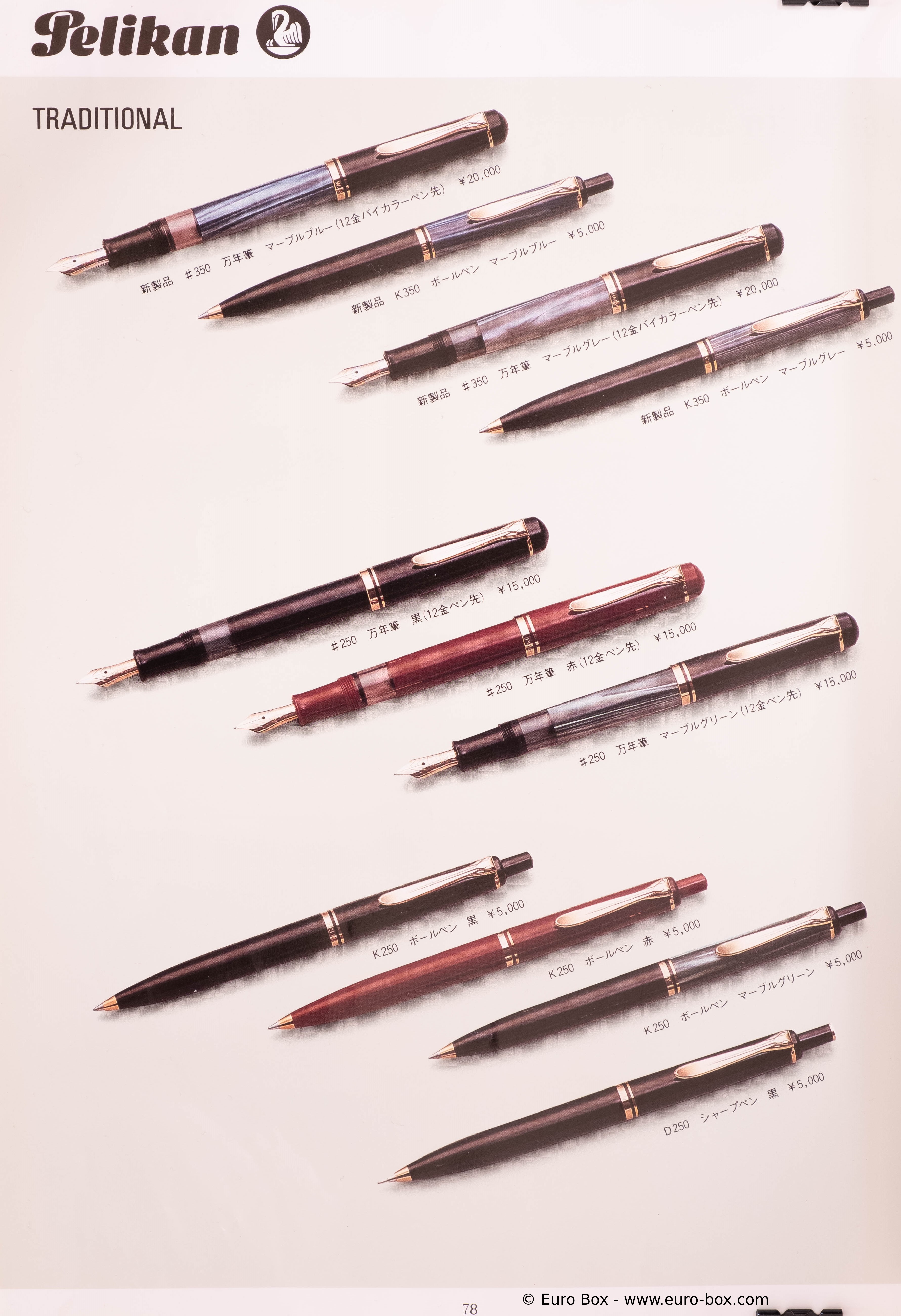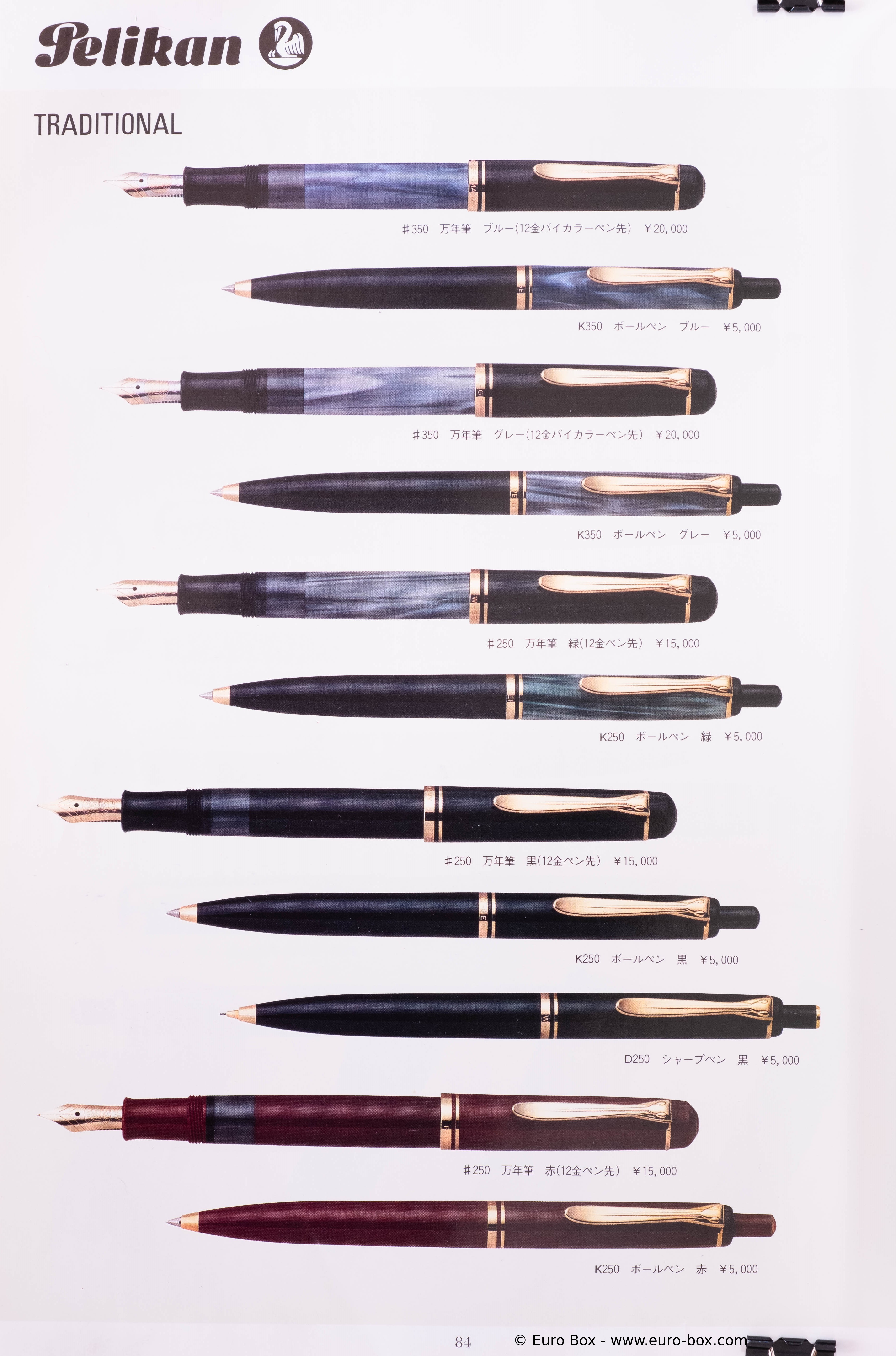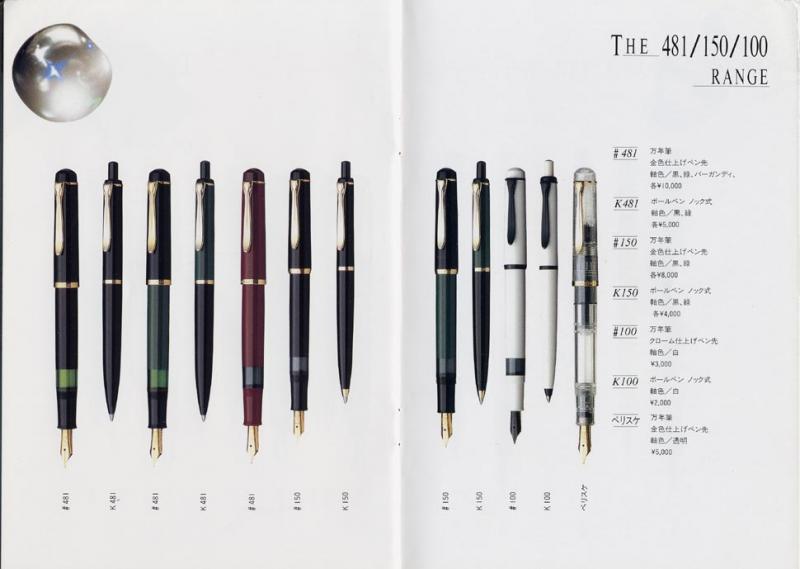 Item for export, the blue marbled M250 (with 14 ct gold nib) is documented in a Japanese leaflet.
