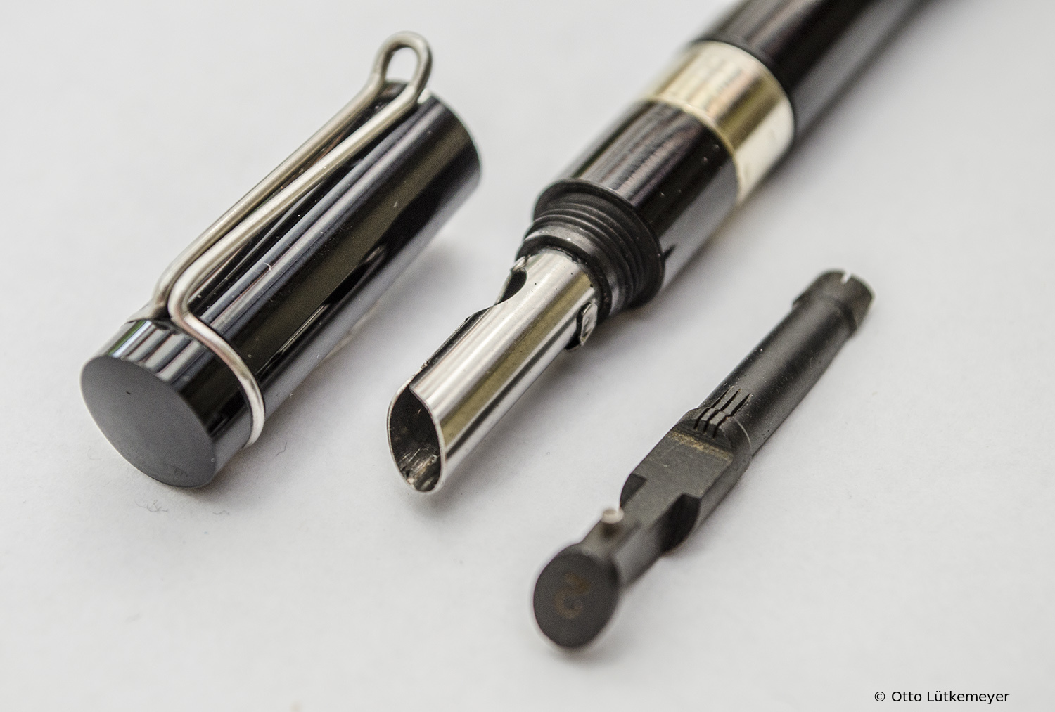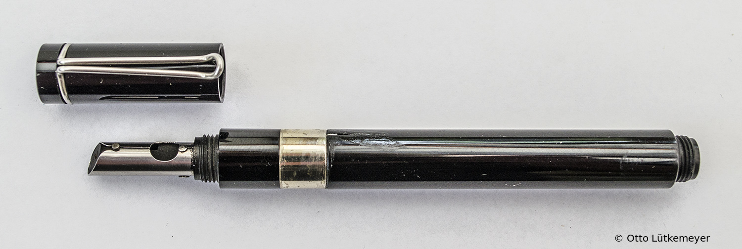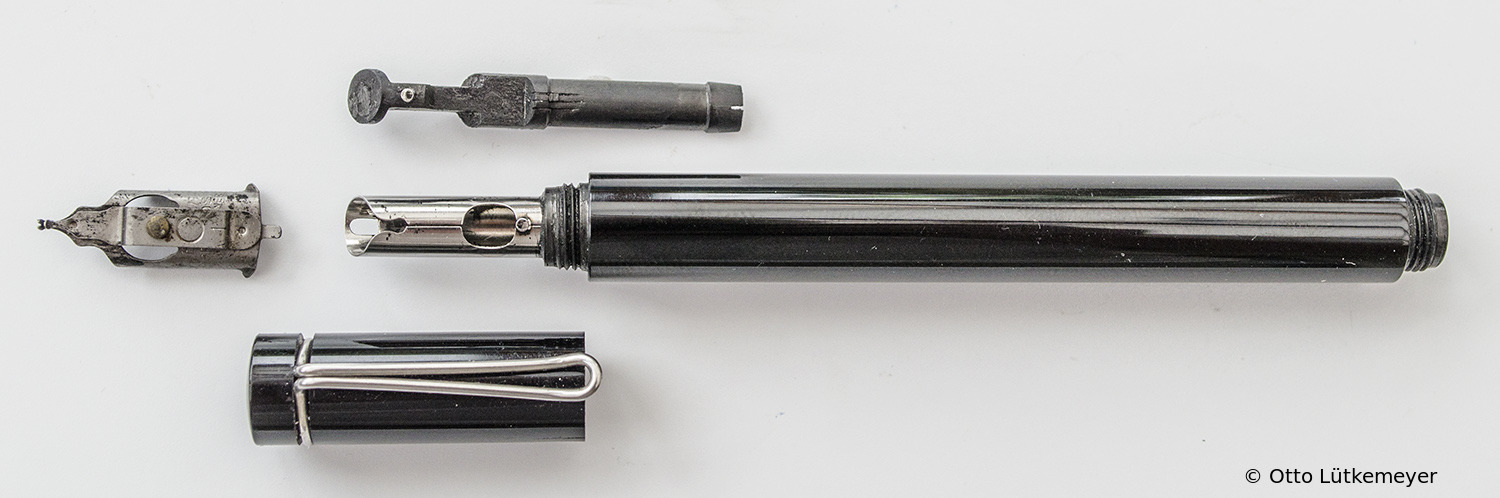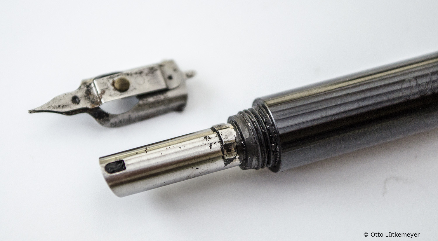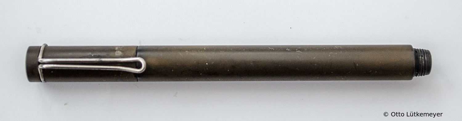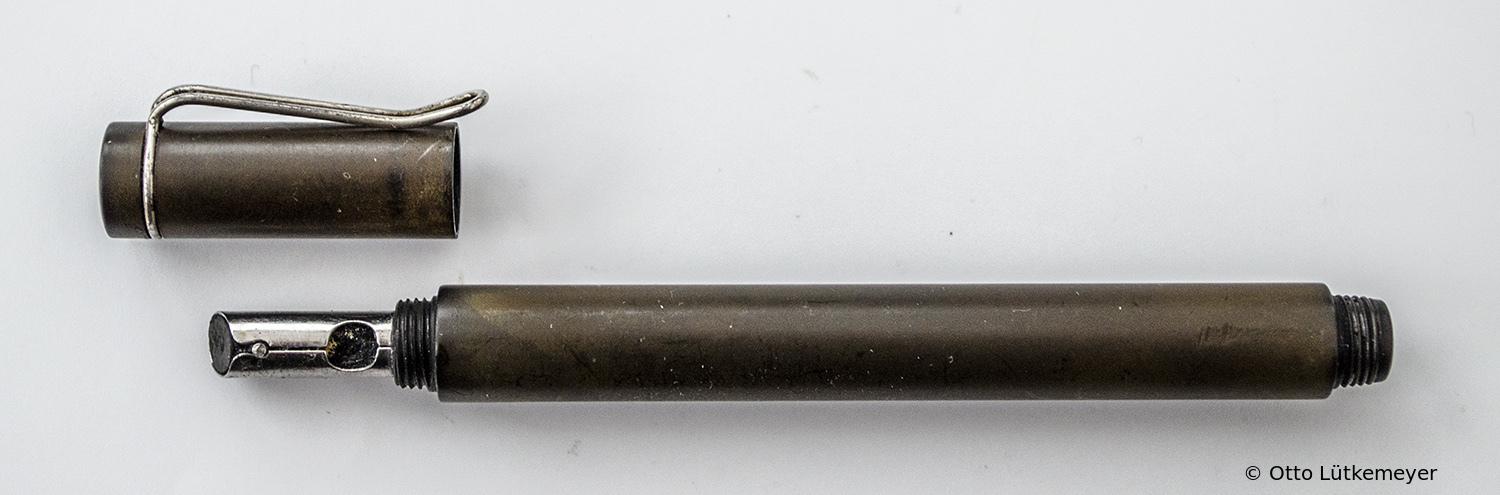 As a distinction to the usual Graphos holders this specimen has a metallic portion (about 7 mm wide), which then merges into the barrel from plastic. This metal part is not just a decorative ring, but massively. While the barrel serves as the ink reservoir at the Graphos previously known, the ink reservoir ends with this pen in the metal part. A round metal mandrel then establishes the further connection to the end of the solid plastic. The depth of the ink tank thus is reduced from 69 mm to 21 mm, the ink absorption of 1.6 ml to 0.5 ml.