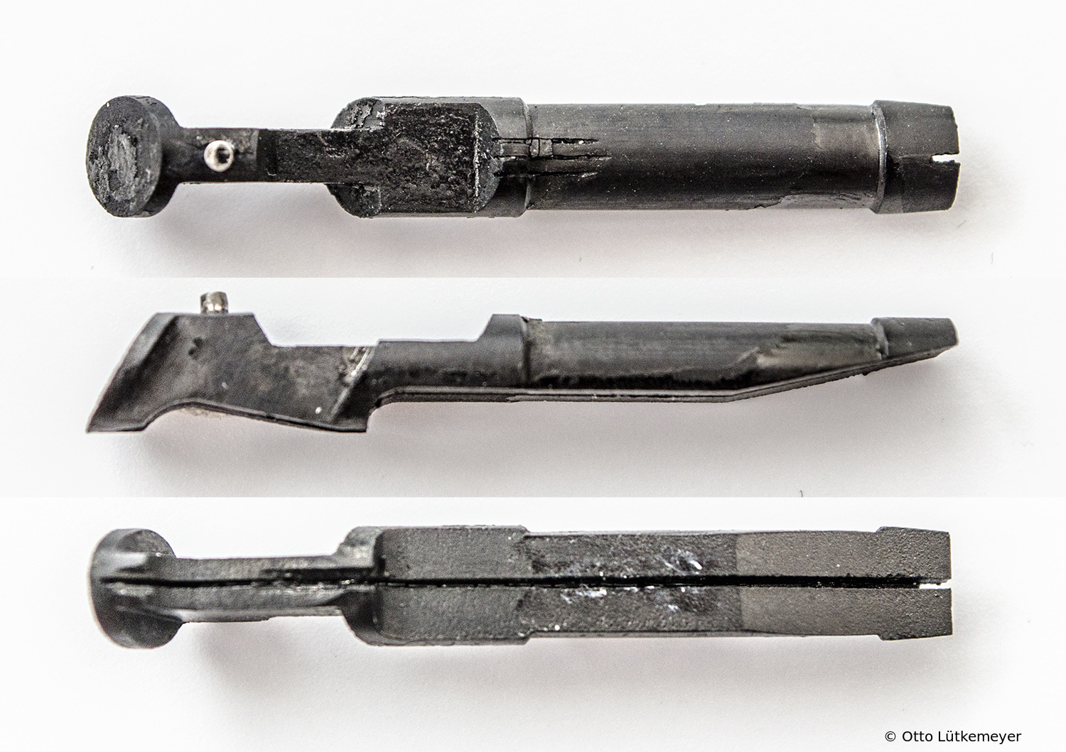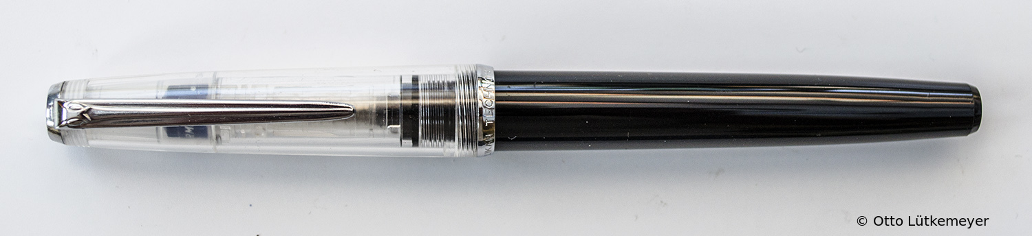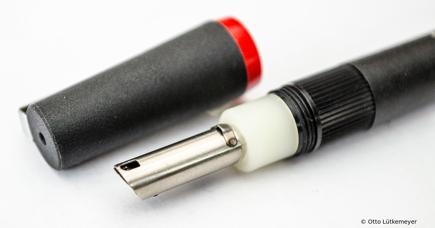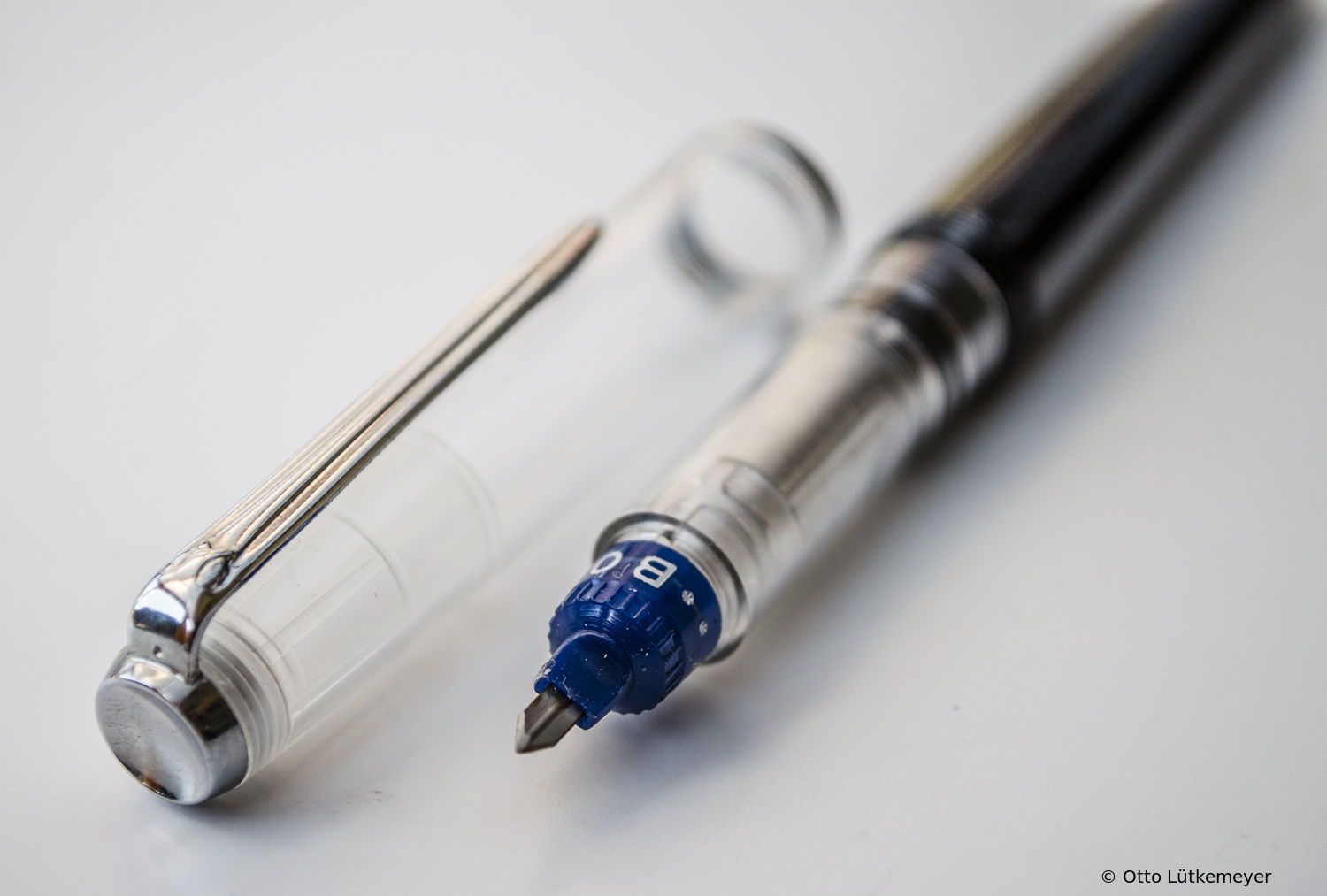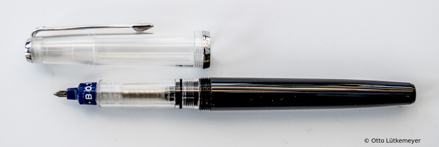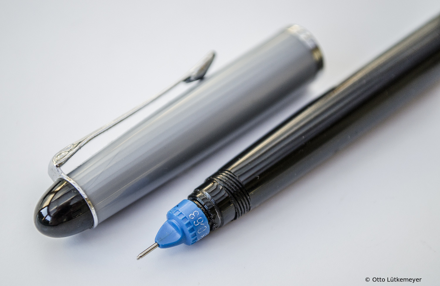 As a distinction to the usual Graphos holders this specimen has a metallic portion (about 7 mm wide), which then merges into the barrel from plastic. This metal part is not just a decorative ring, but massively. While the barrel serves as the ink reservoir at the Graphos previously known, the ink reservoir ends with this pen in the metal part. A round metal mandrel then establishes the further connection to the end of the solid plastic. The depth of the ink tank thus is reduced from 69 mm to 21 mm, the ink absorption of 1.6 ml to 0.5 ml.
