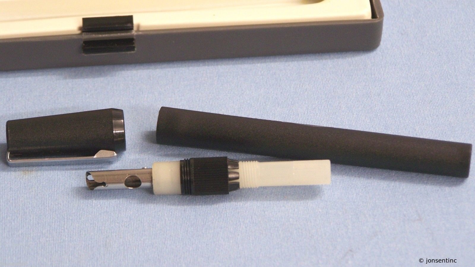 With the introduction of ink cartridges the GRAPHOS was fundamentally redesigned. The barrel could accommodate 2 ink cartridges. Instead of a nib, a nozzle (mouthpiece) was screwed on to the front end of the grip section. The nozzle could be changed quickly and without much effort. Thre were many different nozzles available for writing or line drawing.