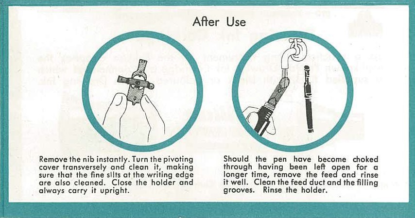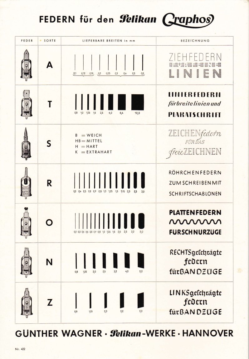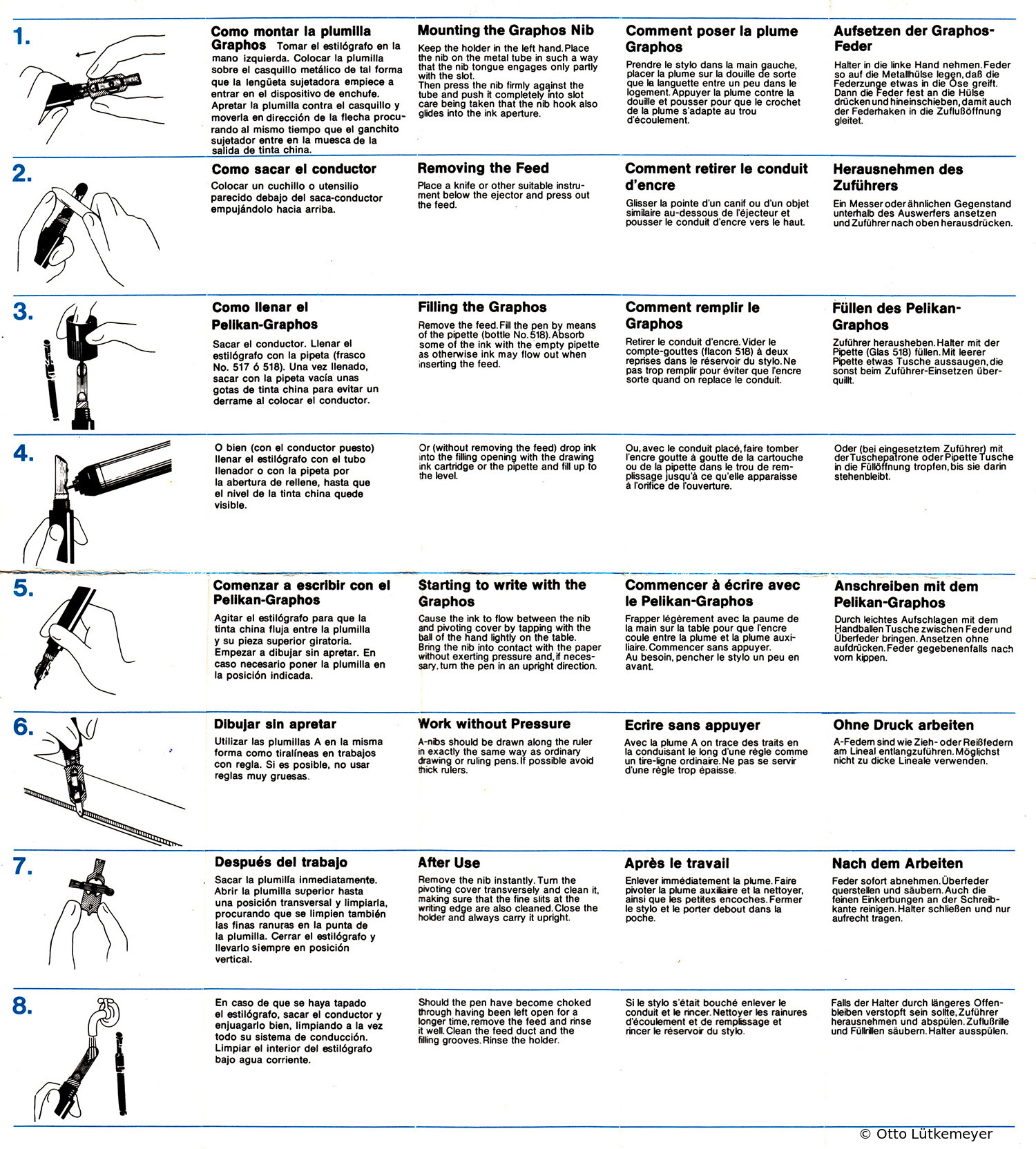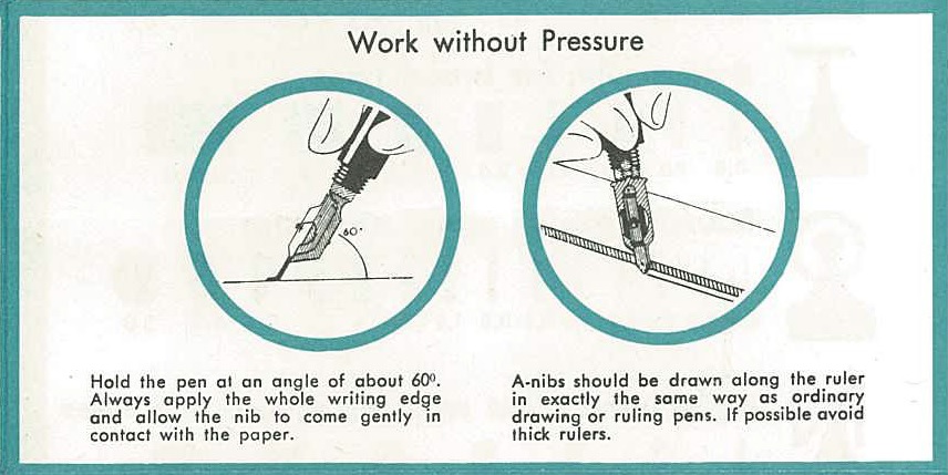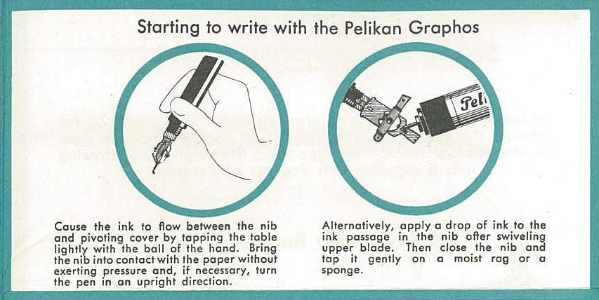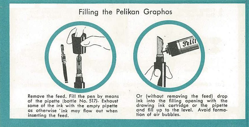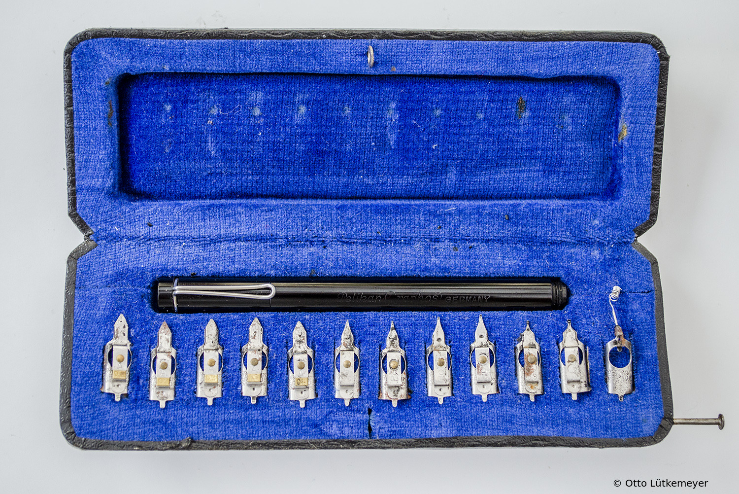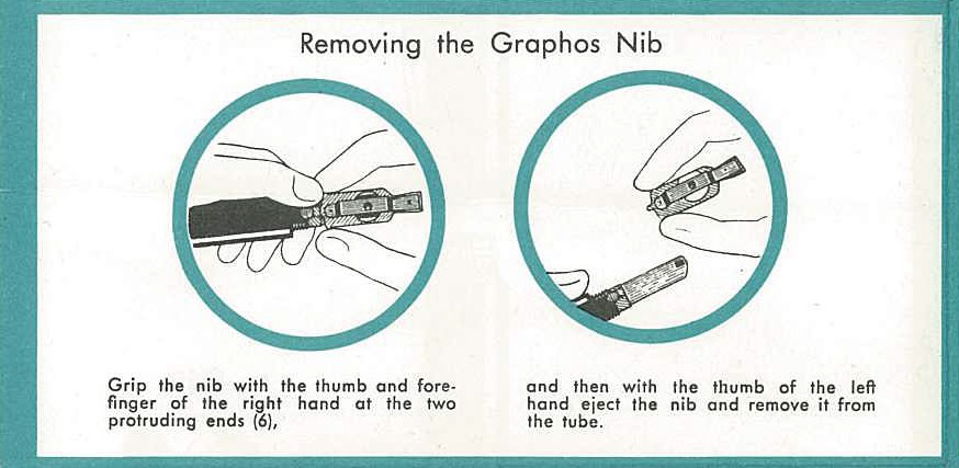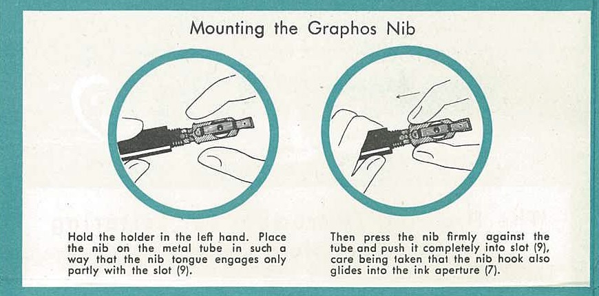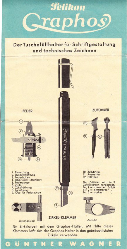 The first pen for technical drawings, the GRAPHOS consisted of a pen, the barrel of which could be filled with ink. The tip ended up in a tube (called the ejector), which could accommodate a variety of nibs. There was a large number of nibs available, depending on the use for which they were needed. The nib was supplied with ink through the feeder, which reached through the ejector into the holder. To fill the pen with ink, the feeder was taken out of the ejector and then the ink was inserted through the opening with an eyedropper.