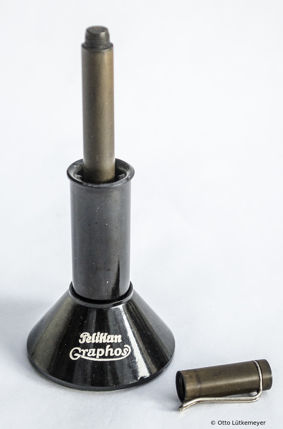 An improved development of GRAPHOS was prepared in the Pelikan plant of Mexico. The function with ejector to accommodate the nib and feeder of the ink was unchanged. Now, there was a feeder with ramp metering: weak, moderate and severe inflow. New was the separation of the long barrel from the grip. By turning outside the grip section, the container for receiving the ink is visible.