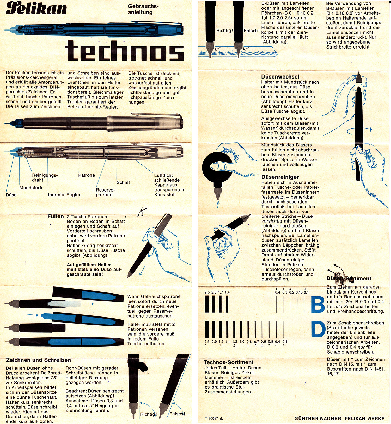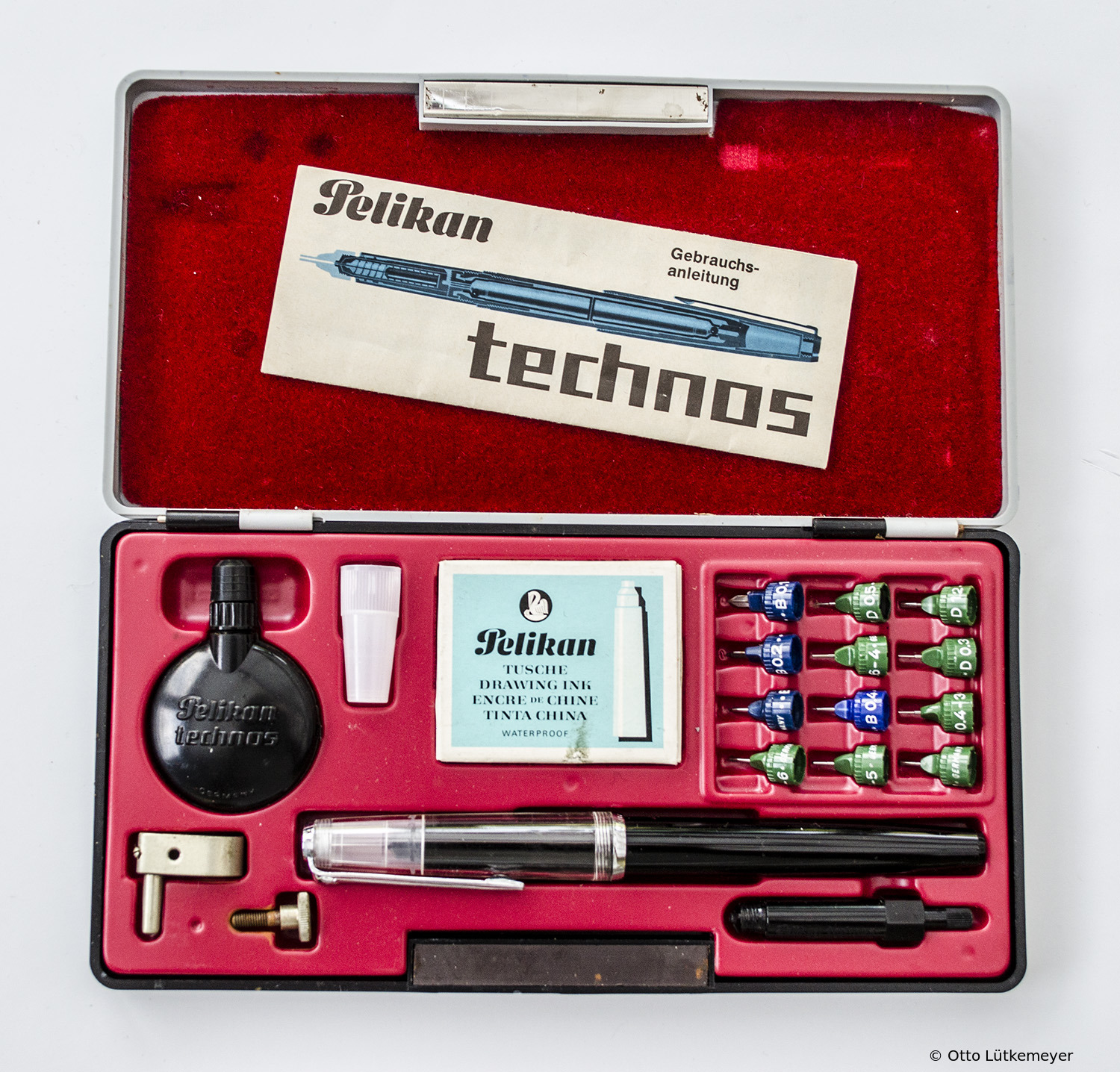 In 1934 (quite early in the development of such drawing instruments) Pelikan developed a drawing pen to meet the requirement for technical drawings with long, smooth lines. The pen could hold a larger amount of ink and feed it continuously to the nib.