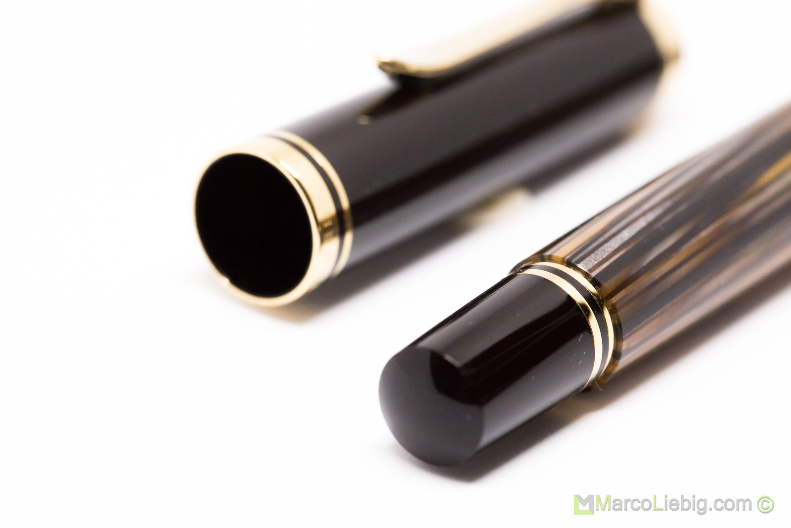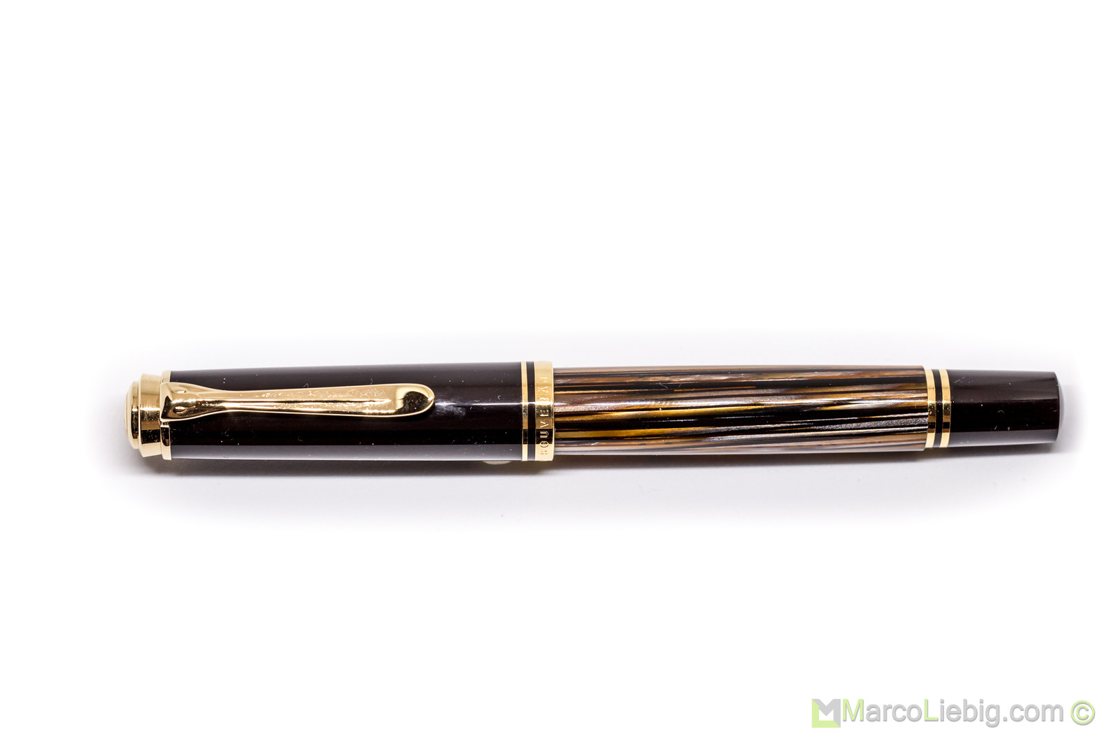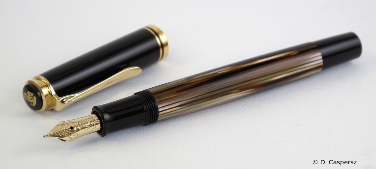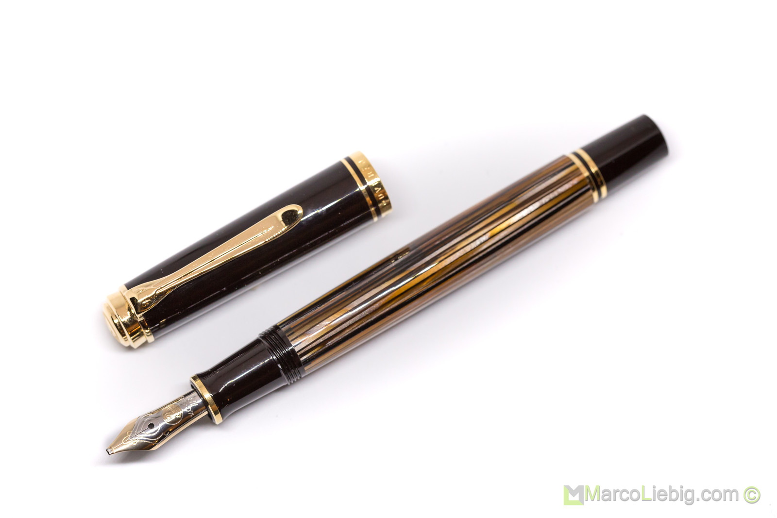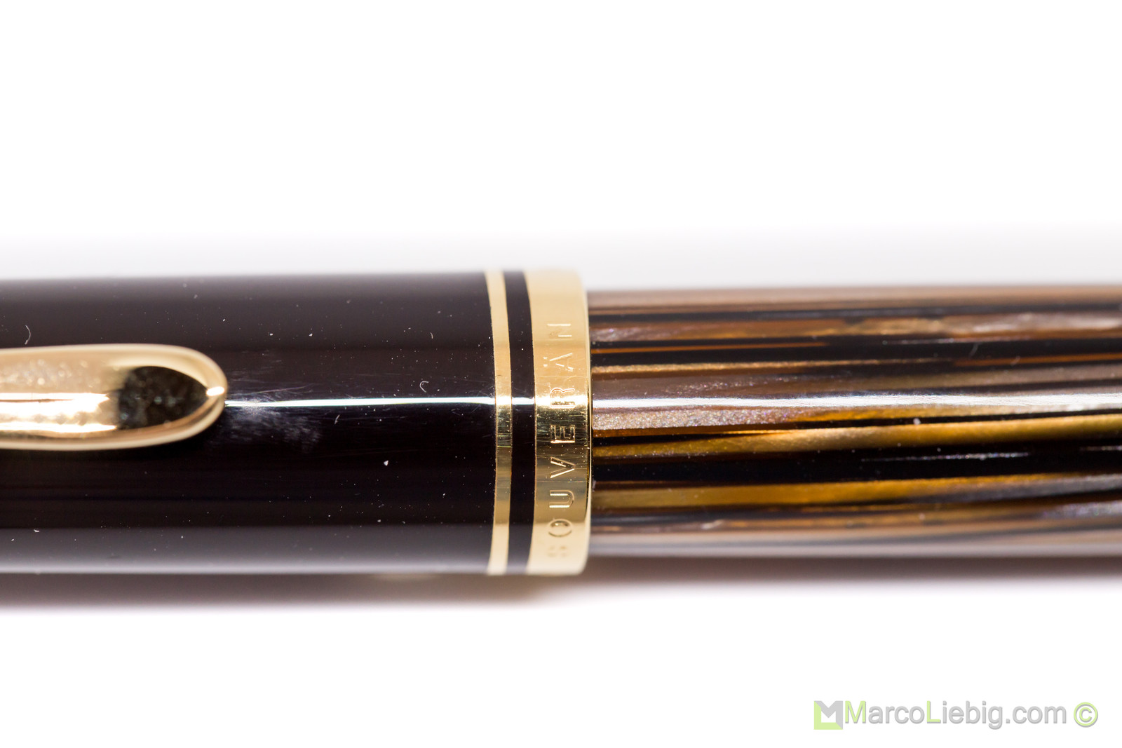 This model is a Special Edition of the brown tortoise striped M400 and has no ring at the filling knob. The nib style is the typical design as with the M400 model, but without the rhodium bi-color plating, so the nib color is yellow gold.