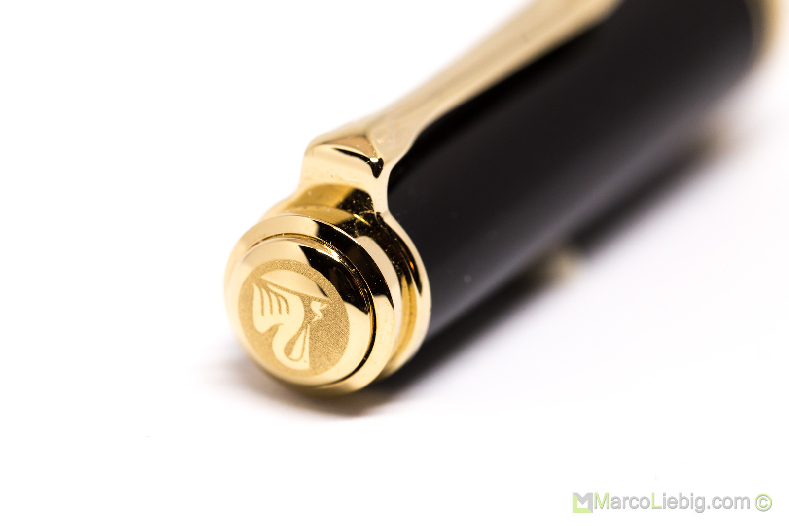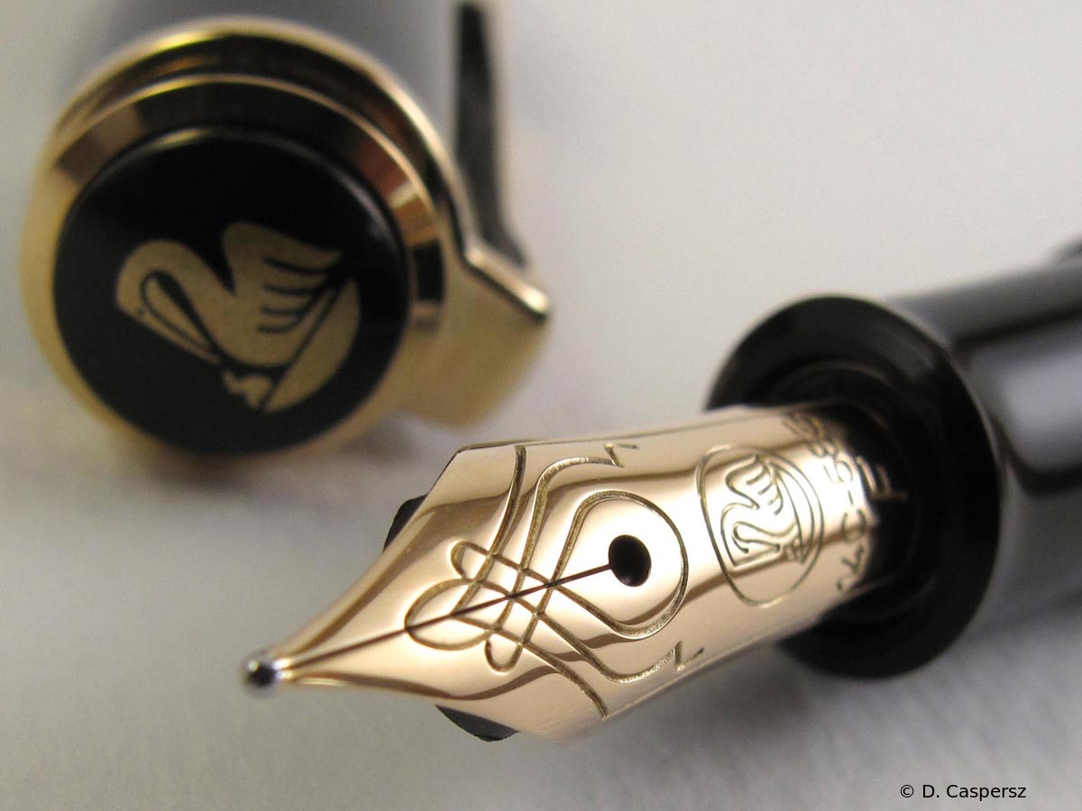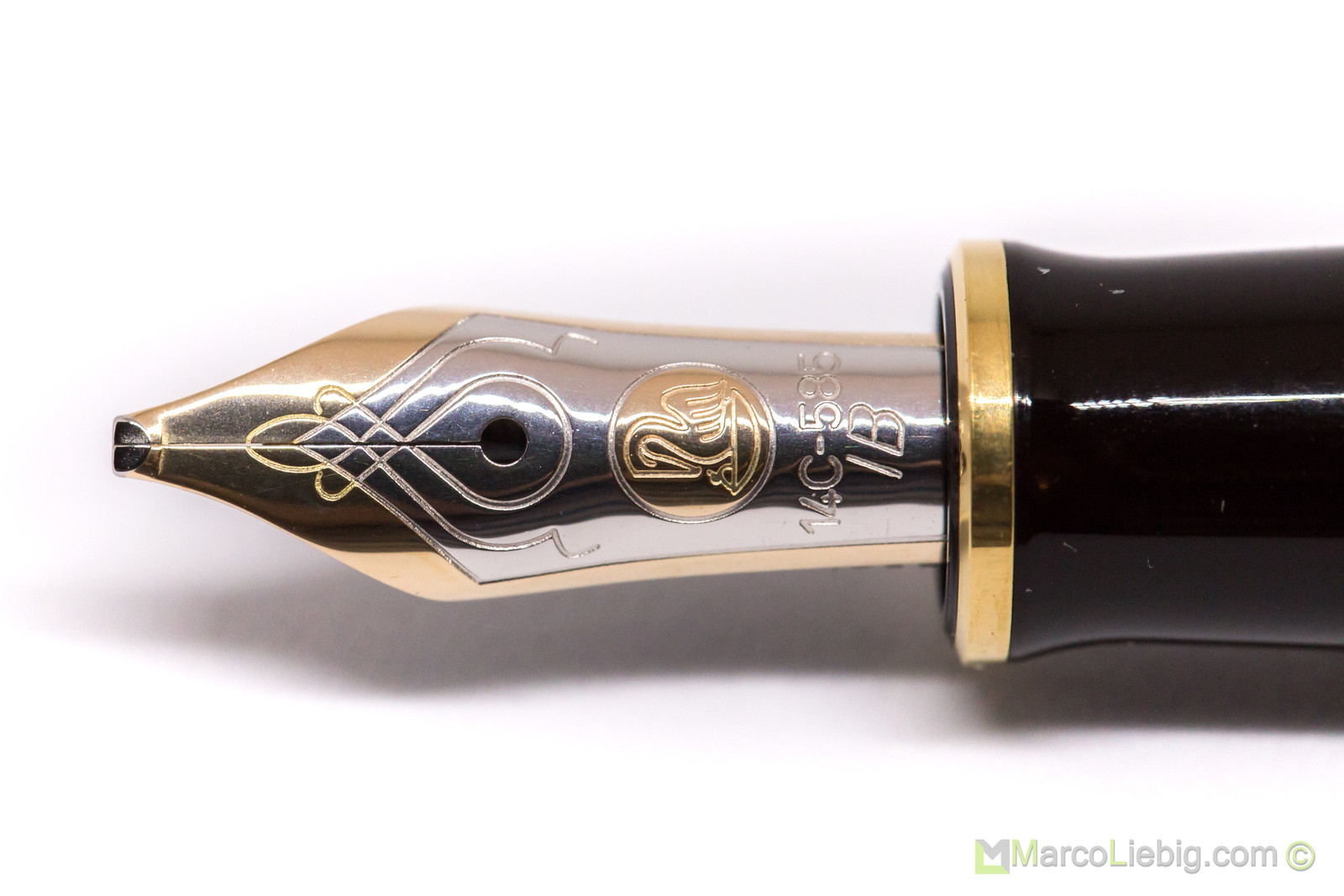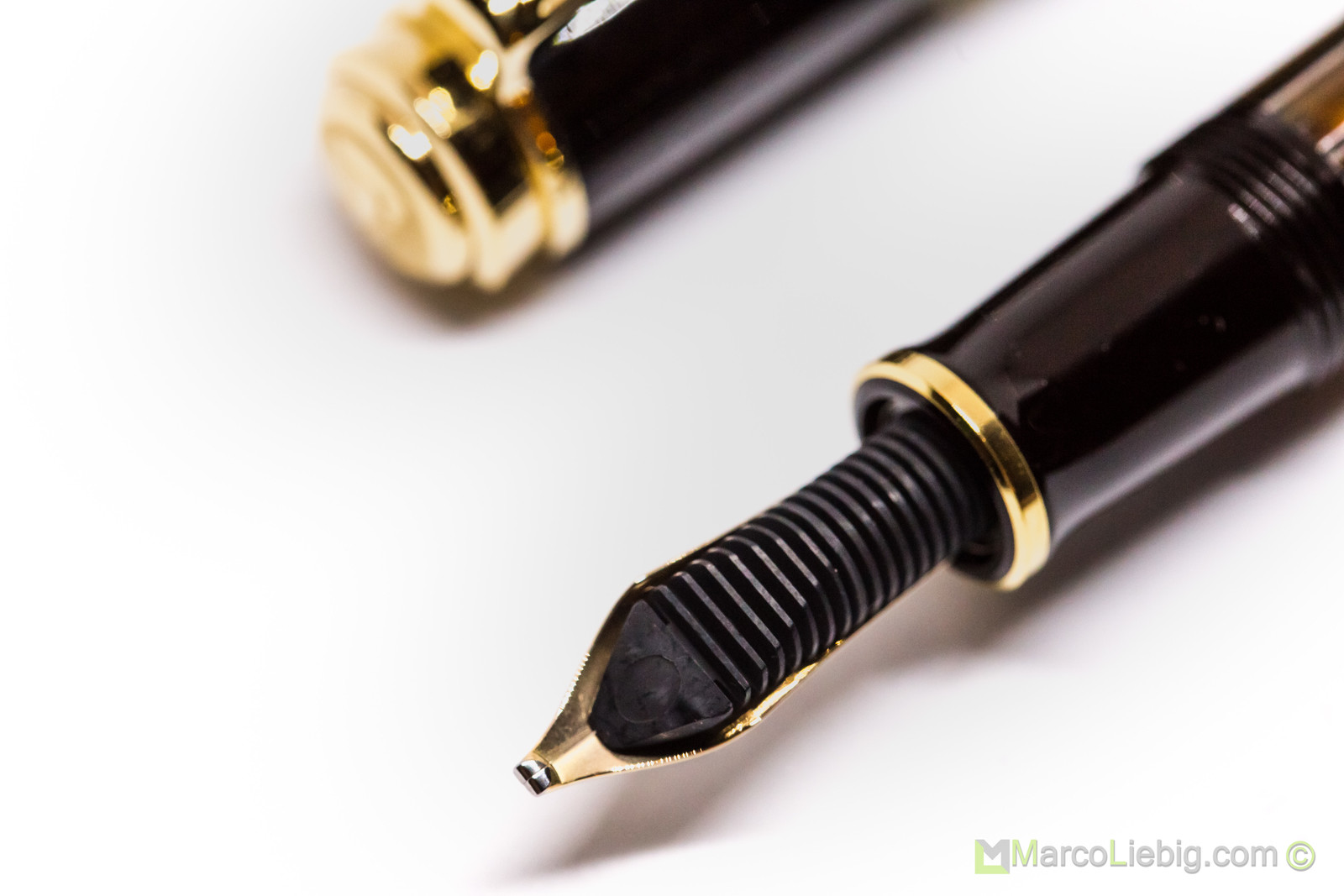 This model is a Special Edition of the brown tortoise striped M400 and has no ring at the filling knob. The nib style is the typical design as with the M400 model, but without the rhodium bi-color plating, so the nib color is yellow gold.