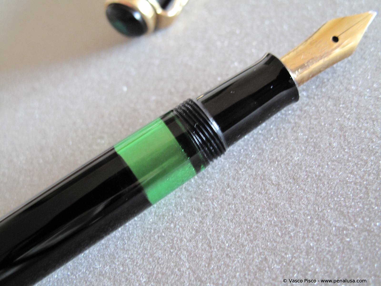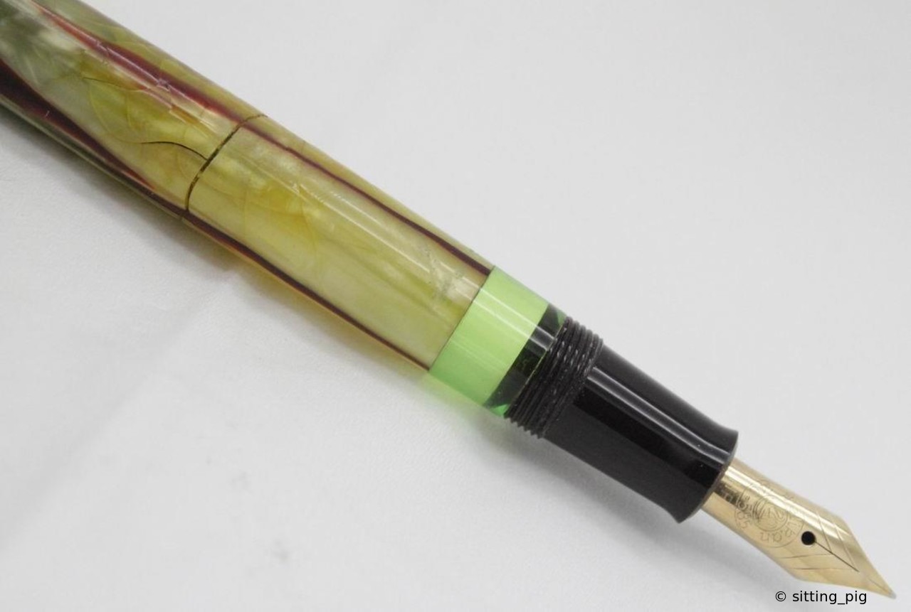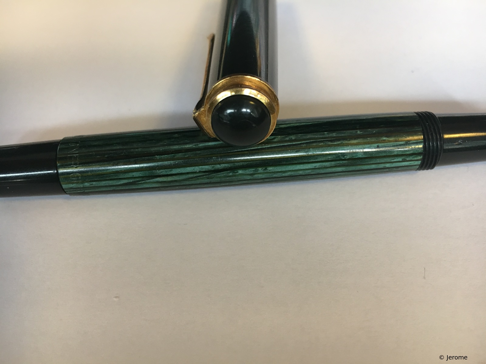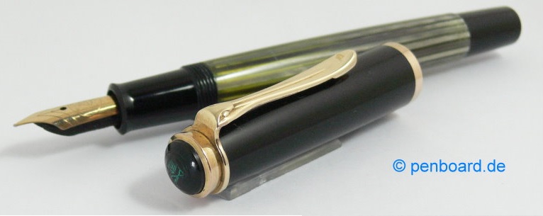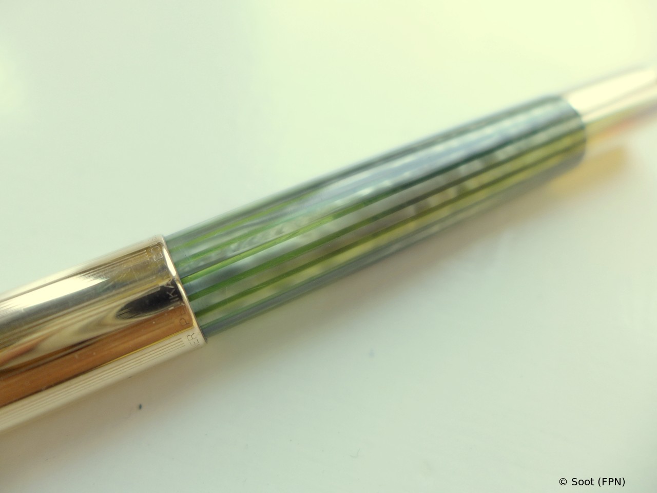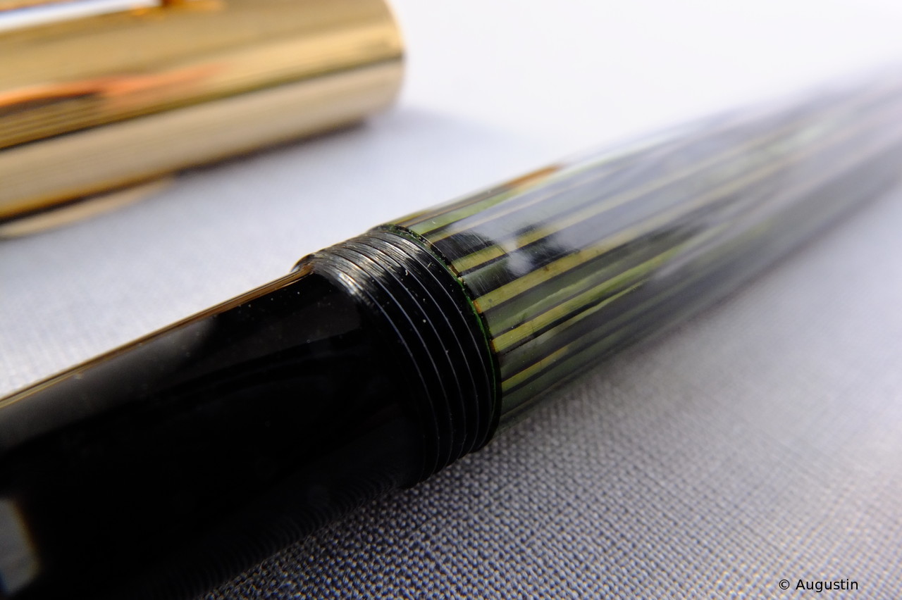 Sea green, the strips are olive-green and black belted. The cap and the filling knob is made from 14 carat gold.