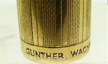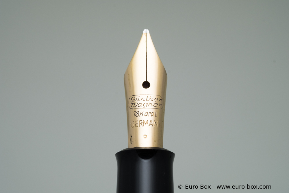 A very exciting variant of the model Pelikan 400 comes with an 18 carat nib with the inscription Günther Wagner, missing logo on the cap top and a caption at the end of the barrel with unusually large letters.