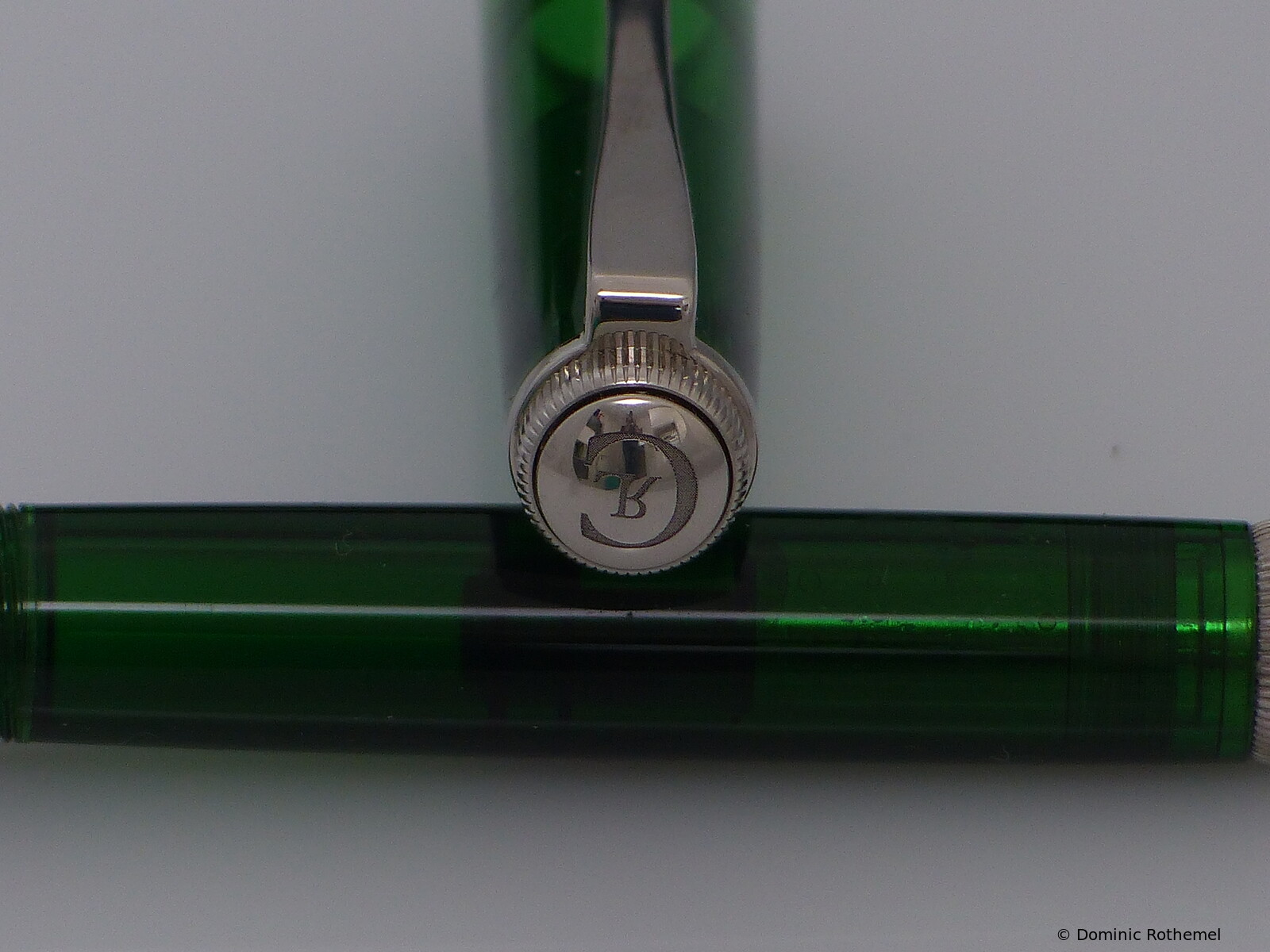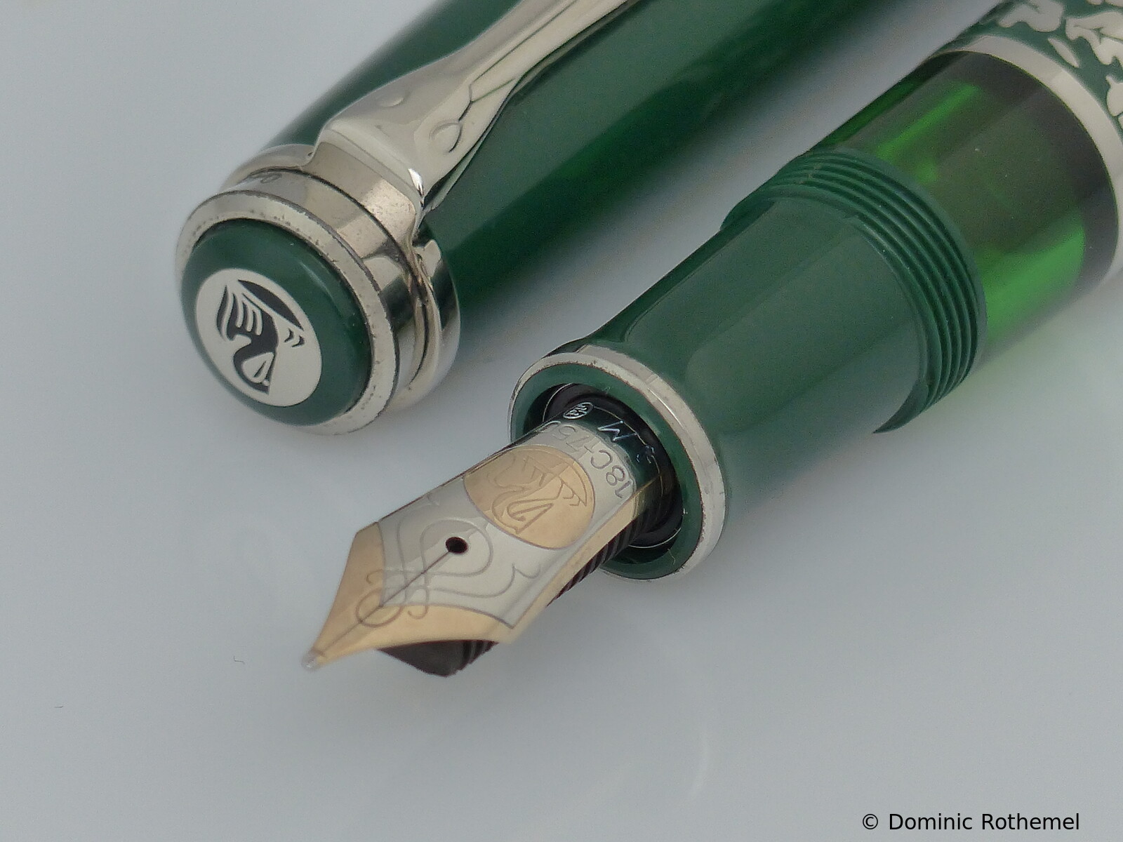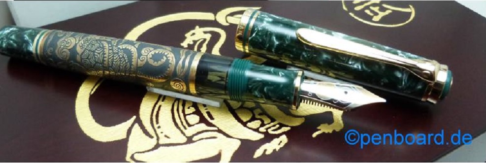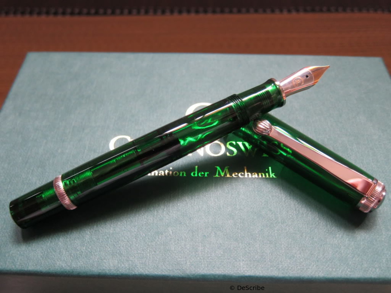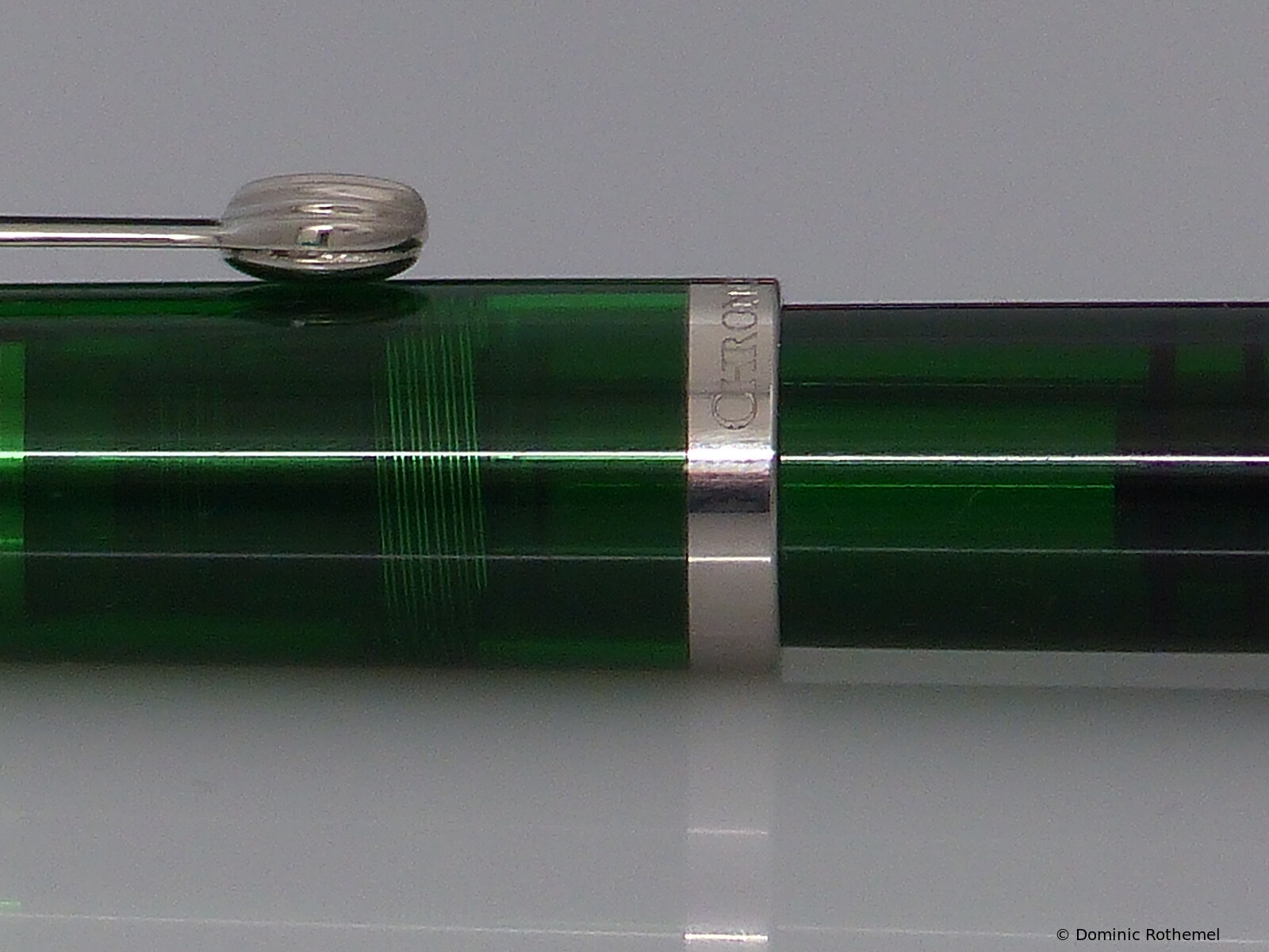 Modified version based on the M800 in dark green transparent. Supplied with a second nib to change (in the sizes M + B). Also, the nib is modified. The production by Pelikan is not apparent. Logo displays the C from Chronoswiss.