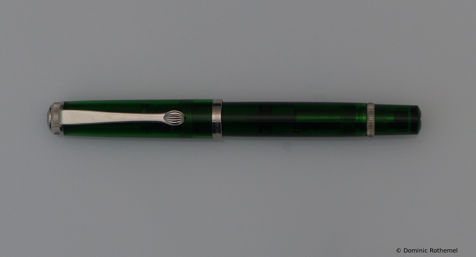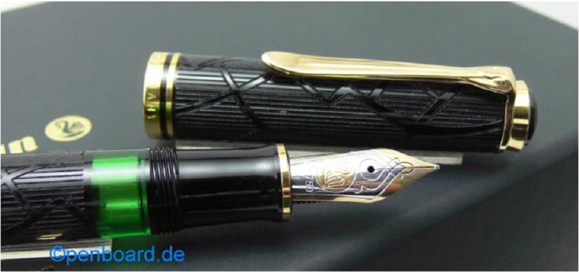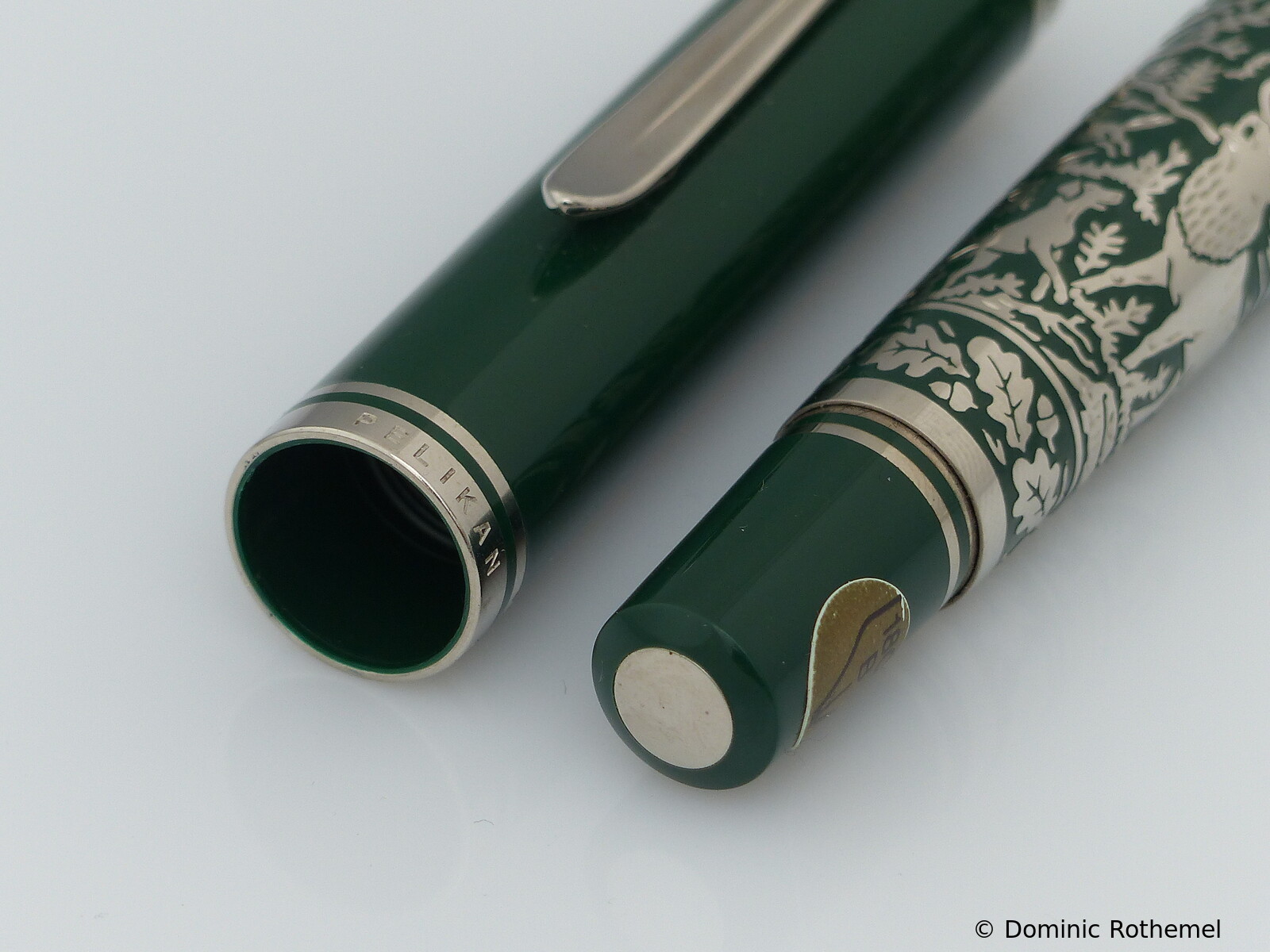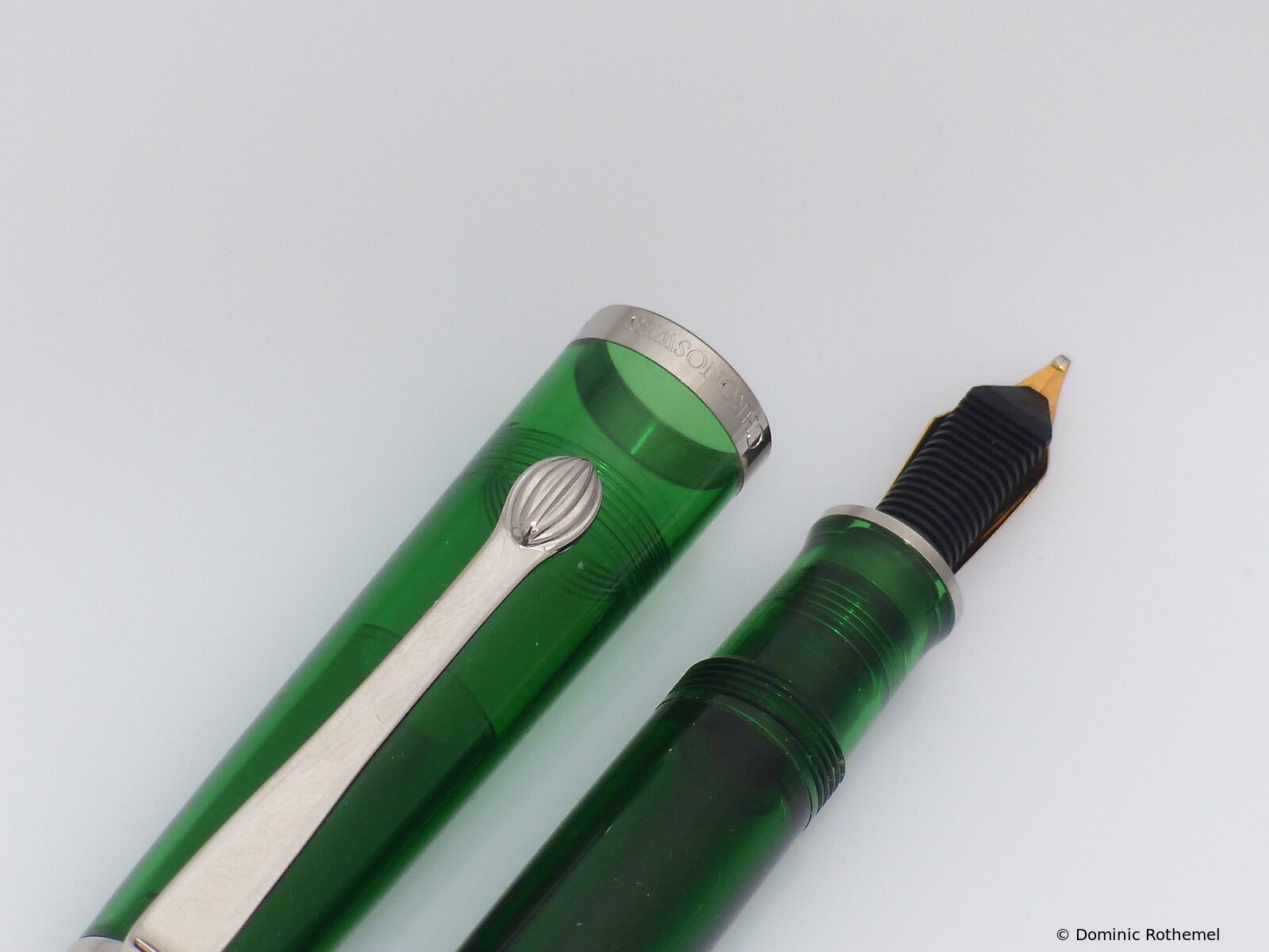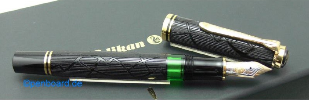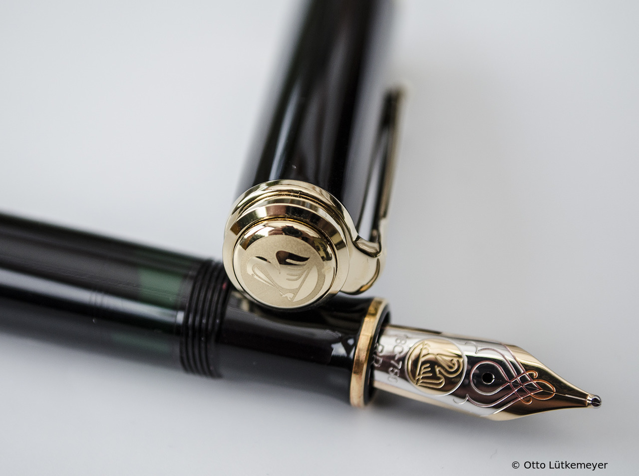 Modified version based on the M800 in dark green transparent. Supplied with a second nib to change (in the sizes M + B). Also, the nib is modified. The production by Pelikan is not apparent. Logo displays the C from Chronoswiss.