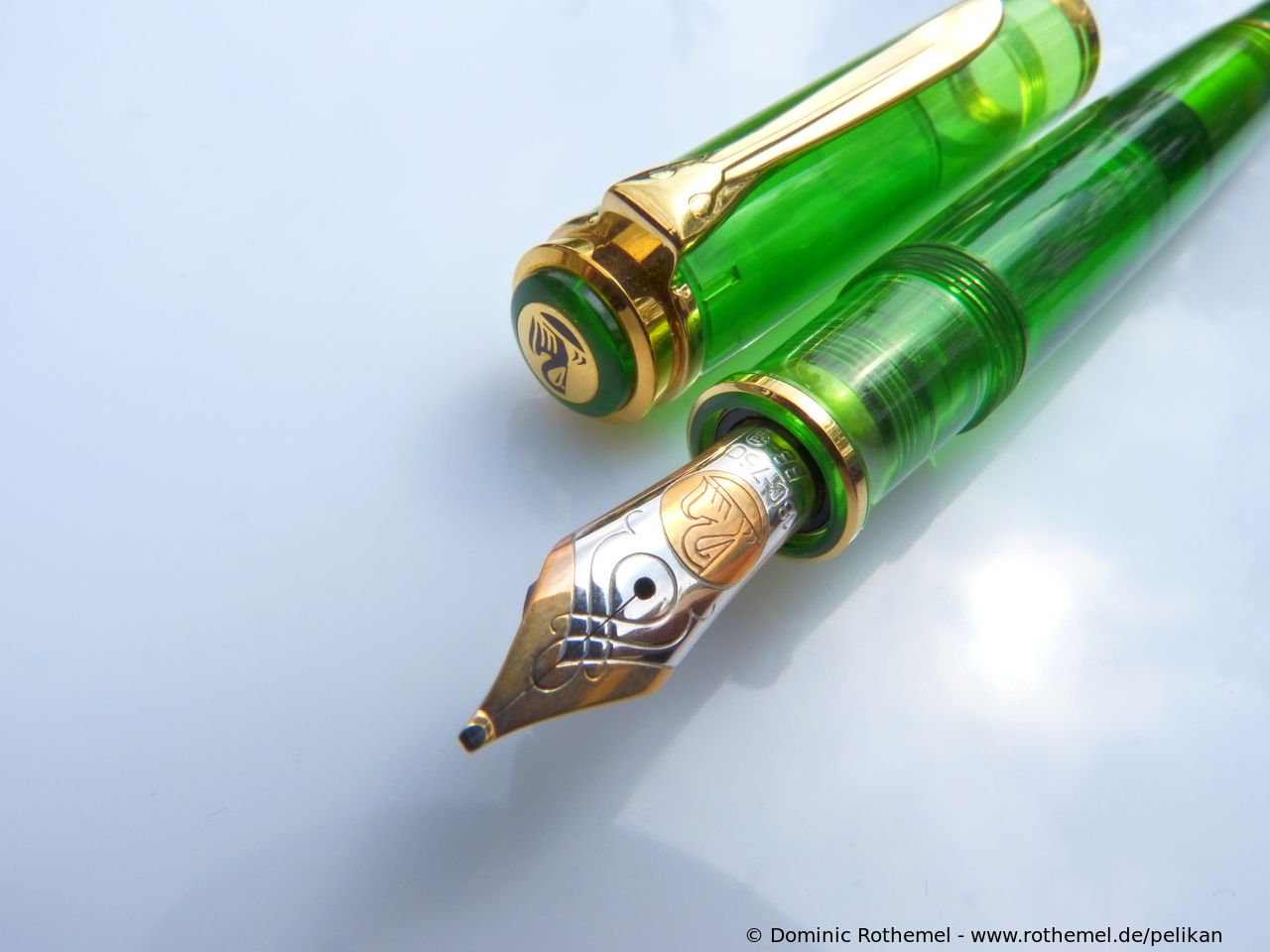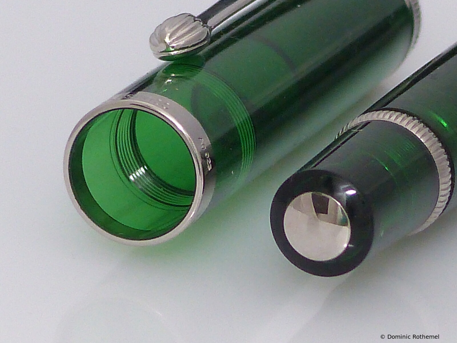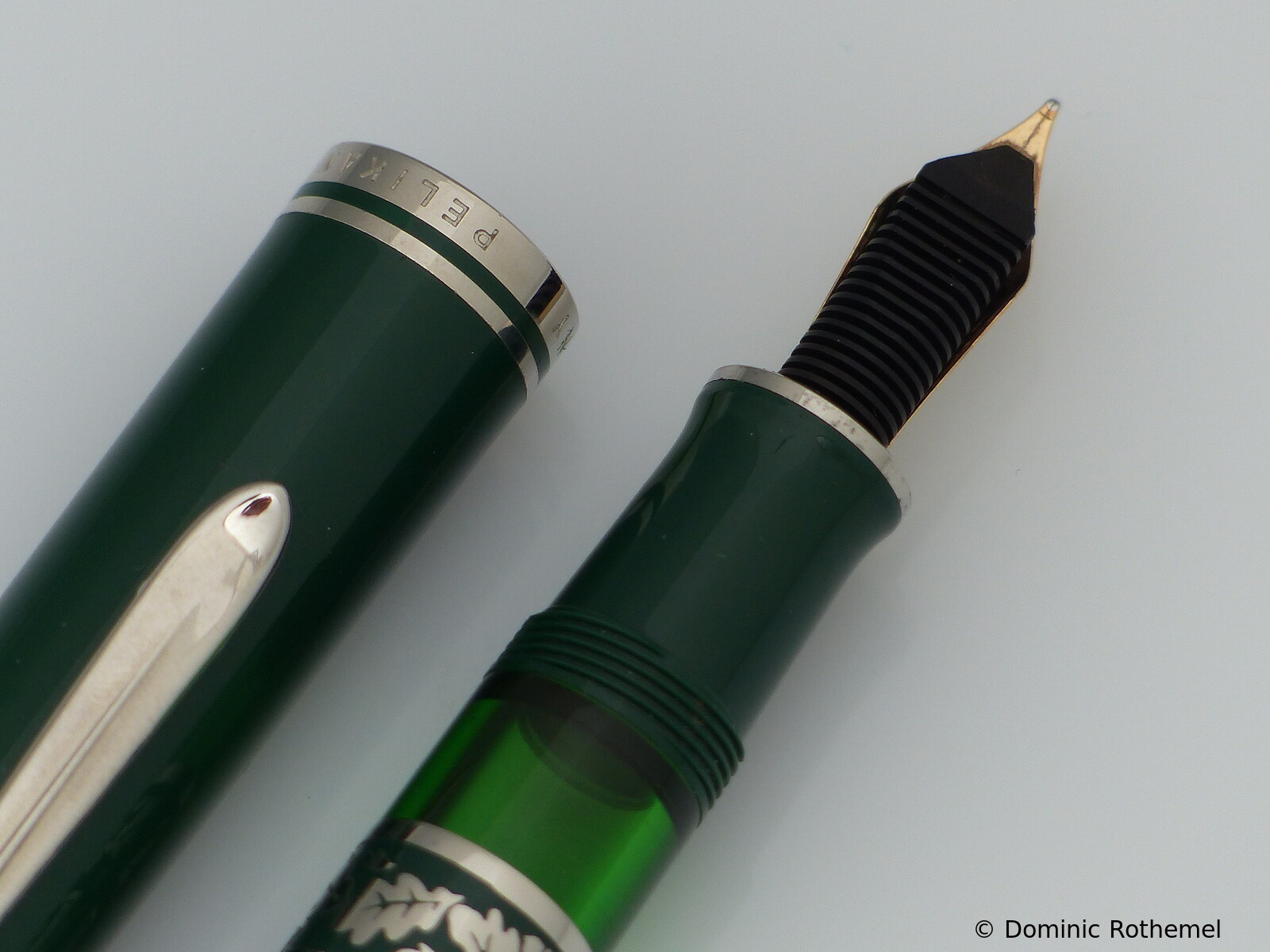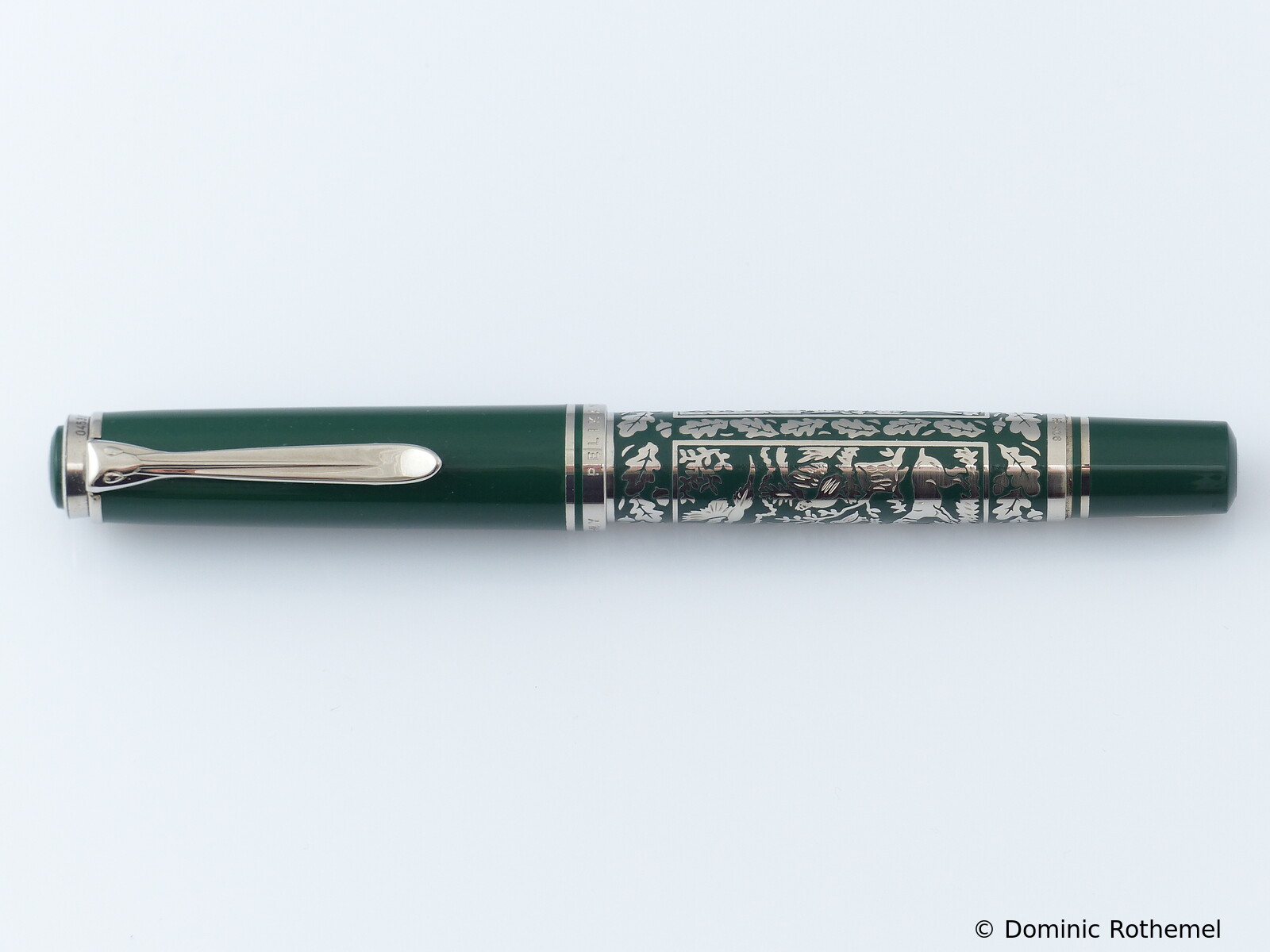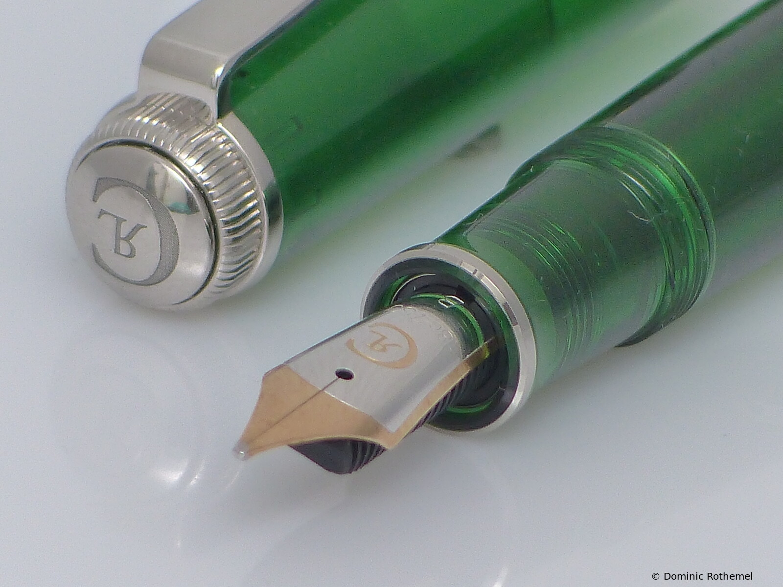 Modified version based on the M800 in dark green transparent. Supplied with a second nib to change (in the sizes M + B). Also, the nib is modified. The production by Pelikan is not apparent. Logo displays the C from Chronoswiss.