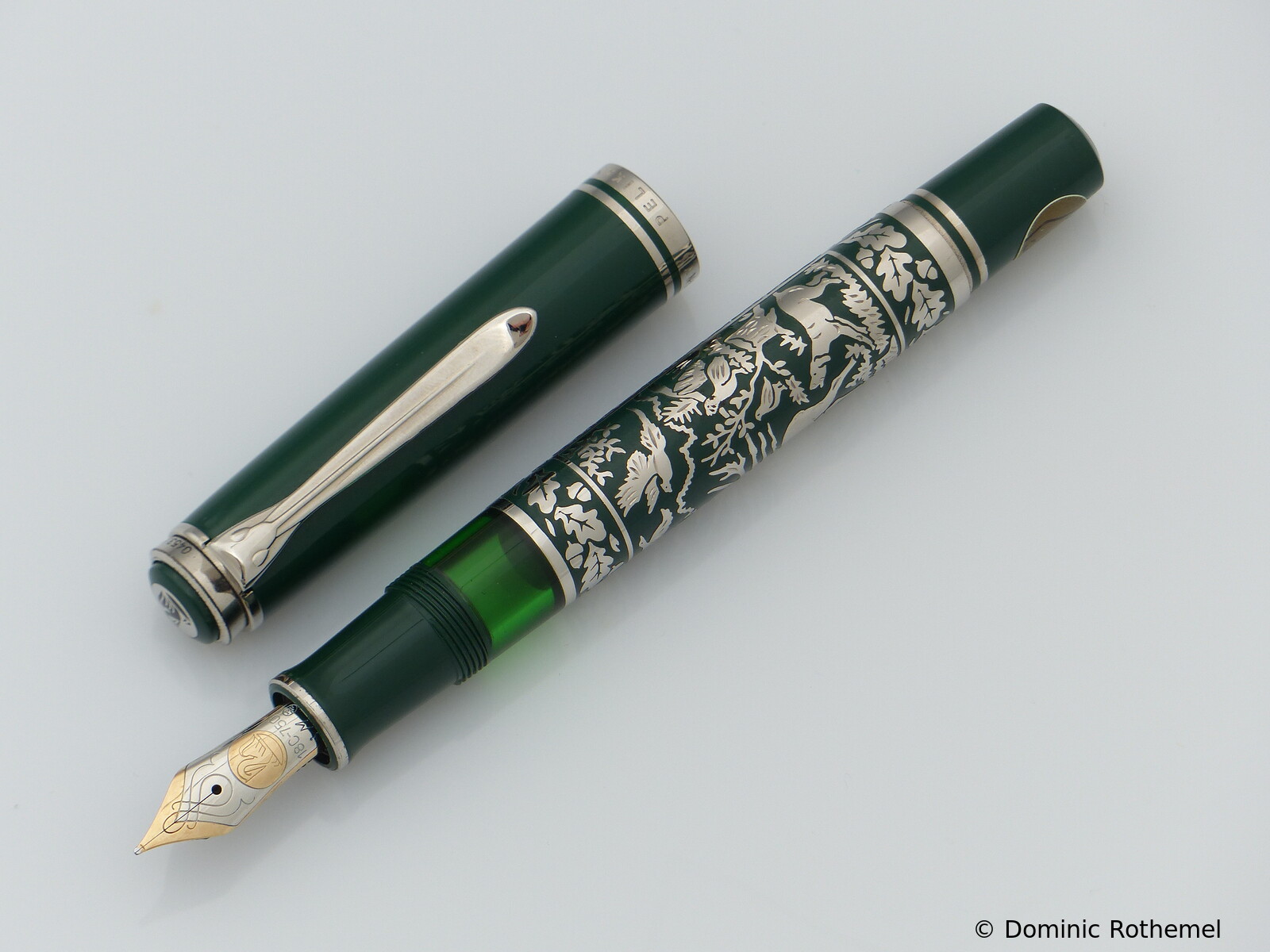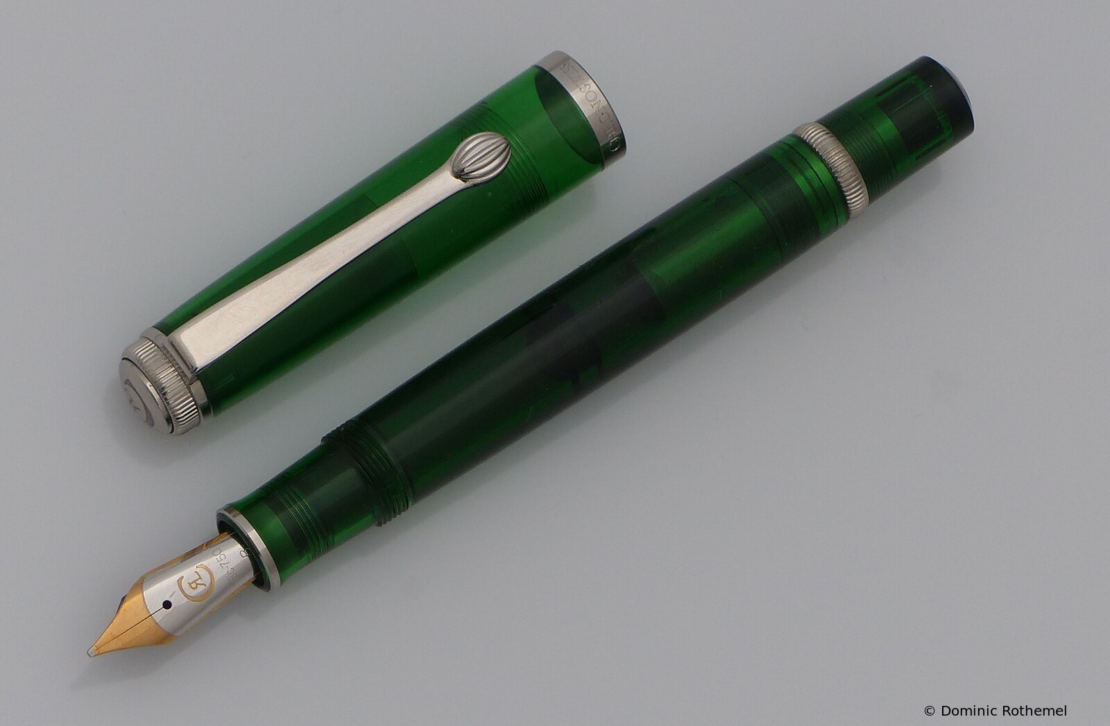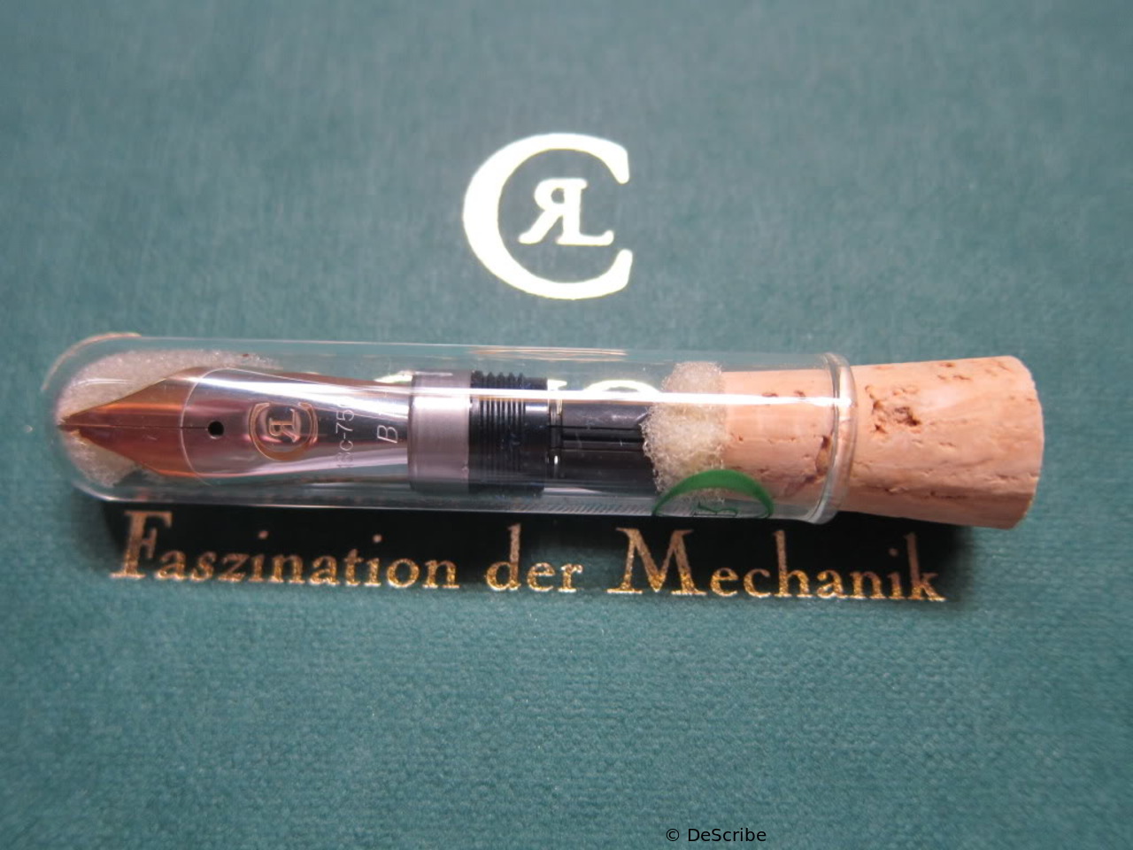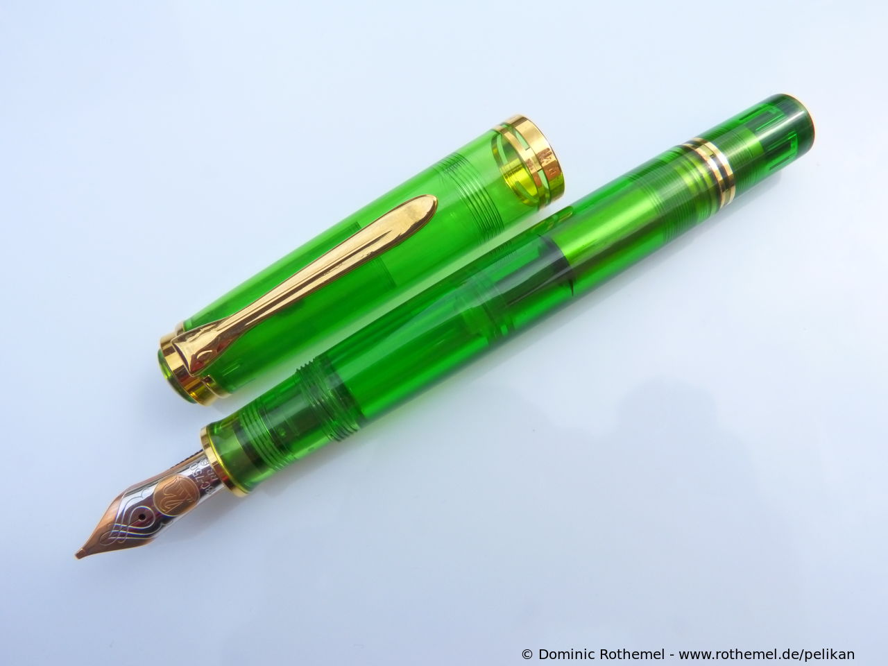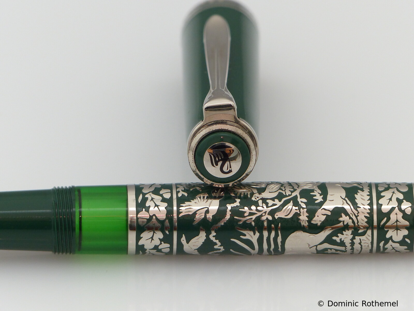 Modified version based on the M800 in dark green transparent. Supplied with a second nib to change (in the sizes M + B). Also, the nib is modified. The production by Pelikan is not apparent. Logo displays the C from Chronoswiss.