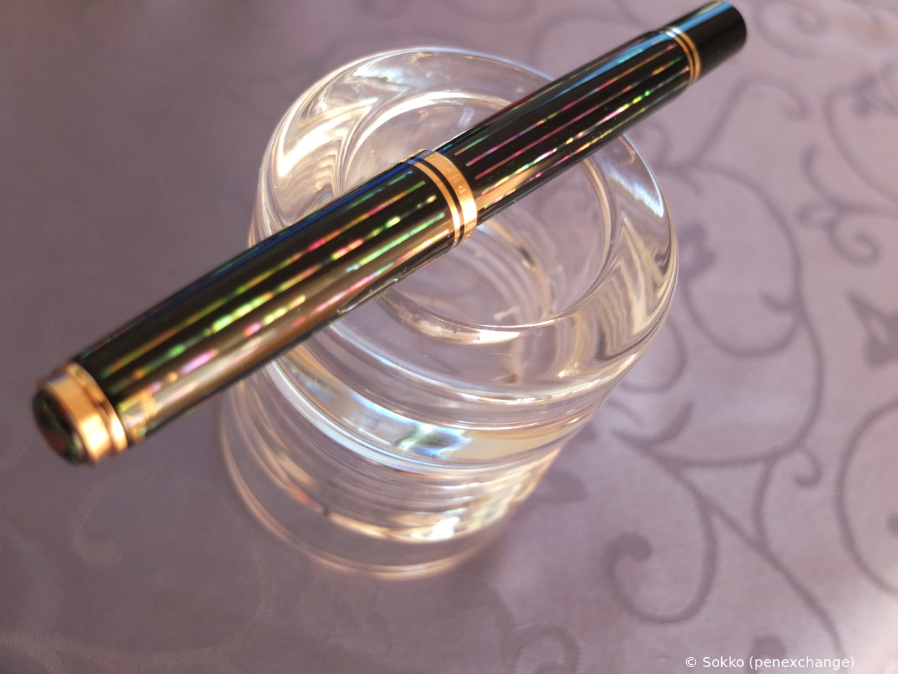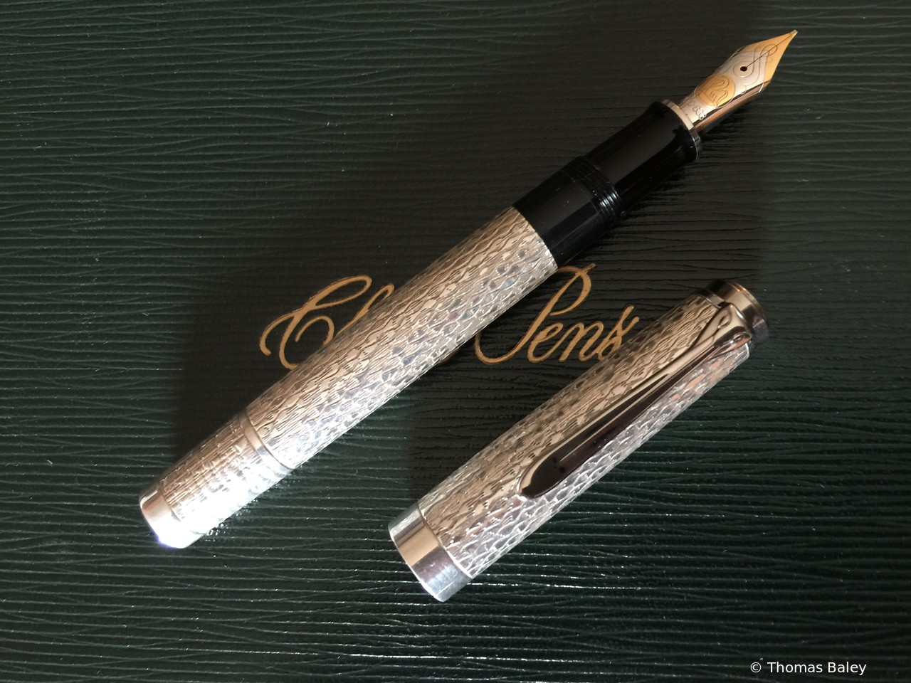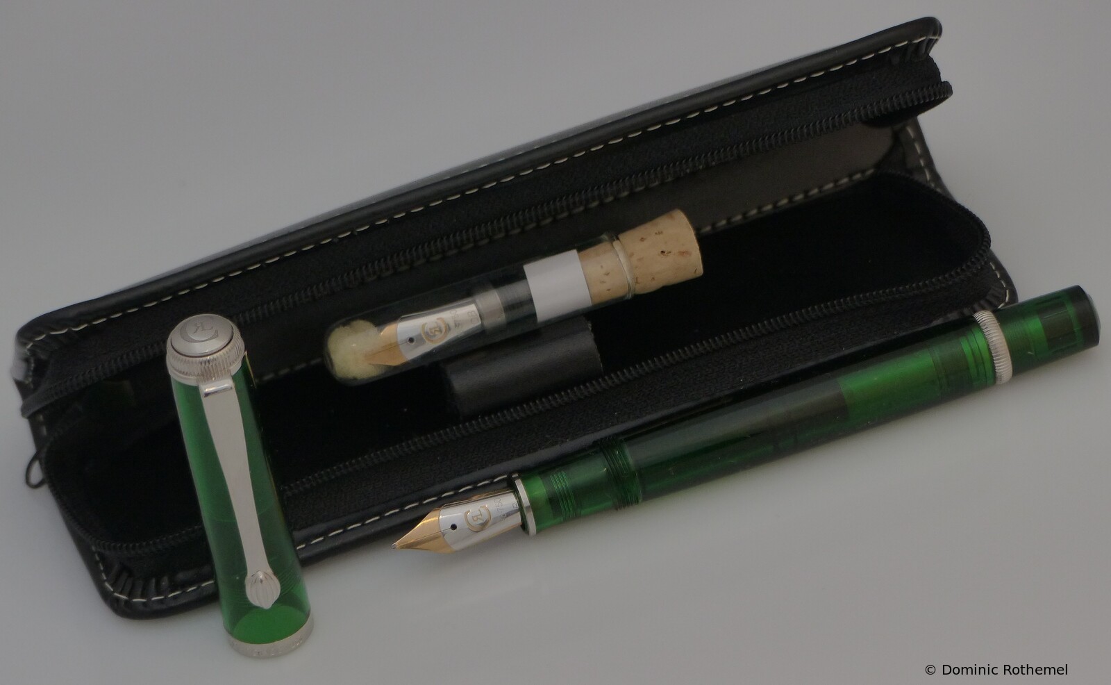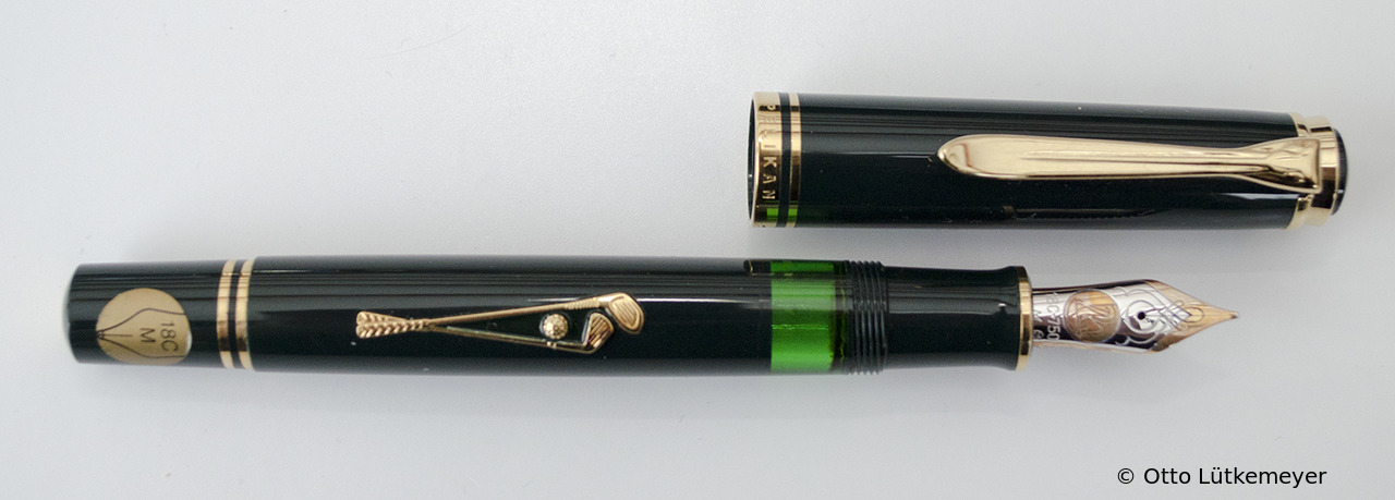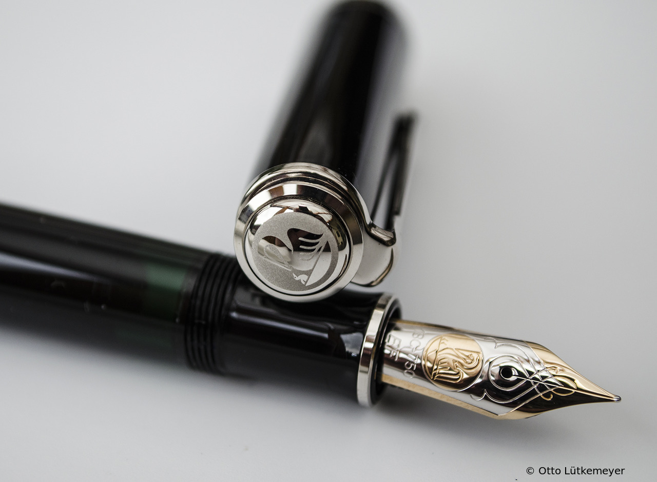 Modified version based on the M800 in dark green transparent. Supplied with a second nib to change (in the sizes M + B). Also, the nib is modified. The production by Pelikan is not apparent. Logo displays the C from Chronoswiss.