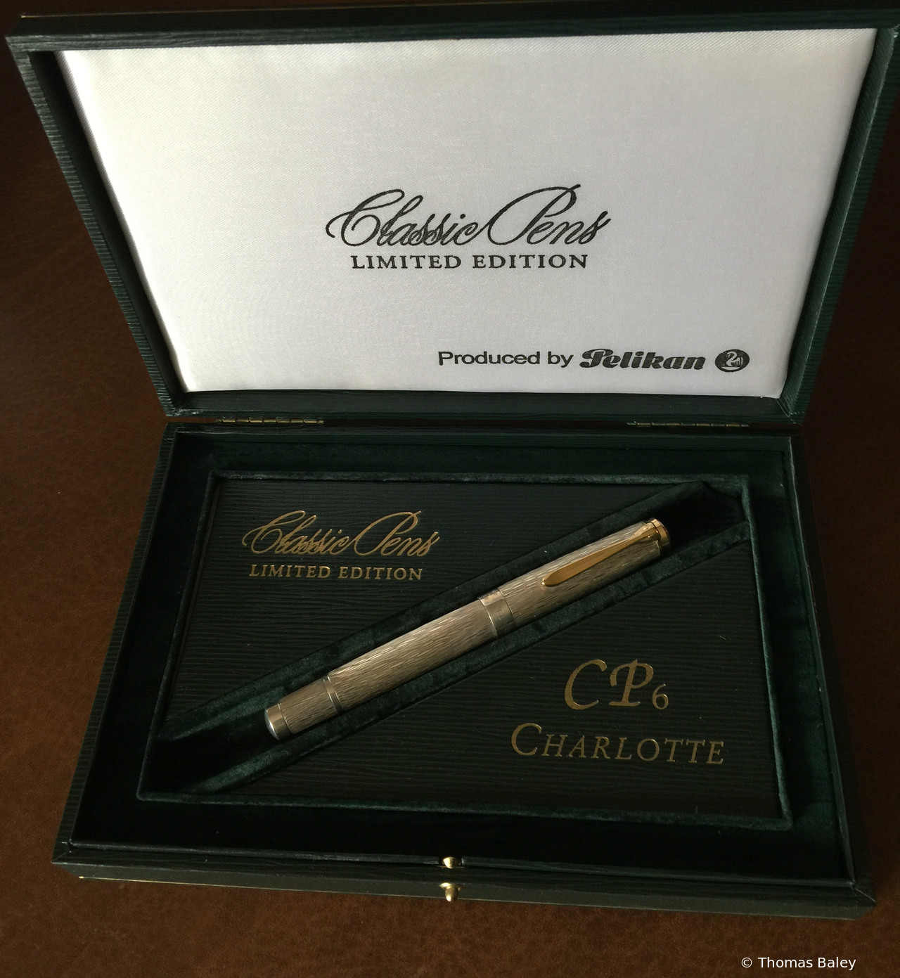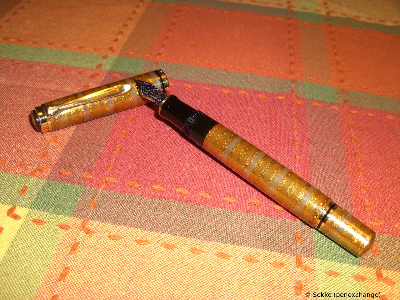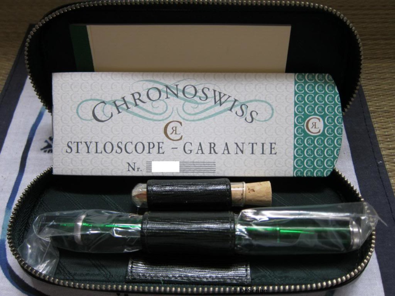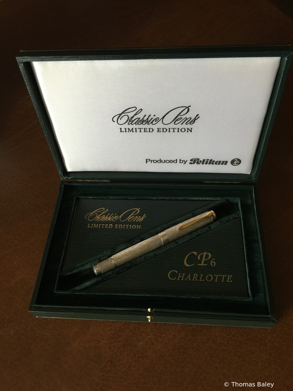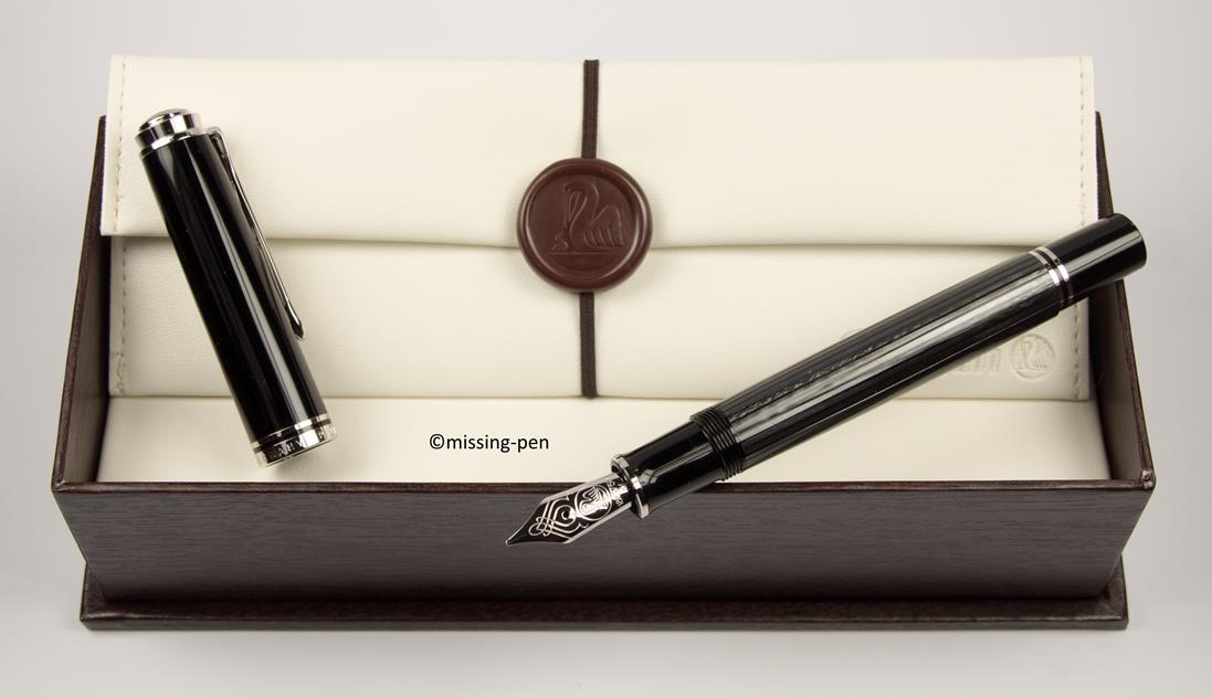 Modified version based on the M800 in dark green transparent. Supplied with a second nib to change (in the sizes M + B). Also, the nib is modified. The production by Pelikan is not apparent. Logo displays the C from Chronoswiss.