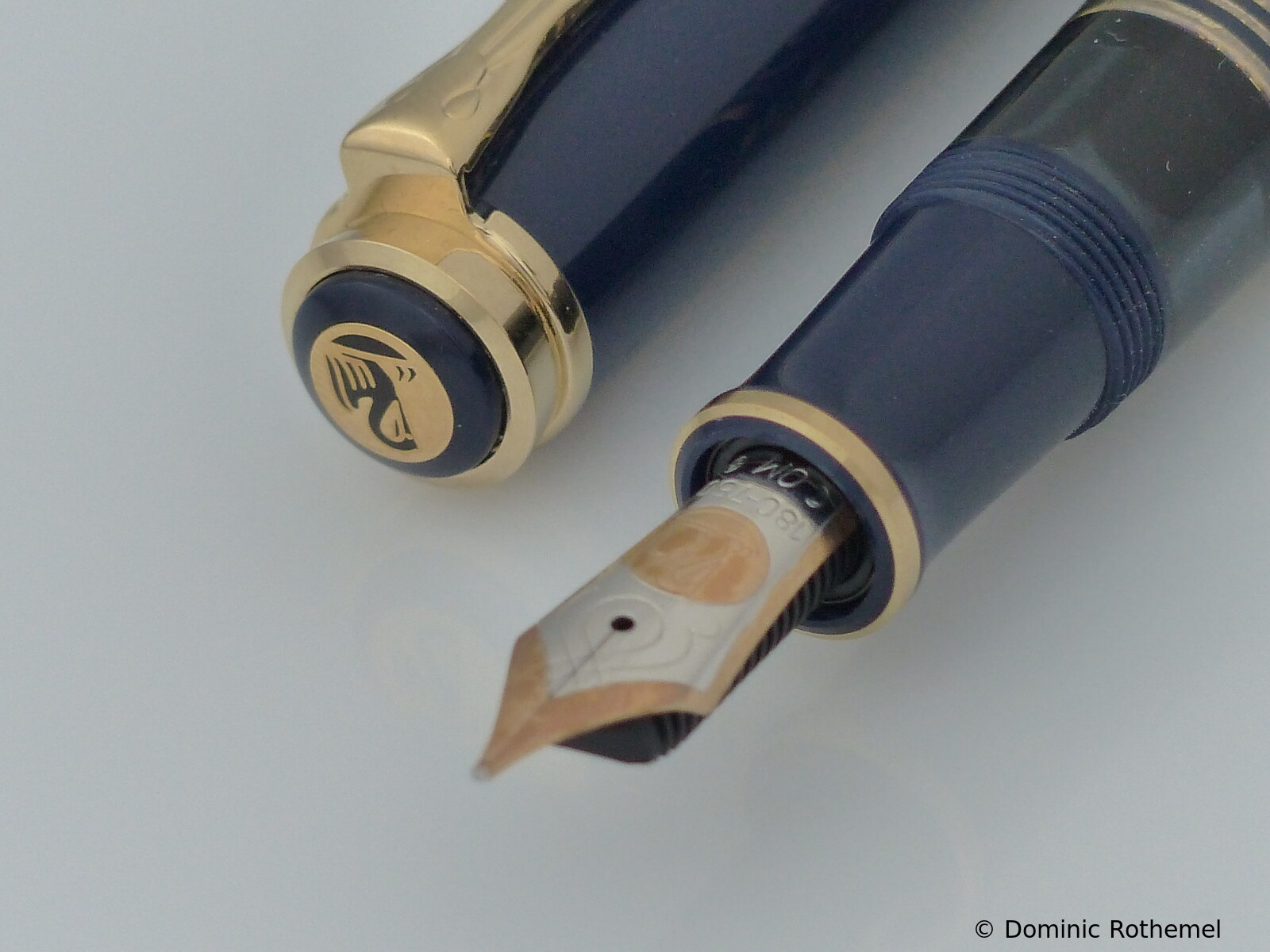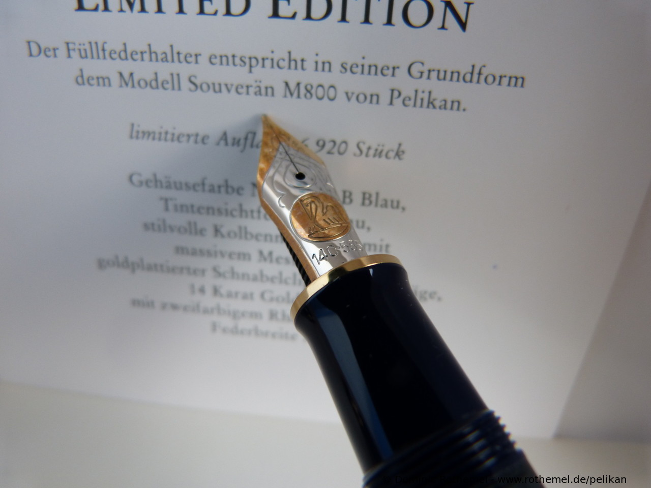In 1987 the M800 model was introduced. The bi-color gold nib was made of 14 carat gold. The cap had a brass jewel with the Pelikan logo. At the upper end of the filling knob was an undecorated gold-plated brass jewel.
