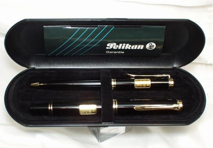 The Pelikan logo was made to correspond to the type of pen, so that pens in a case could be rapidly identified; the fountain pen and ballpoint have black logos, the rollerball and pencil grey ones on a golden background. After 1997 all models have uniform colored logos.