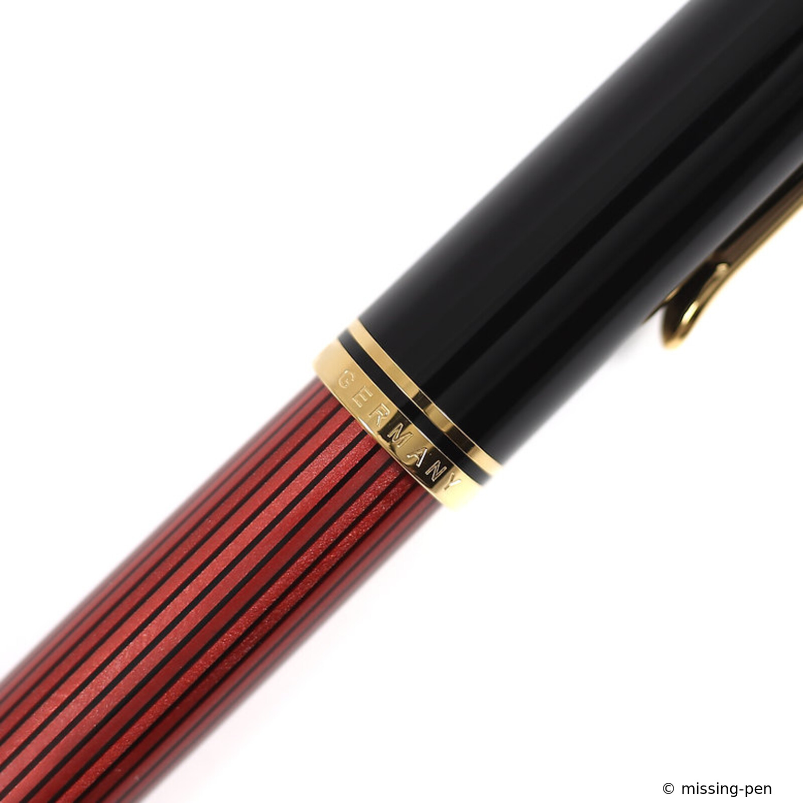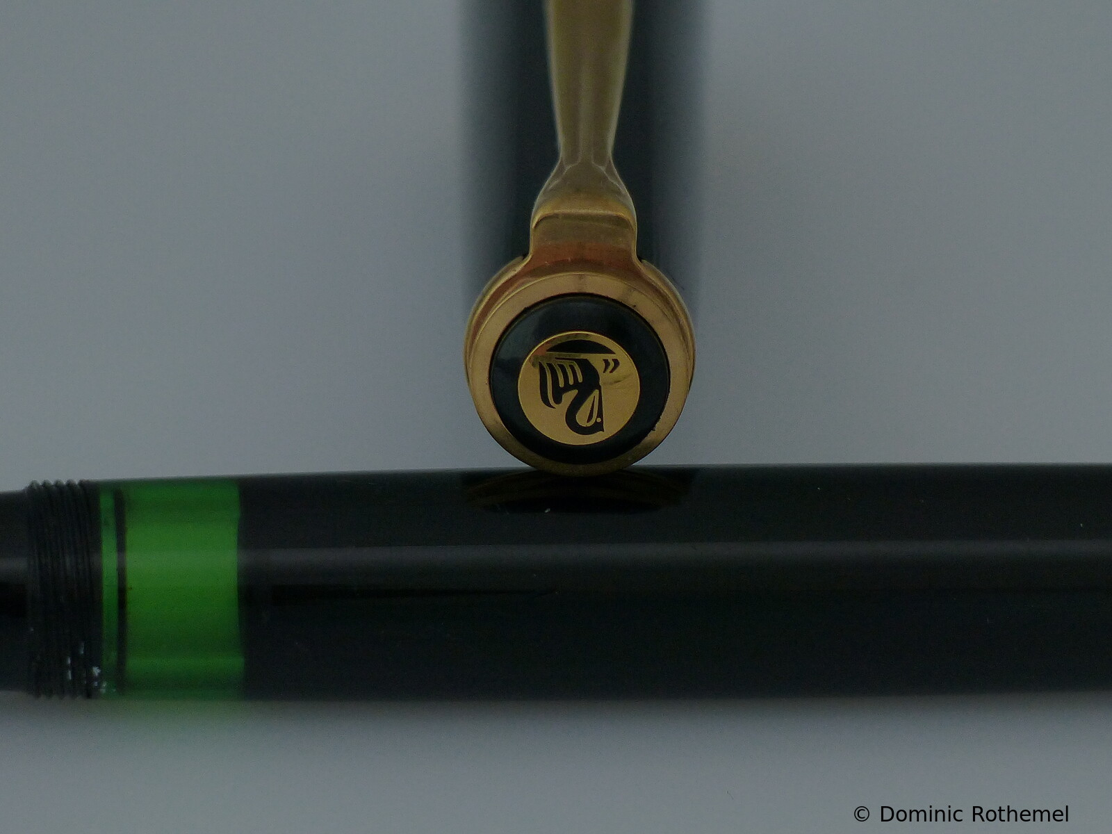 Later the brass cap jewel disappears and the cap logo is changed from a cut-out to a screen-printed one (in 1997/1998). The brass jewel on the filling knob also disappears. The engraving is PELIKAN SOUVERÄN GERMANY.
