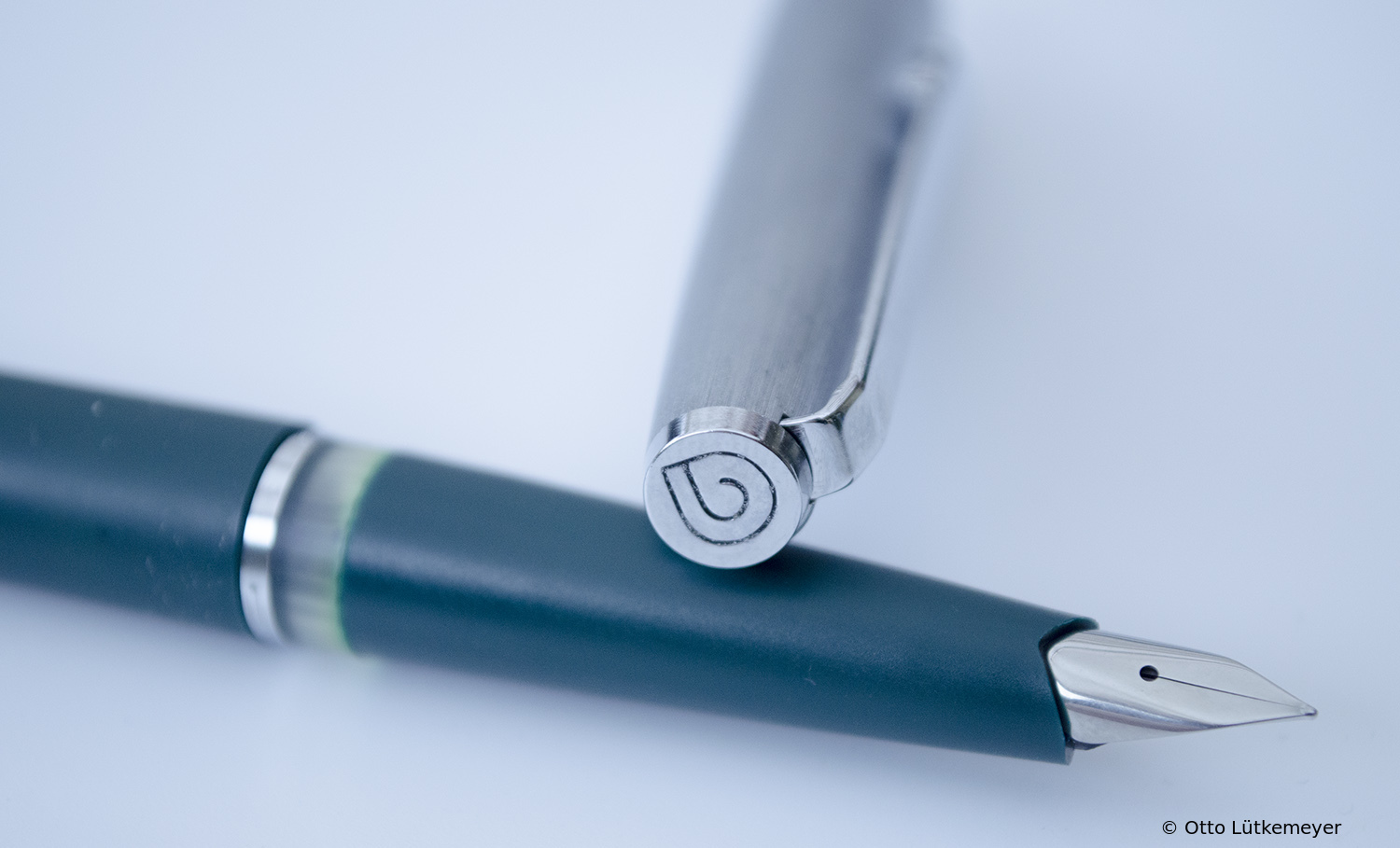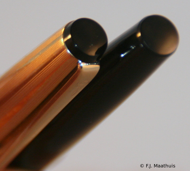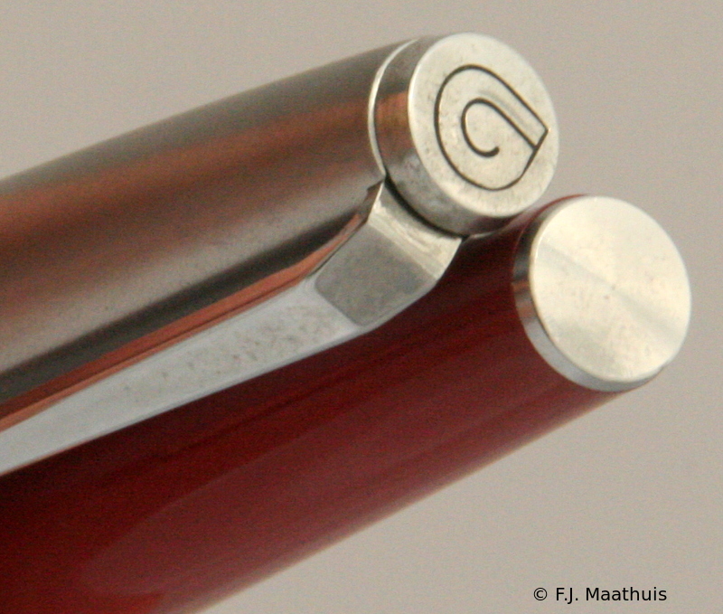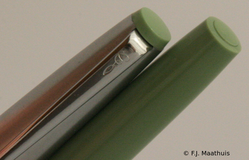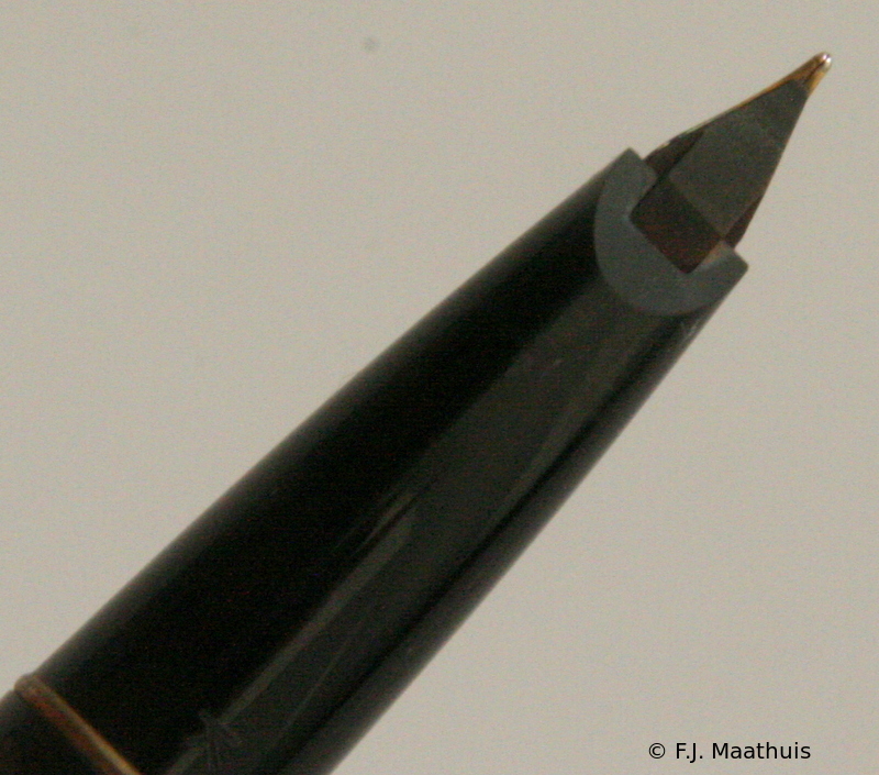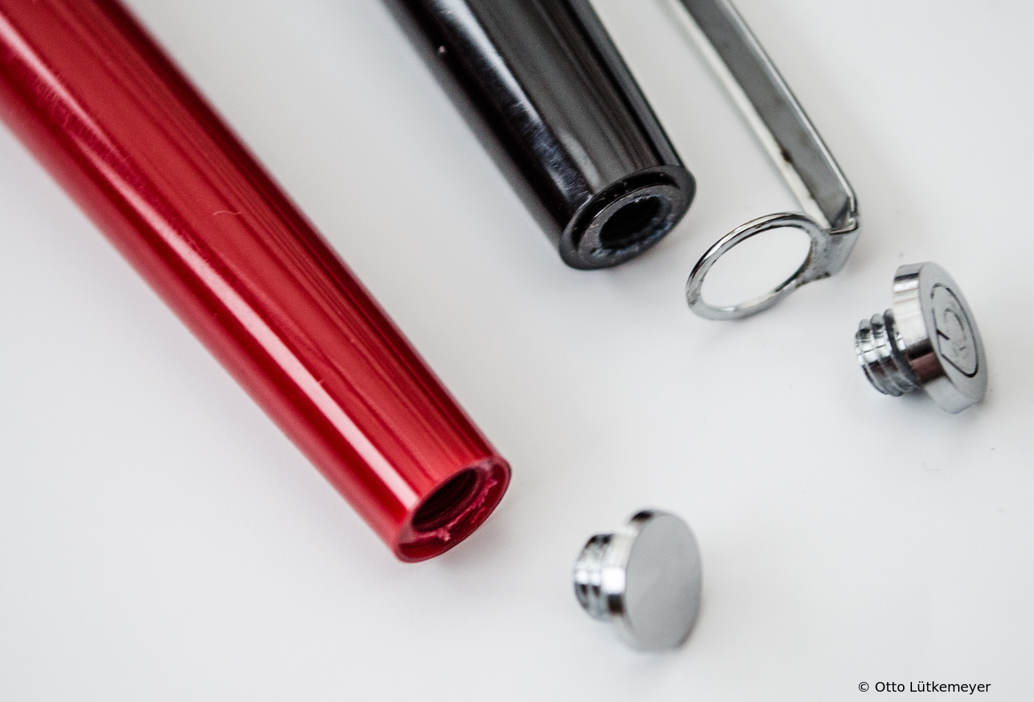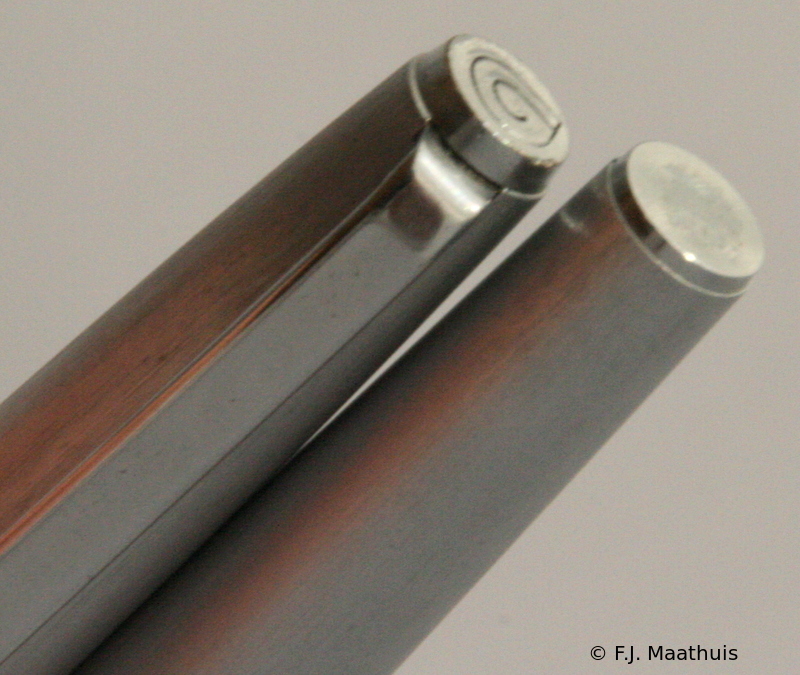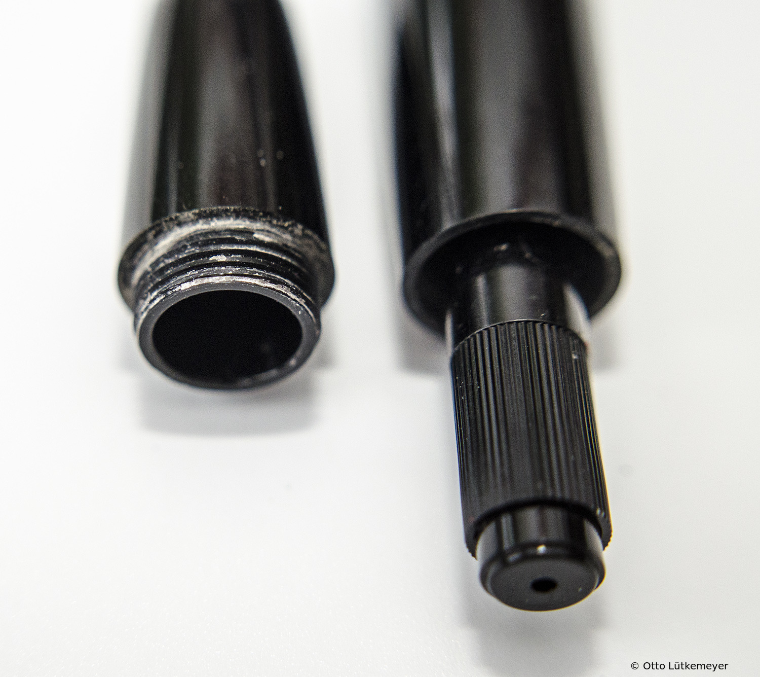 A further special feature is found in the caps of these pens: the inner cap for sealing the nib against ink leakage is not connected to the outer cap on the inside, but is flexibly installed. The nib presses this inner cap away from the end of the cap. The inner cap is held on the metal disc by an extension of the screw fastening. The inner cap can thus move up to 2 mm towards the end of the cap when the cap is placed on the fountain pen.