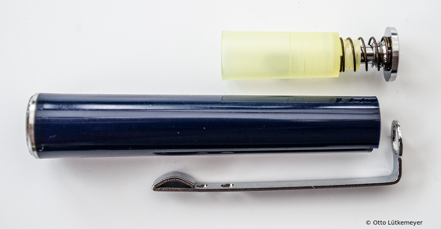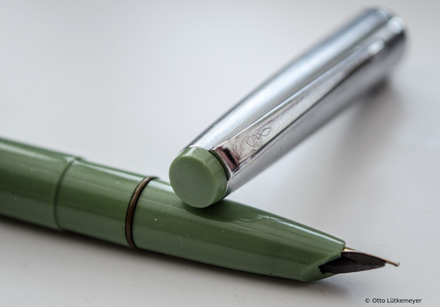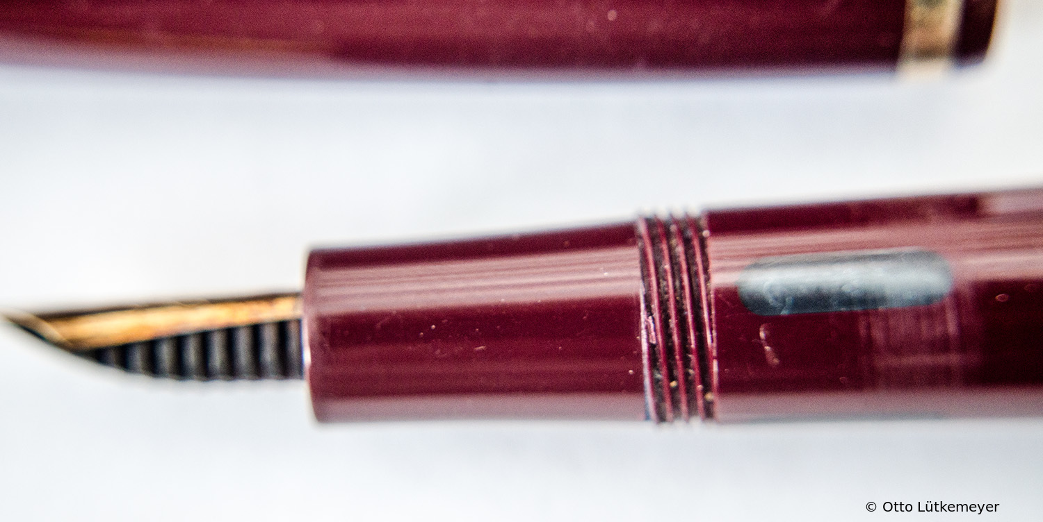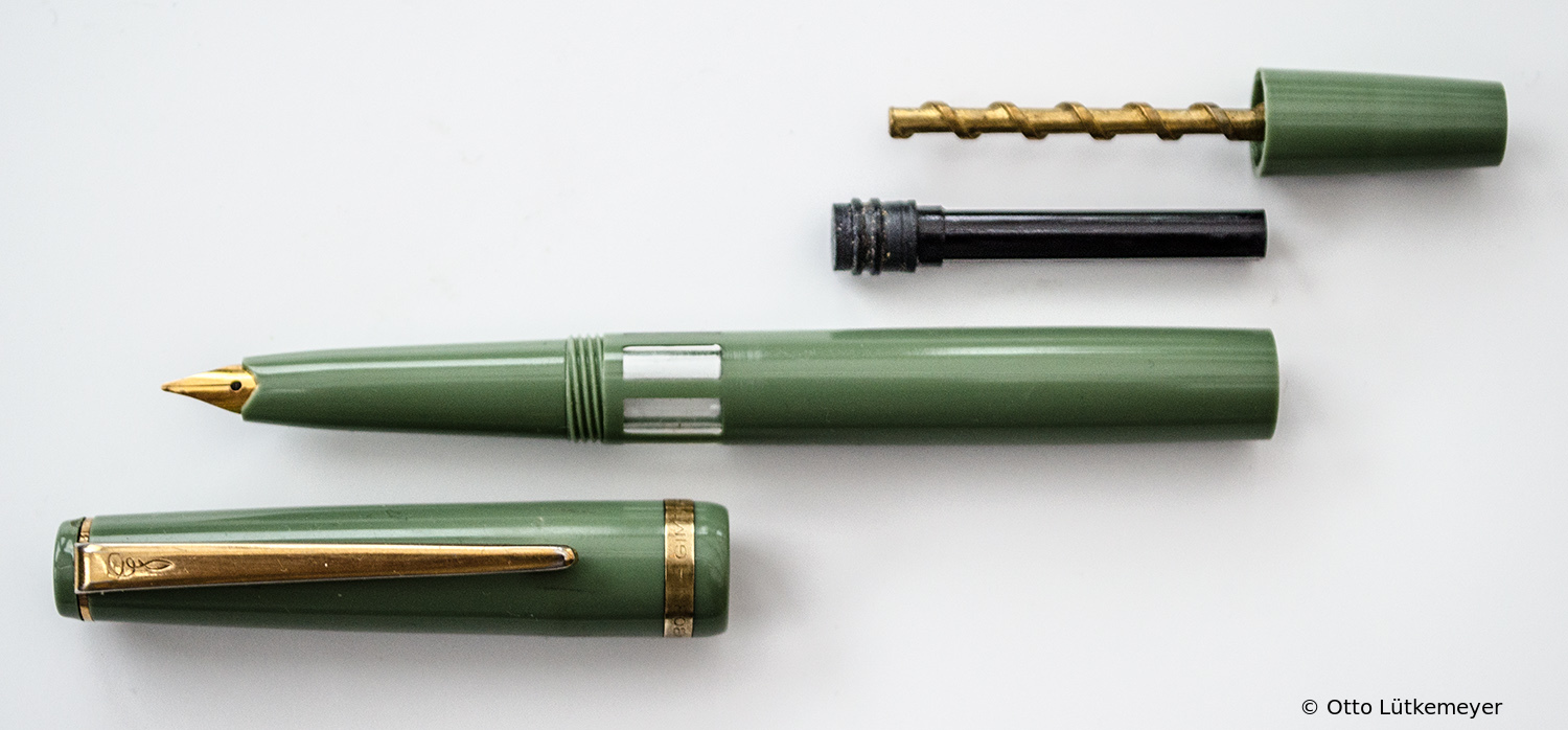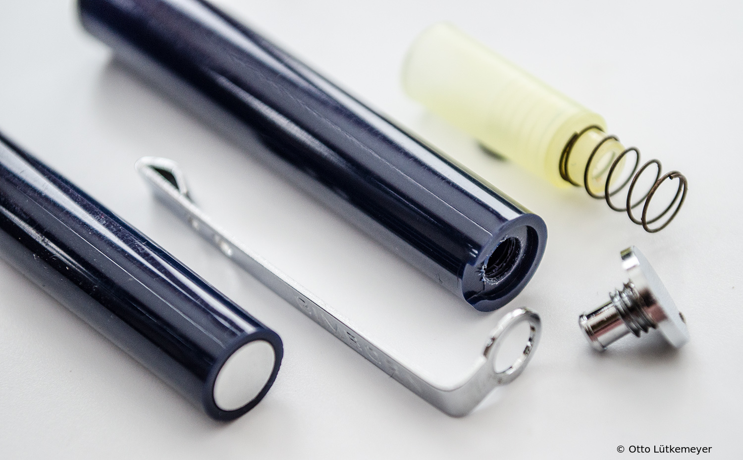 A further special feature is found in the caps of these pens: the inner cap for sealing the nib against ink leakage is not connected to the outer cap on the inside, but is flexibly installed. The nib presses this inner cap away from the end of the cap. The inner cap is held on the metal disc by an extension of the screw fastening. The inner cap can thus move up to 2 mm towards the end of the cap when the cap is placed on the fountain pen.
