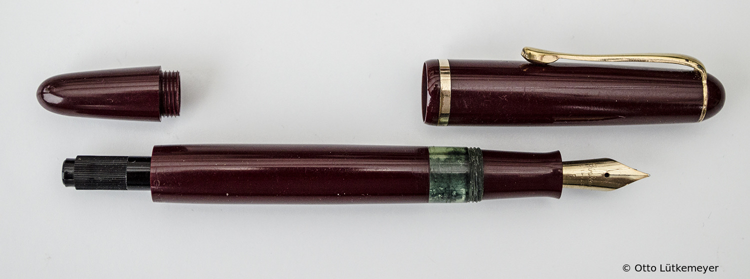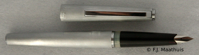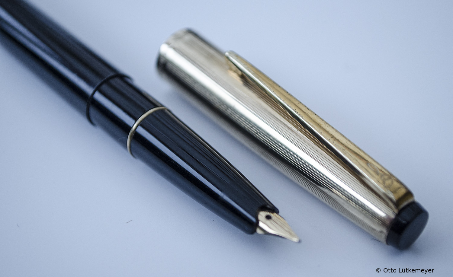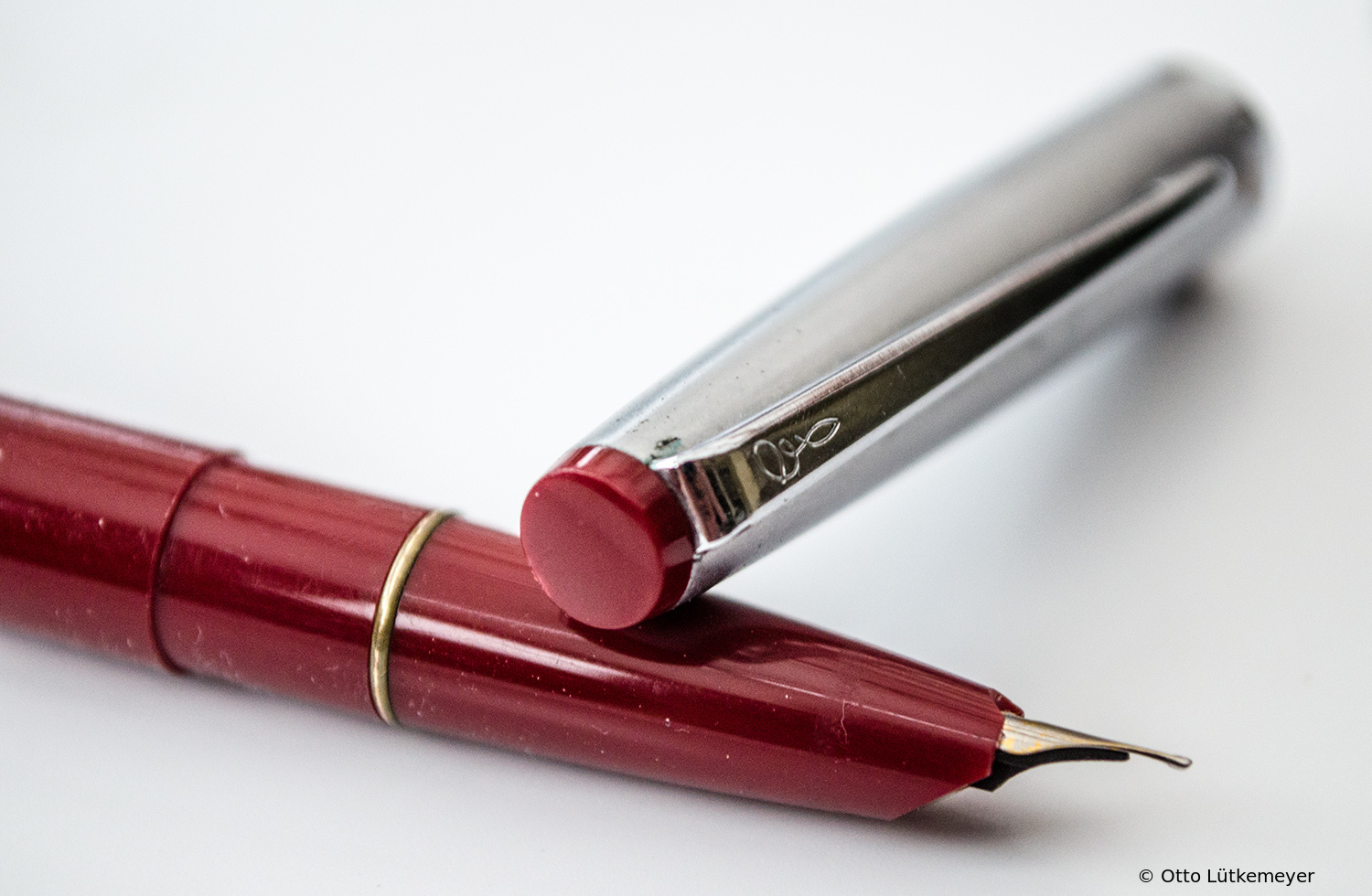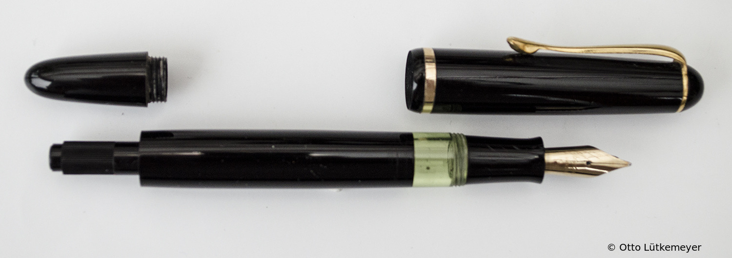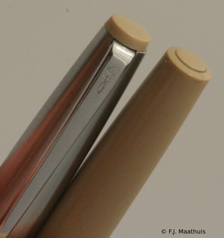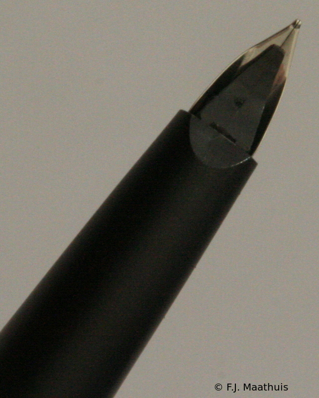 A further special feature is found in the caps of these pens: the inner cap for sealing the nib against ink leakage is not connected to the outer cap on the inside, but is flexibly installed. The nib presses this inner cap away from the end of the cap. The inner cap is held on the metal disc by an extension of the screw fastening. The inner cap can thus move up to 2 mm towards the end of the cap when the cap is placed on the fountain pen.