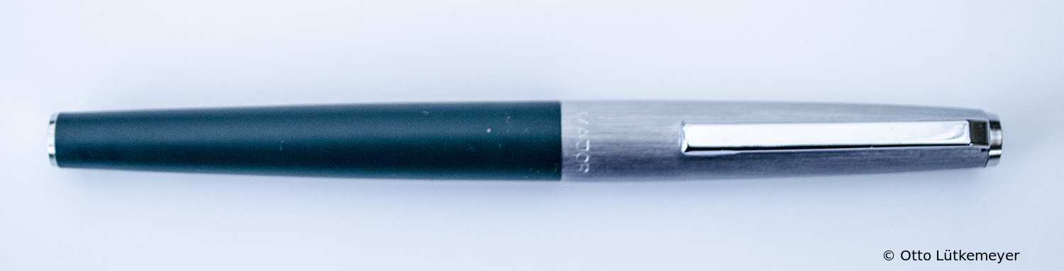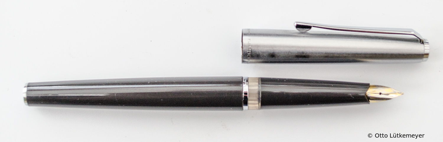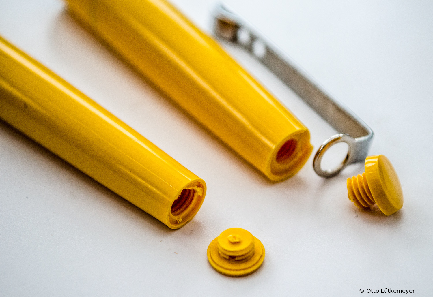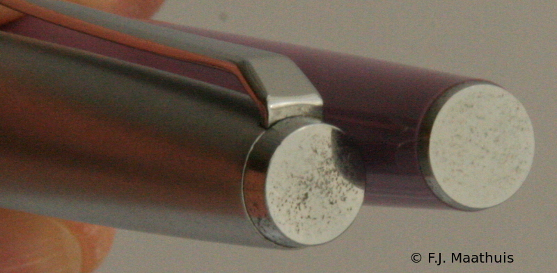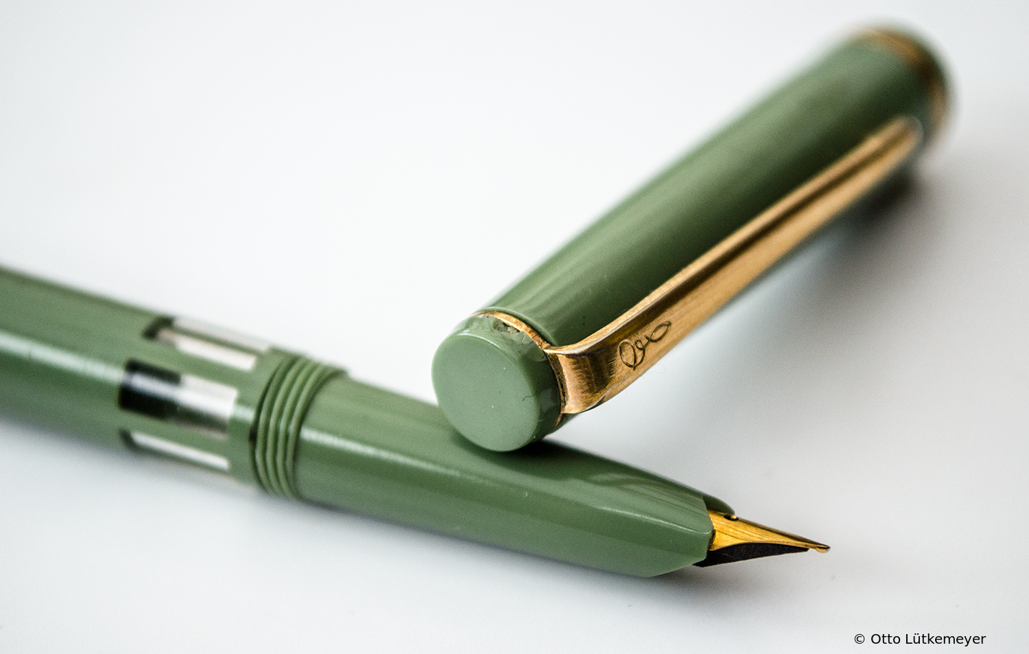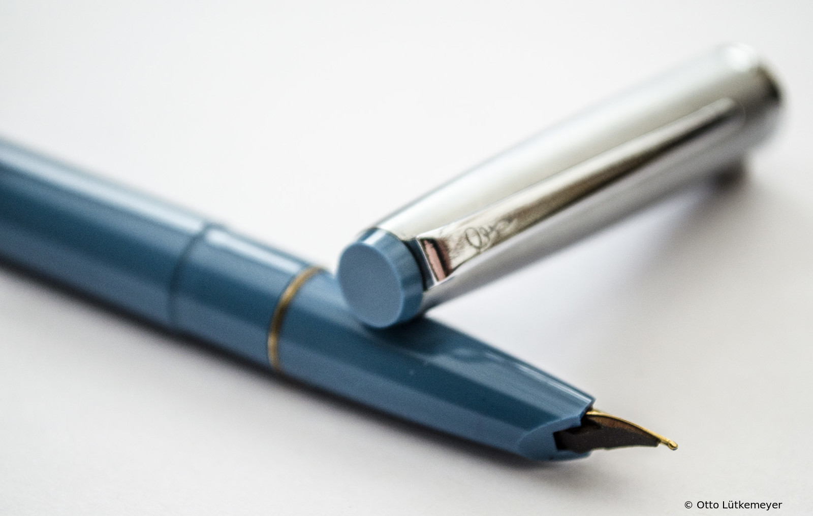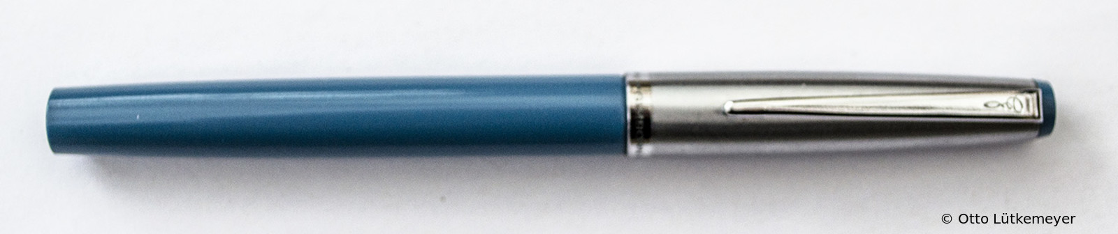 A further special feature is found in the caps of these pens: the inner cap for sealing the nib against ink leakage is not connected to the outer cap on the inside, but is flexibly installed. The nib presses this inner cap away from the end of the cap. The inner cap is held on the metal disc by an extension of the screw fastening. The inner cap can thus move up to 2 mm towards the end of the cap when the cap is placed on the fountain pen.