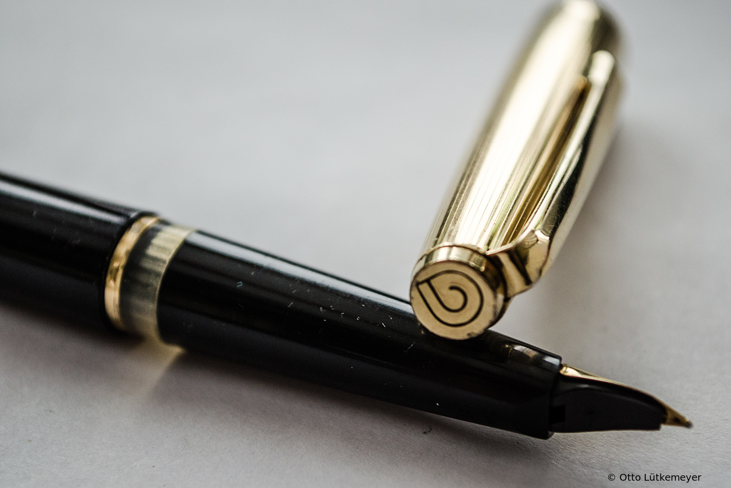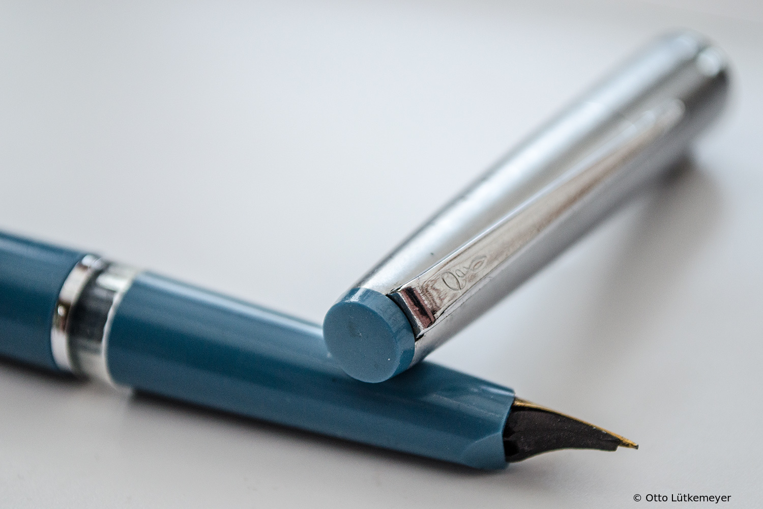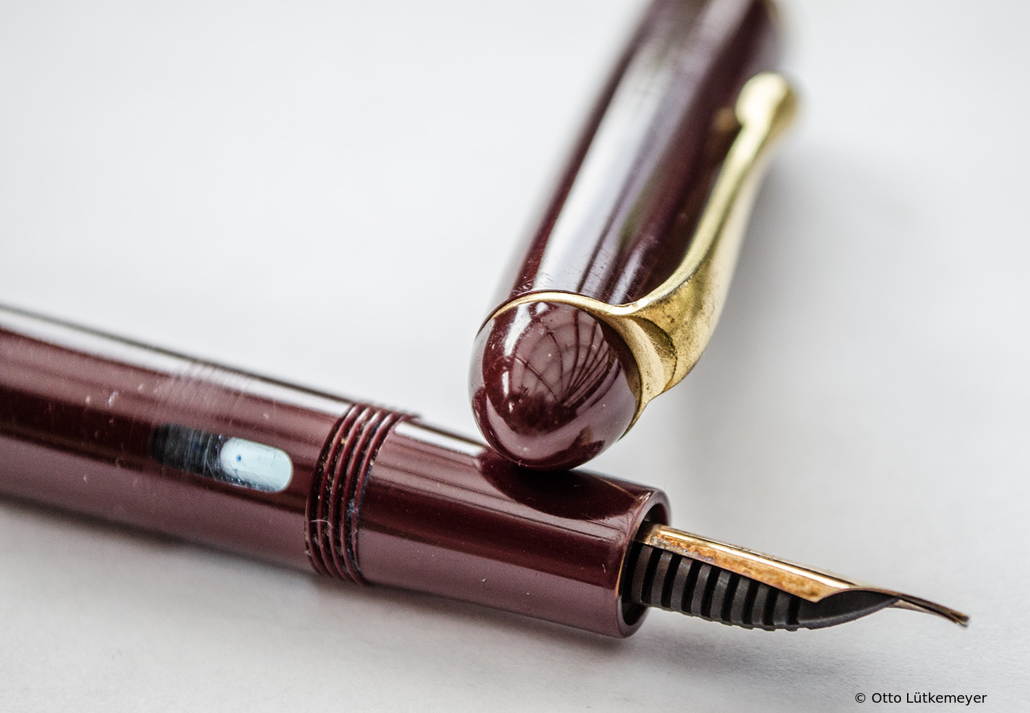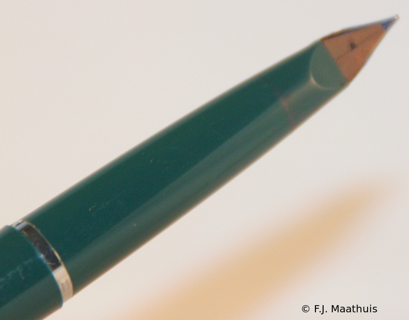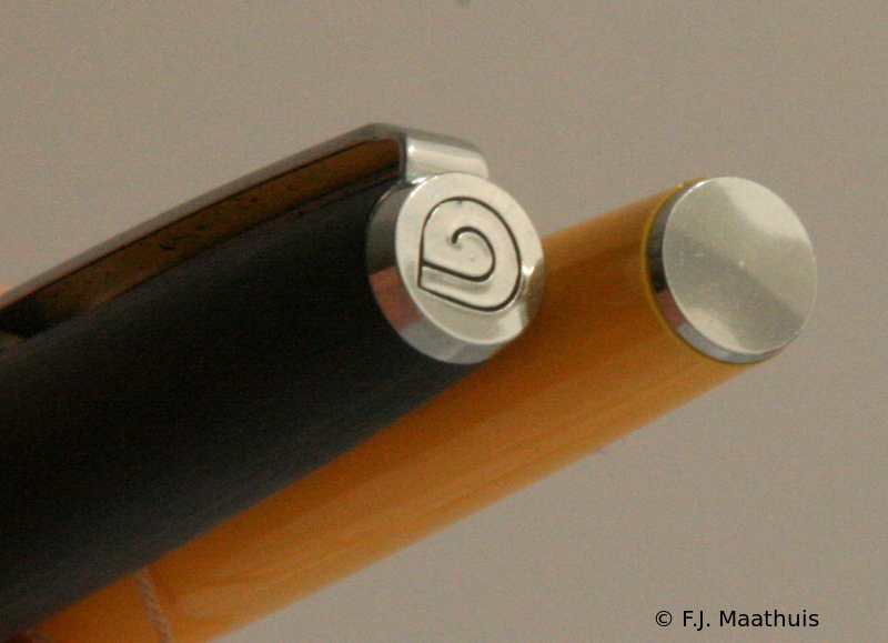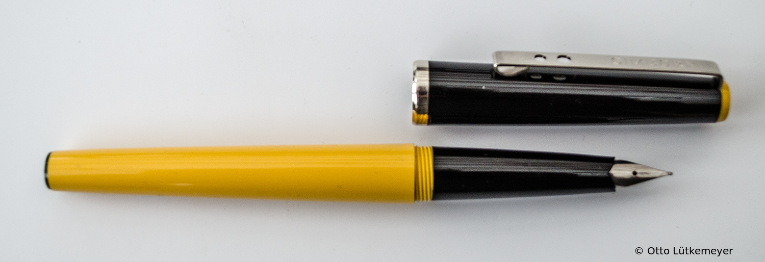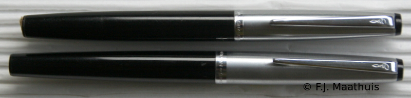 A further special feature is found in the caps of these pens: the inner cap for sealing the nib against ink leakage is not connected to the outer cap on the inside, but is flexibly installed. The nib presses this inner cap away from the end of the cap. The inner cap is held on the metal disc by an extension of the screw fastening. The inner cap can thus move up to 2 mm towards the end of the cap when the cap is placed on the fountain pen.