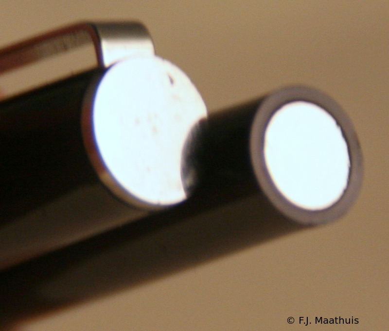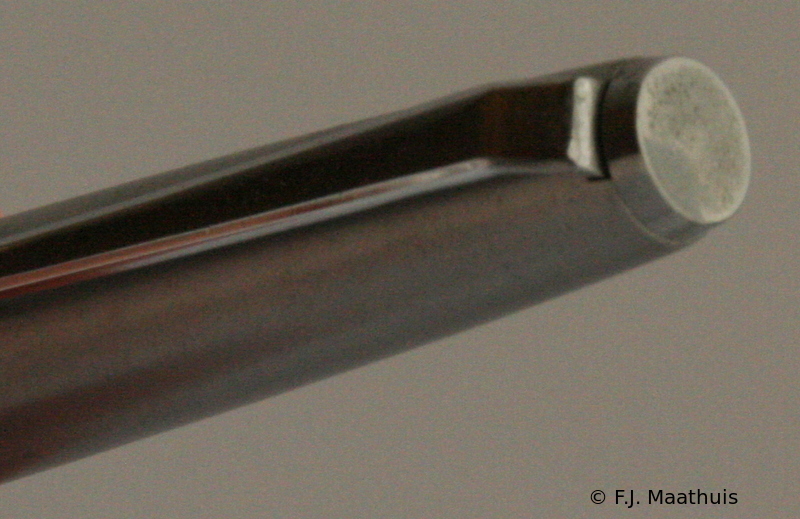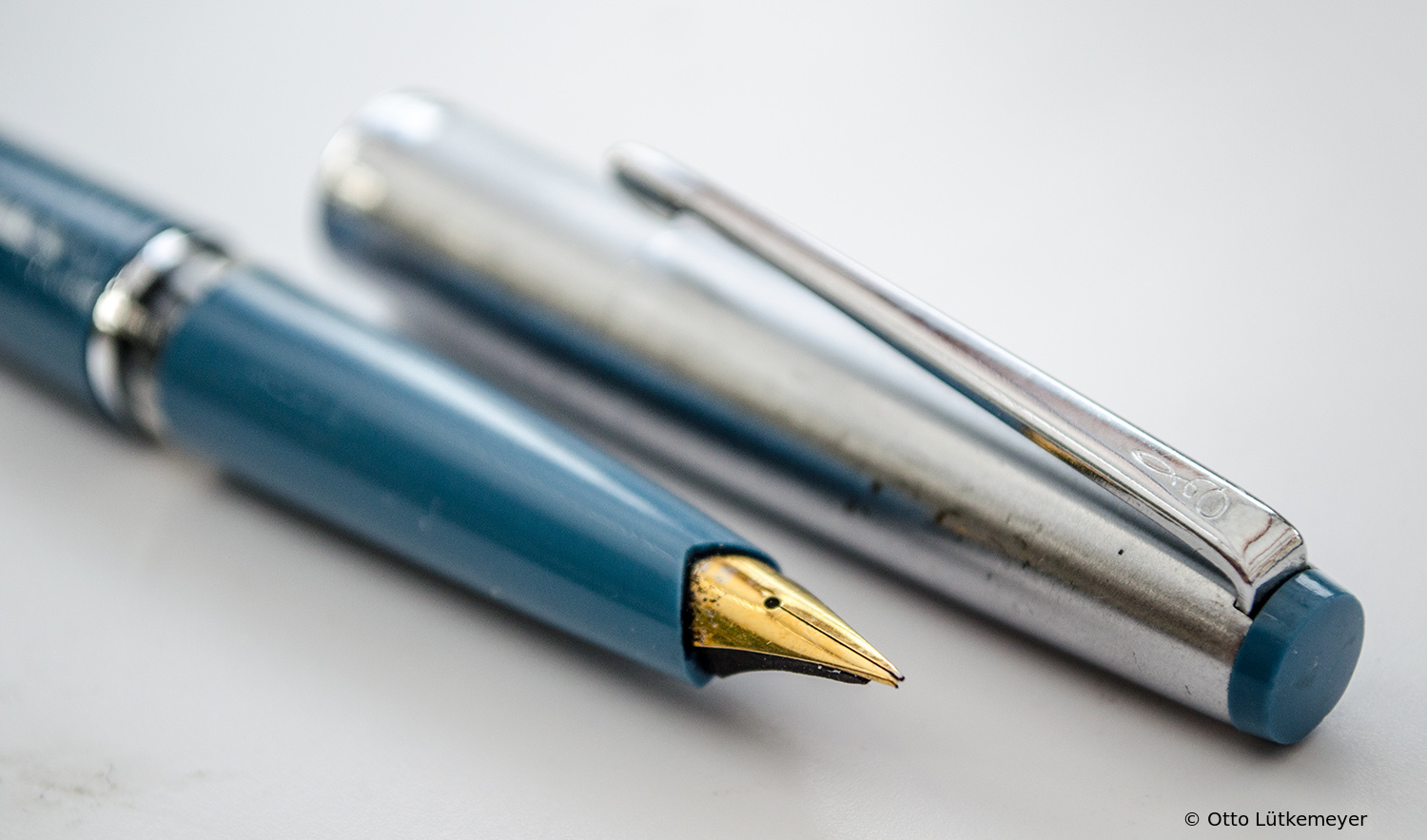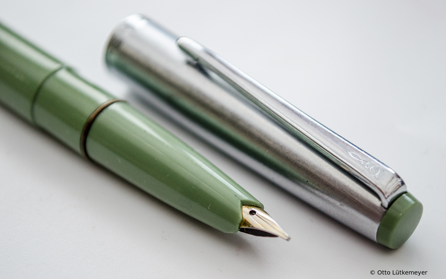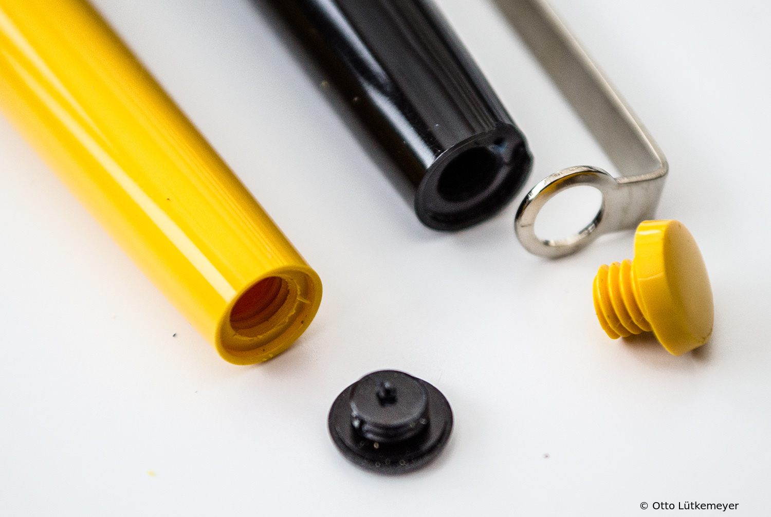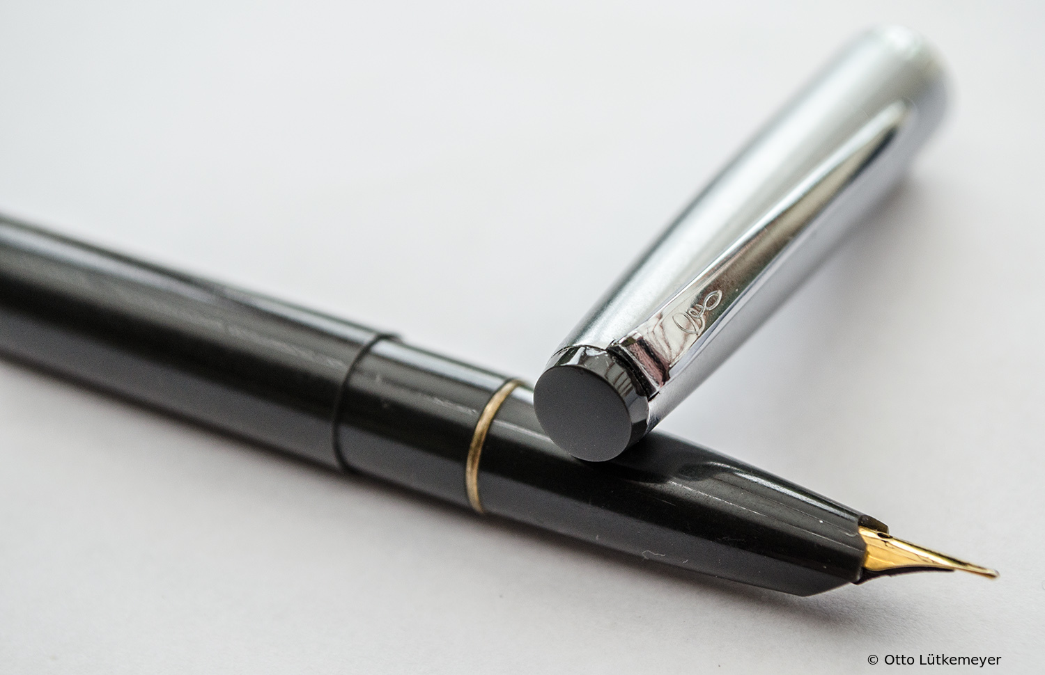 A further special feature is found in the caps of these pens: the inner cap for sealing the nib against ink leakage is not connected to the outer cap on the inside, but is flexibly installed. The nib presses this inner cap away from the end of the cap. The inner cap is held on the metal disc by an extension of the screw fastening. The inner cap can thus move up to 2 mm towards the end of the cap when the cap is placed on the fountain pen.