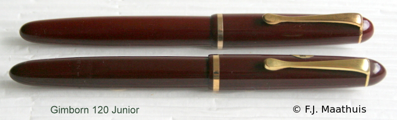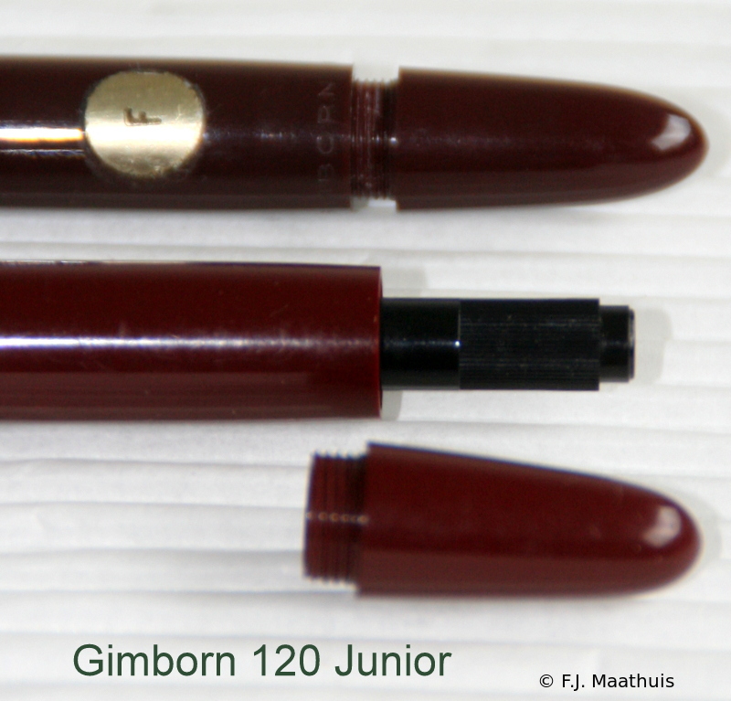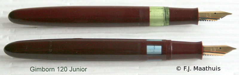 Just like the model Senior, the Gimborn 120 Junior was reissued from 1954 onwards. It was aimed at students and buyers for writing instruments in the lower price segment. Yet again the parts of this fountain pen were produced by Pelikan. Two modifications are known for this model, which will be done around the end of the 1950s. First, it is noticeable that the round top of the cap head is replaced by a sharper cap end. The filler knob is now no longer hidden under a cap and can be operated directly. The circumferential ink window is replaced by four elongated viewing windows. In one variant (v2) these viewing windows are angular, in a probably later variant (v3) these elongated viewing windows have rounded ends. Also striking in the variant (v3) is the grip section, that tapers further towards the nib. (Such a peculiarity can also be found again when comparing the Pelikan 120 to the Pelikan 120 Merz & Krell.) The dimensions of the variants differ only slightly, the caps could be exchanged between the model variants. There are many indications that these new variants have already been produced by another manufacturer (Böhler GmbH).