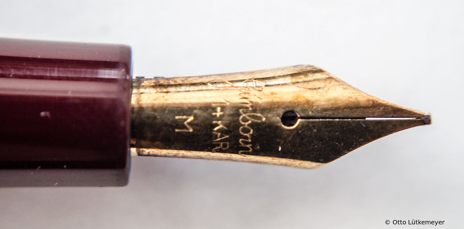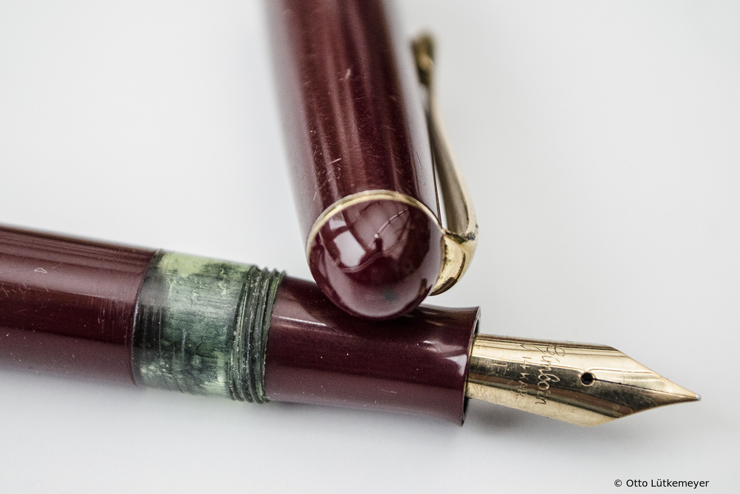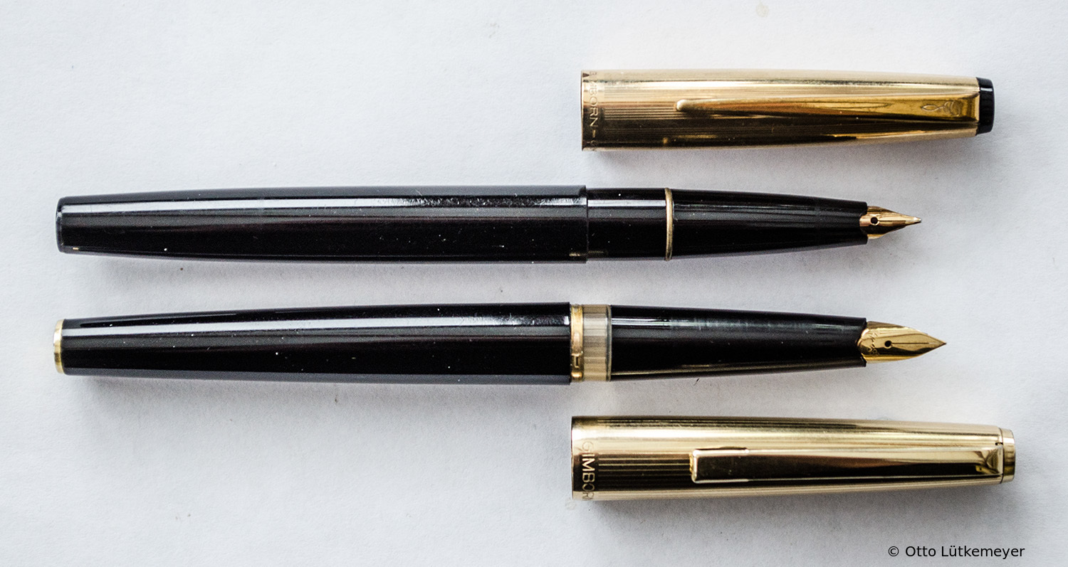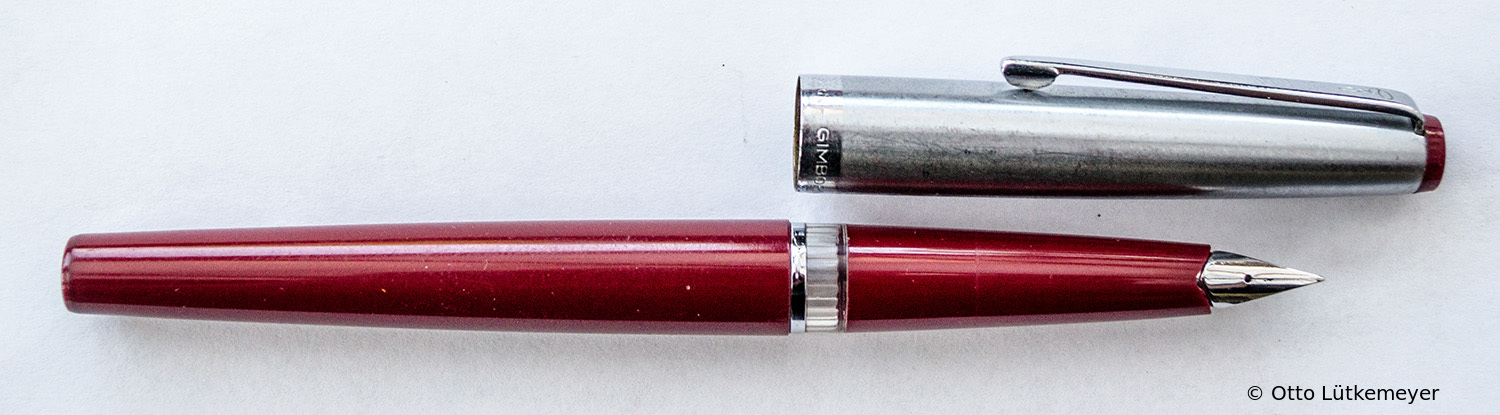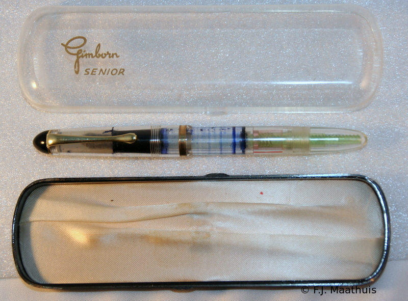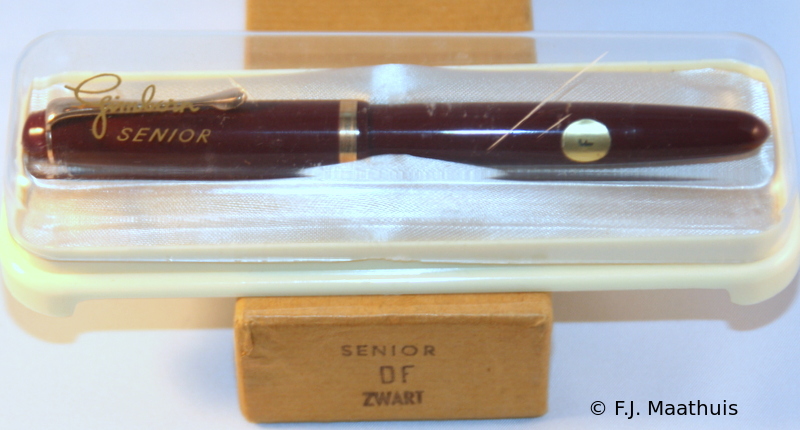 Three years after the first model Master, the model Senior was introduced, using parts produced by Lamy. From 1958 the model was slightly modified. Now the barrel no longer had circumferential ink window, but four round ink windows, which were very reminiscent of the designs of new fountain pen models, such as the new P1S and P1RG models from Pelikan from the same period. The black model Gimborn 130 shows this new design.