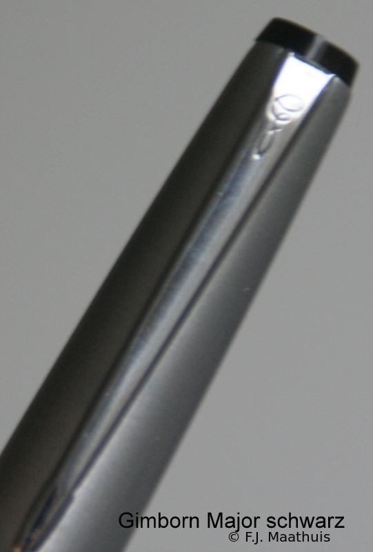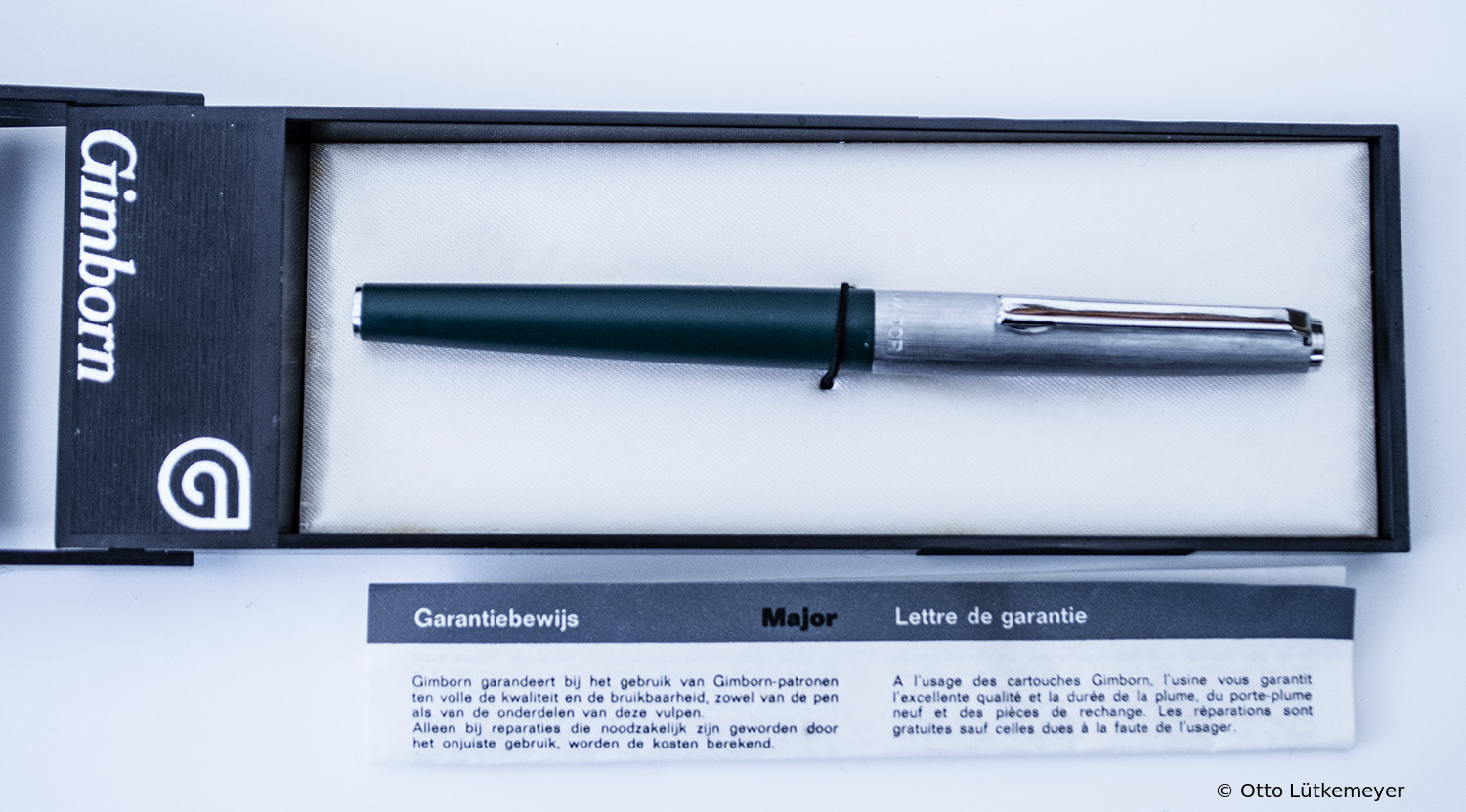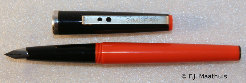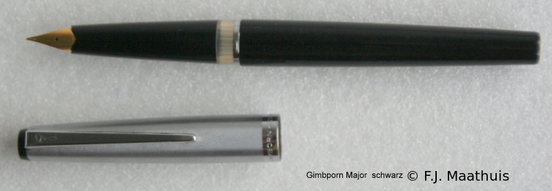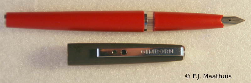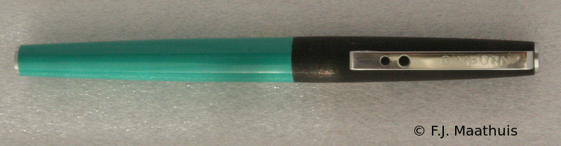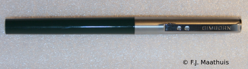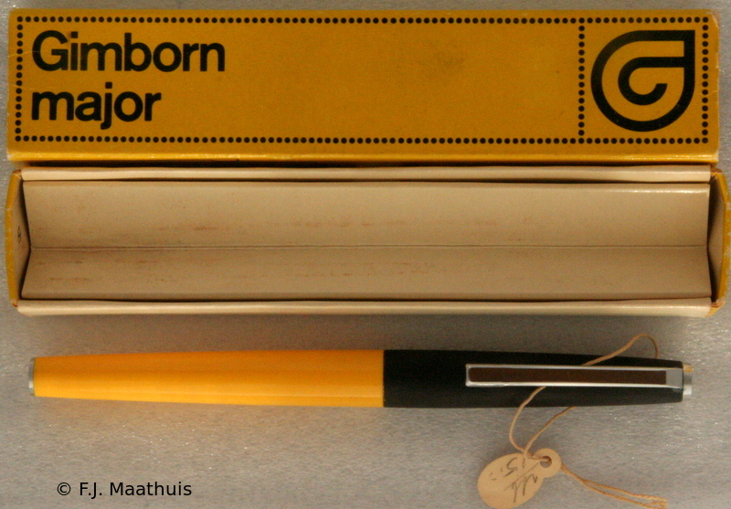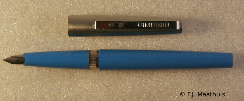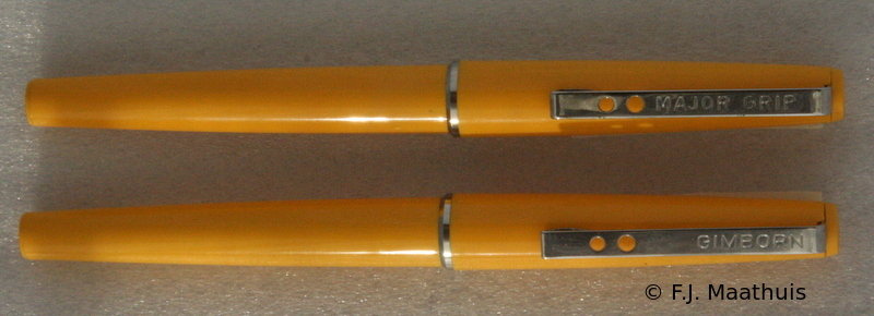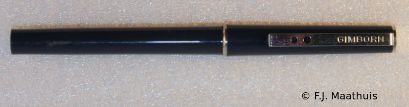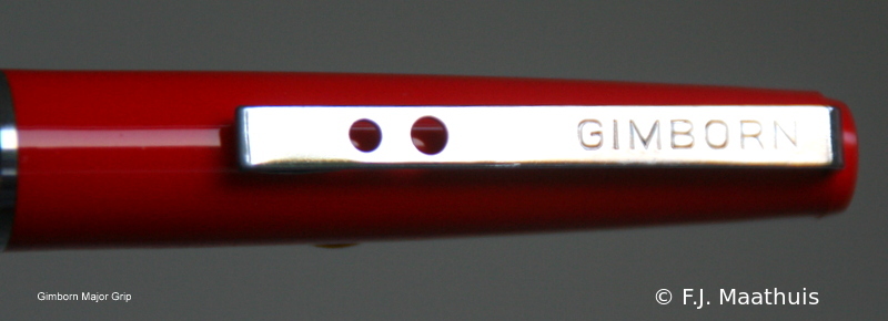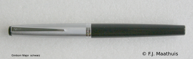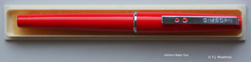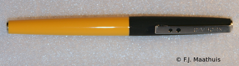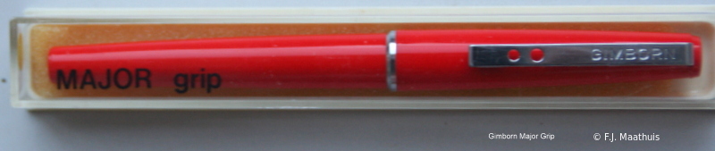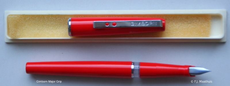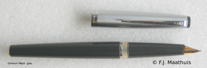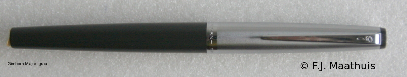 Initially, the barrel is closed by a screwed plastic disc. In later models, the barrel was made in a single piece. The end of the cap is closed by a screwed plastic disc, which also holds the clip. The clip normally carries the embossing, GIMBORN '. However, clips with the label 'MAJOR' and 'MAJOR GRIP' are also known. It is conceivable that these fountain pens were made around 1981, after the company Gimborn B.V. was renamed as Pelikan Nederland B.V.