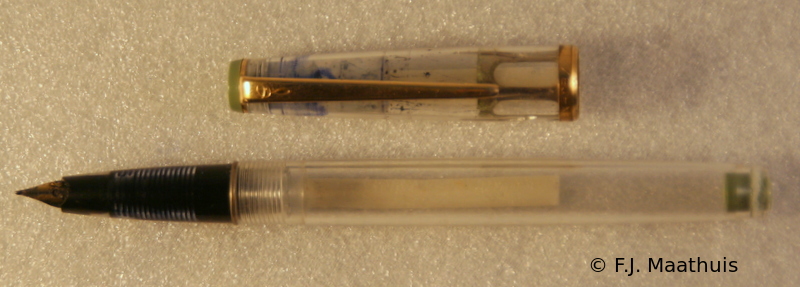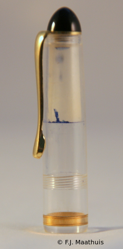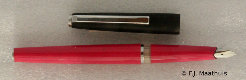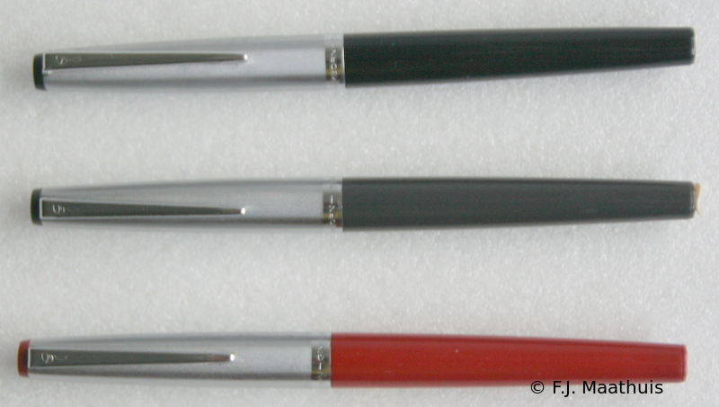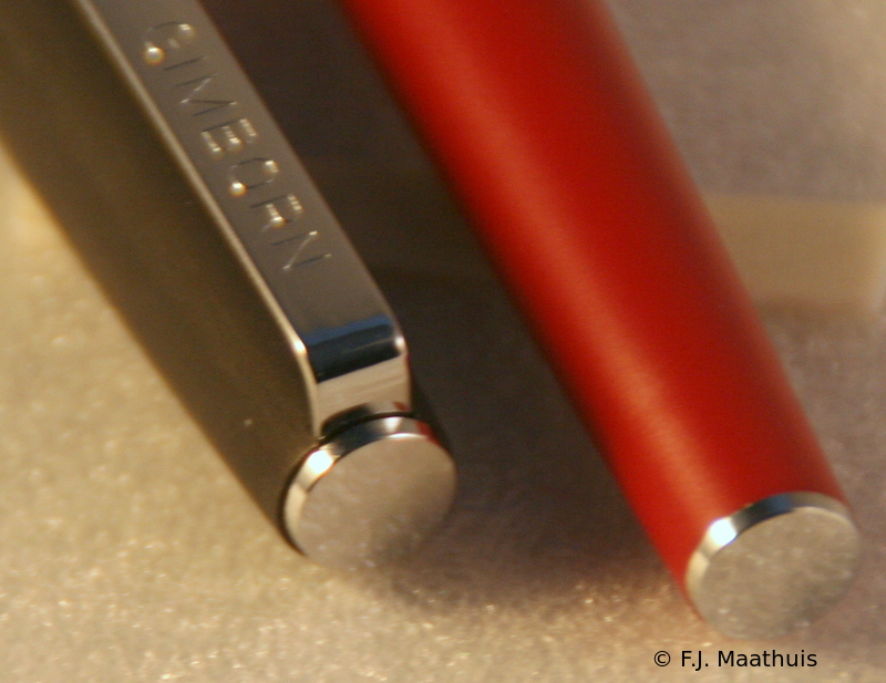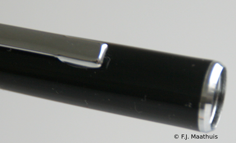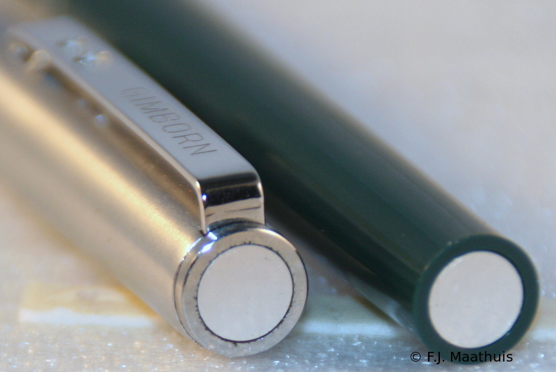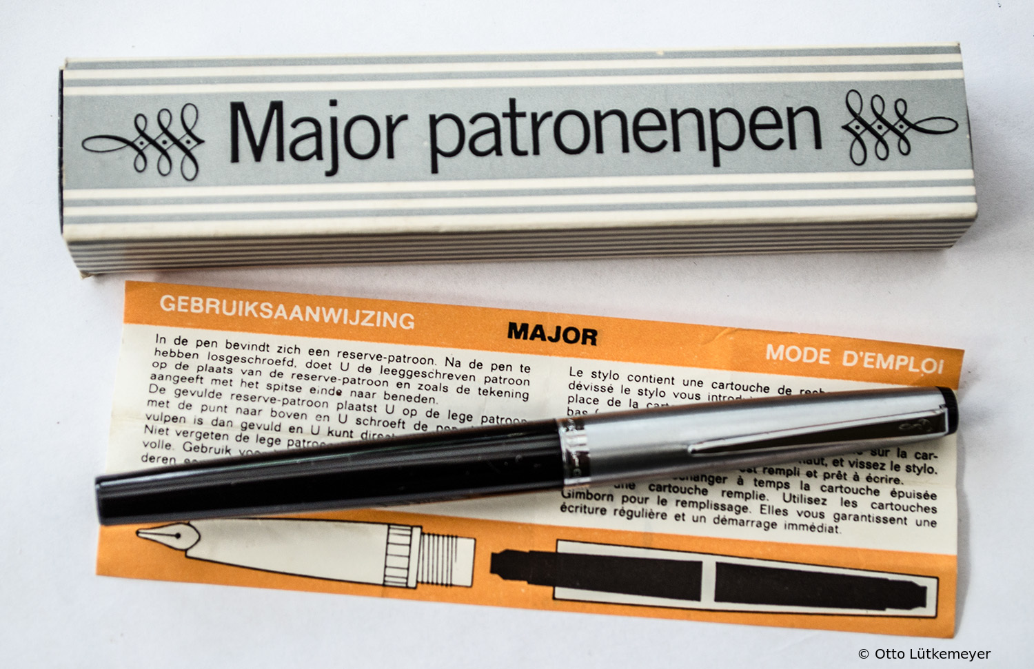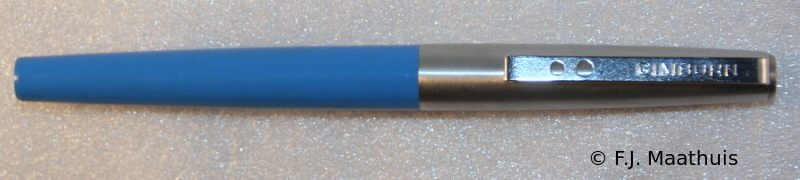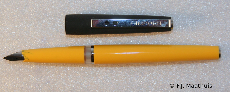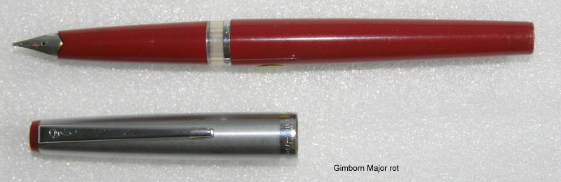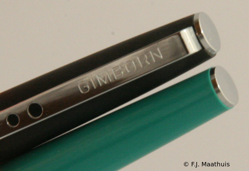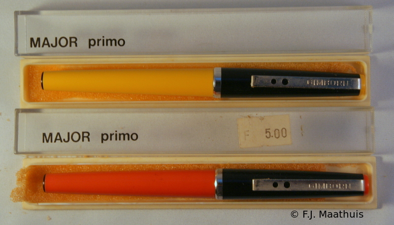 Initially, the barrel is closed by a screwed plastic disc. In later models, the barrel was made in a single piece. The end of the cap is closed by a screwed plastic disc, which also holds the clip. The clip normally carries the embossing, GIMBORN '. However, clips with the label 'MAJOR' and 'MAJOR GRIP' are also known. It is conceivable that these fountain pens were made around 1981, after the company Gimborn B.V. was renamed as Pelikan Nederland B.V.