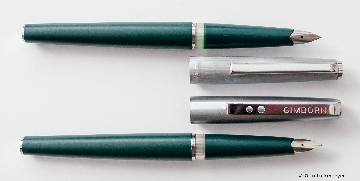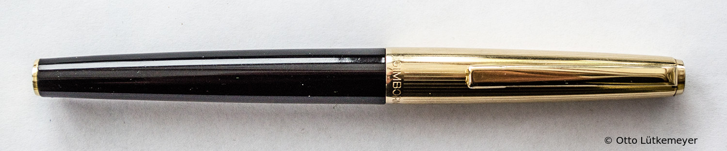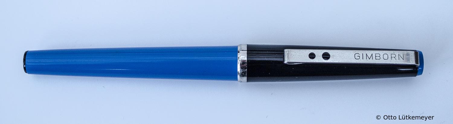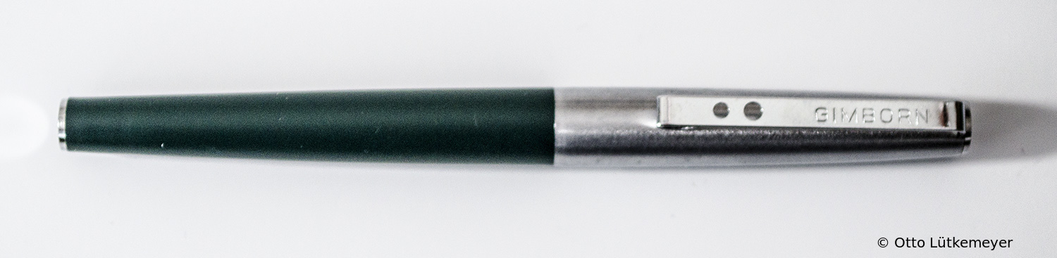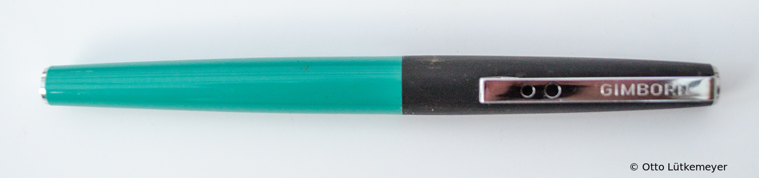 The Gimborn 150 fountain pen was almost identical to the model Pelikan 300. Only the clip and the missing cap logo were different from the Pelikan version. The name Gimborn is found on the nib. A mechanical pencil was offered, too; this was the Gimborn 175 (design of the Pelikan 350). About 5 years later the black model was extended by three additional color varieties and other models.